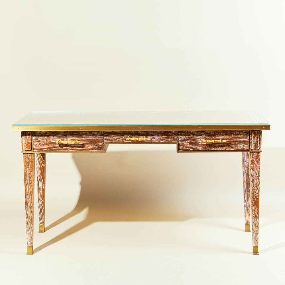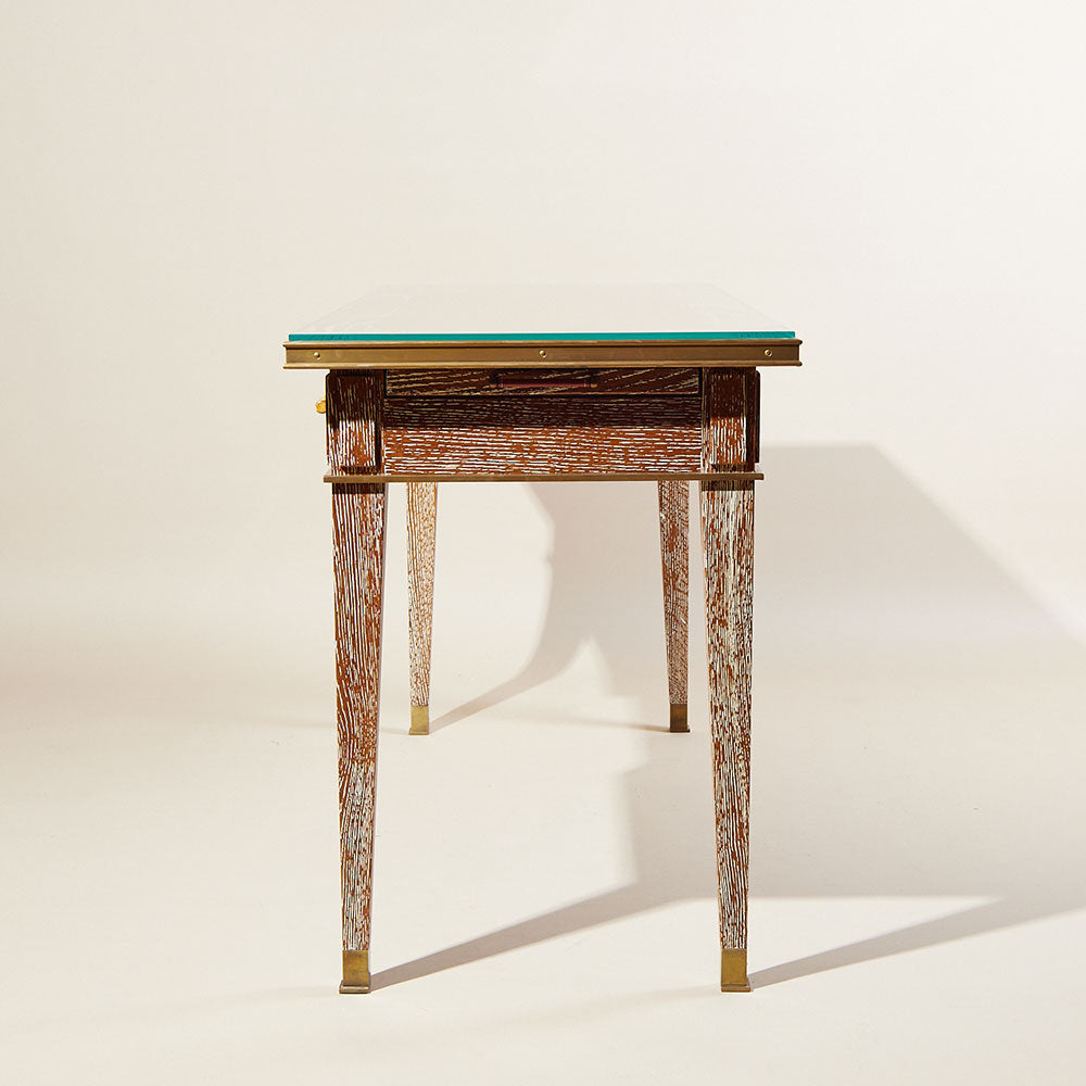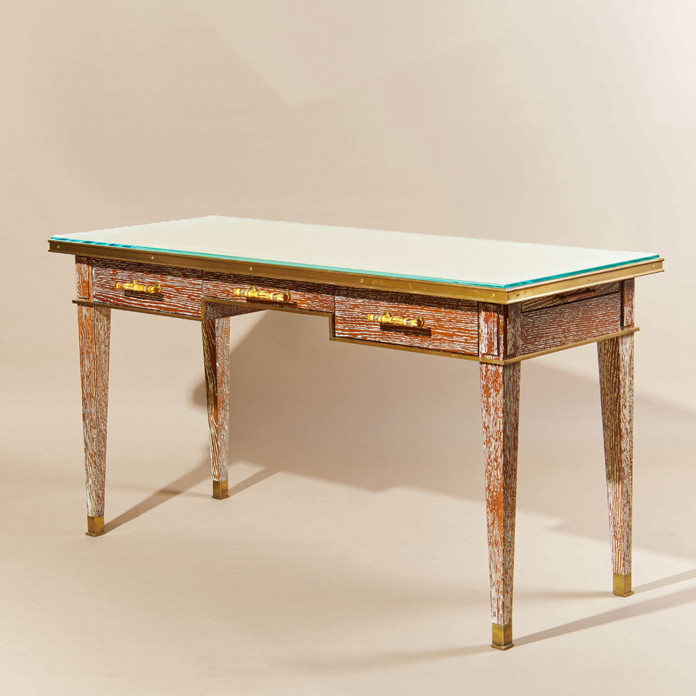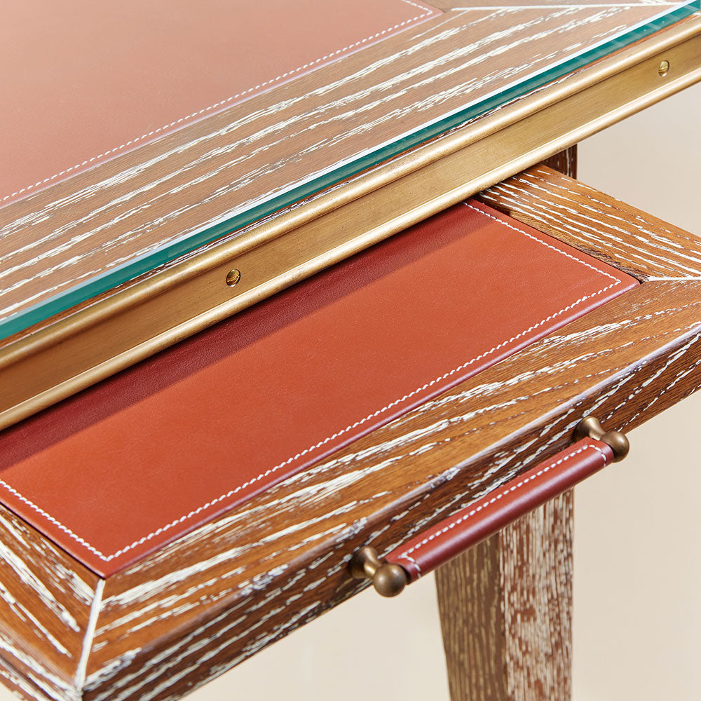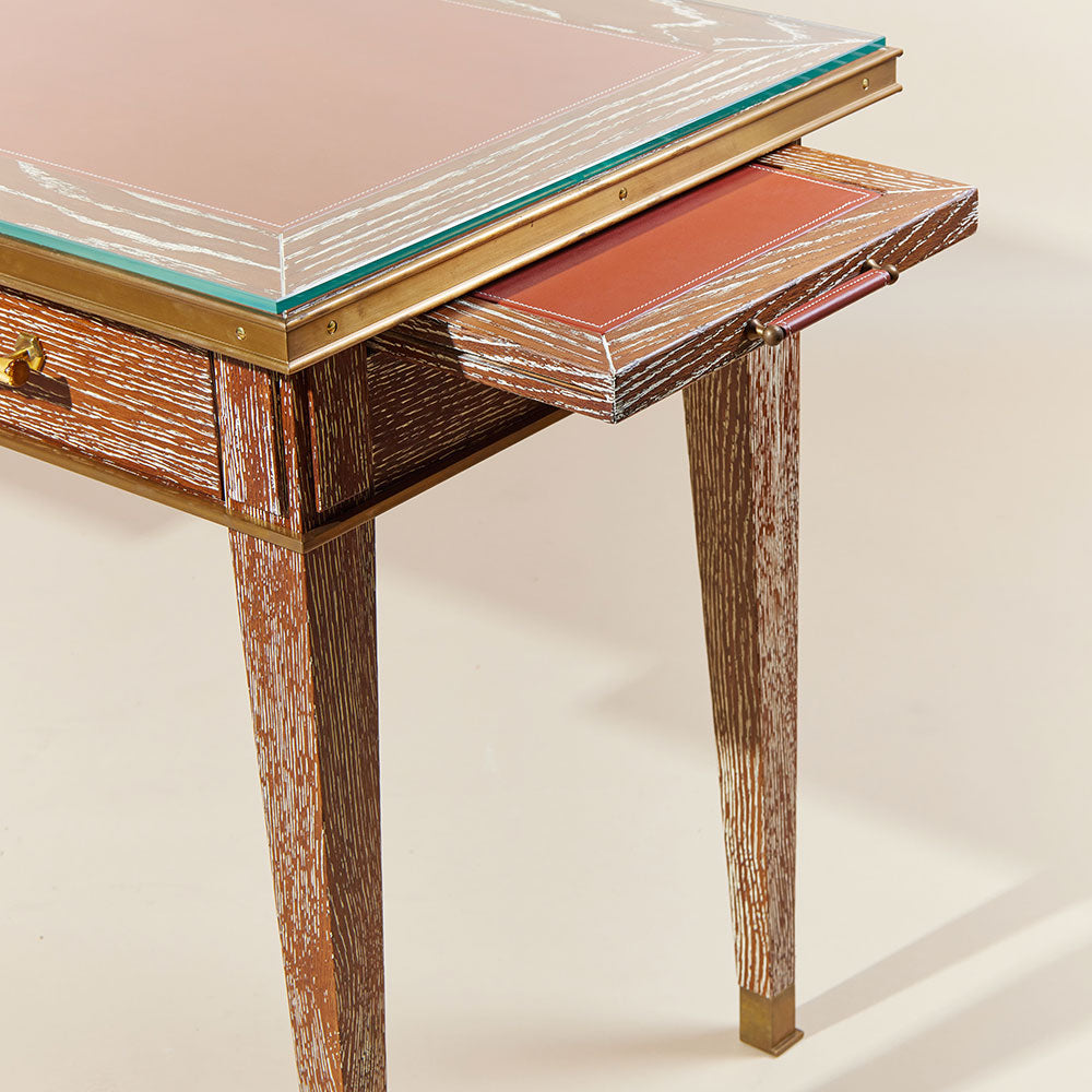 Rich in details and as minute as the city that gives it its name, this desk exists in two versions: with pickled oak frame or black lacquered wood. In both, the top is in red leather, a surface that creates a chromatic and material contrast with the rest of the piece.