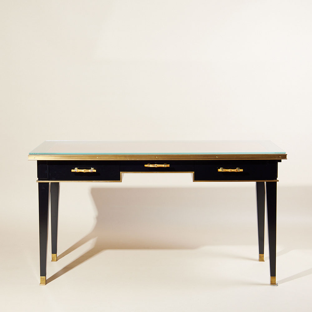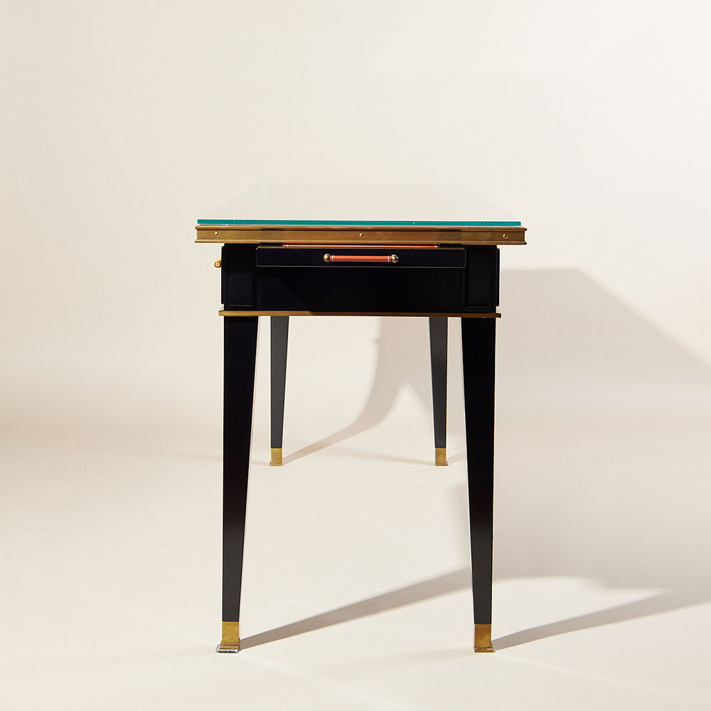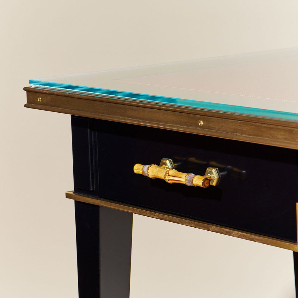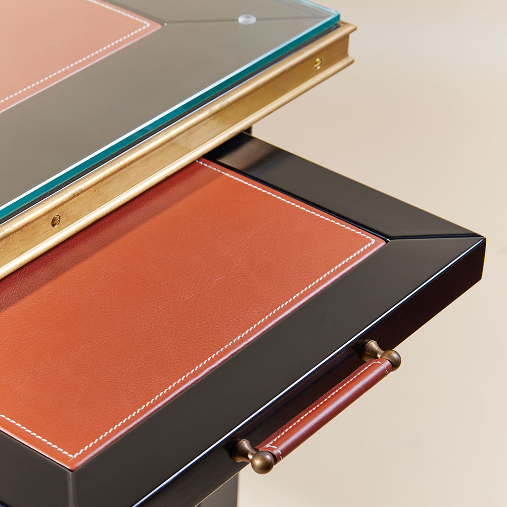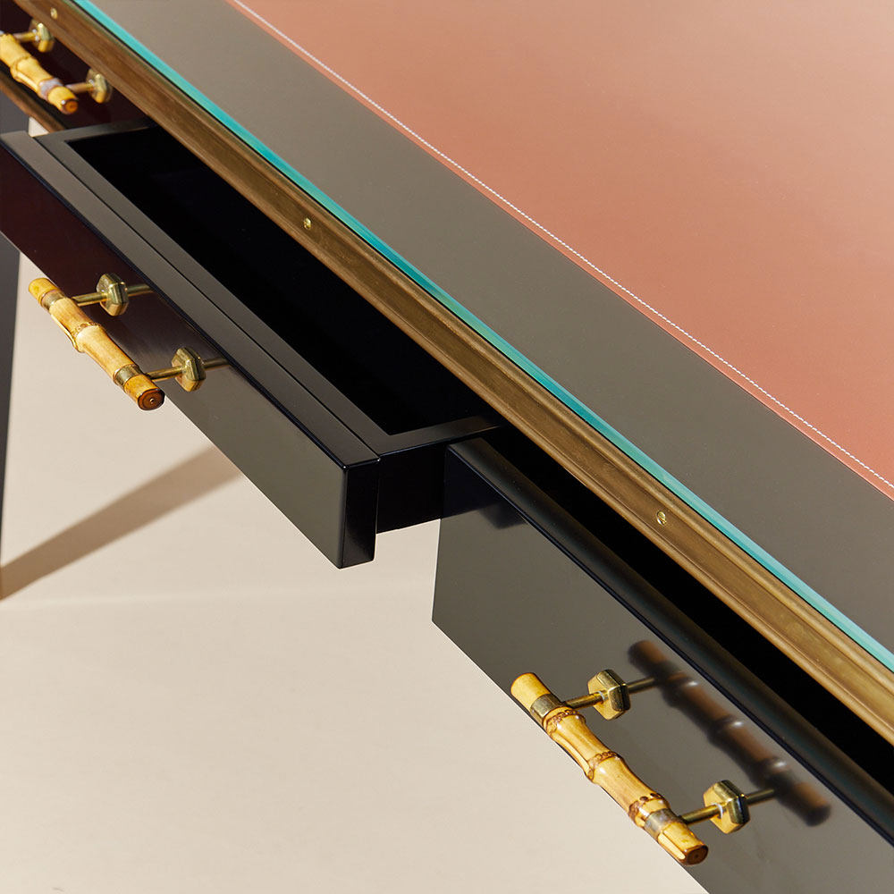 Rich in details and as minute as the city that gives it its name, this desk exists in two versions: with pickled oak frame or black lacquered wood. In both, the top is in red leather, a surface that creates a chromatic and material contrast with the rest of the piece.