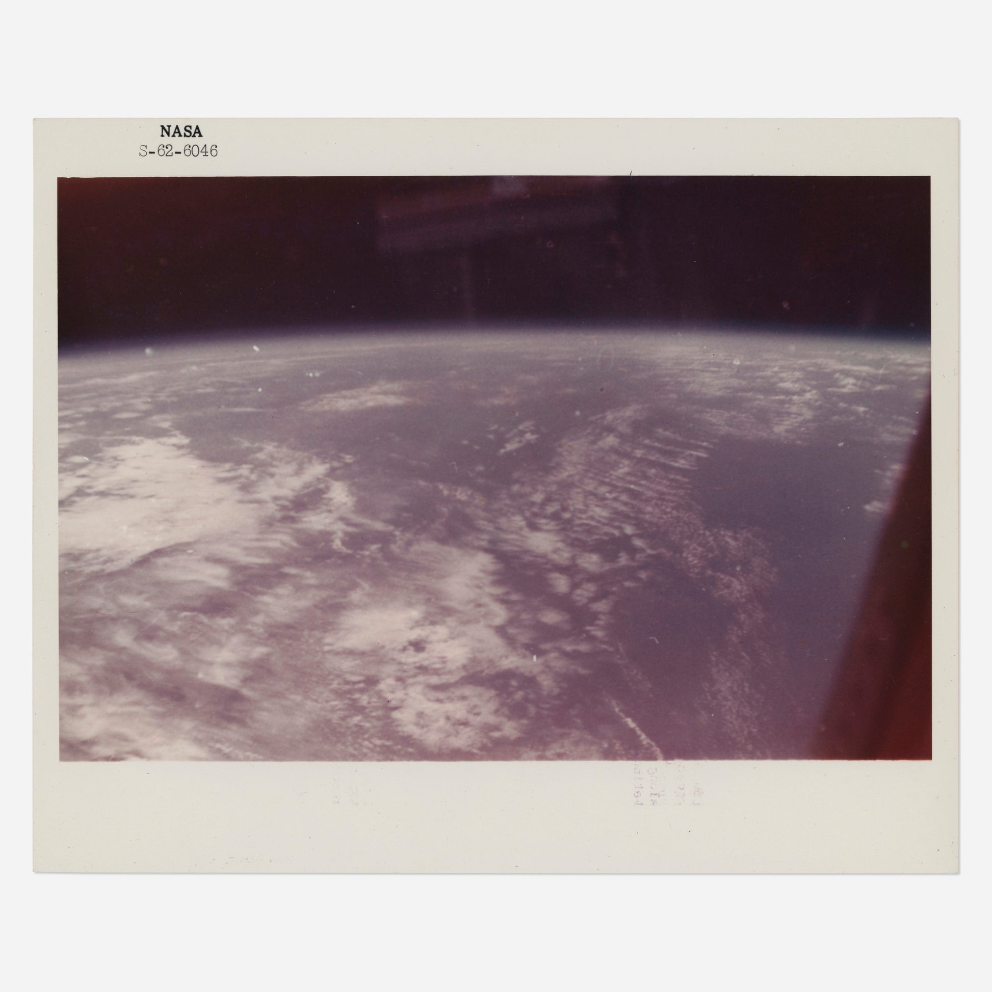 One of the first and extremely rare photographs captured by John Glenn in full color from Friendship 7, the first manned American spacecraft to orbit the Earth. John Glenn was the first human being to carry a still camera into space. On 20 February 1962, John Glenn became the first American to circle the Earth making three orbits in his Friendship 7 Mercury spacecraft. He also became the first human being to photograph Earth from space using a hand-held 35mm Ansco Autoset (modified Minolta) camera and Eastman Color Negative Film 5250. The malfunction of his spacecraft’s automatic control system during the second orbit limited Glenn’s opportunities to make use of his camera. Nevertheless, he did manage to document his time in space and snapped this view looking northwest of the cloud-covered Atlantic Ocean on the third orbit of Friendship 7. Over the Atlantic on the third orbit, Glenn photographed an overcast region to the northwest and patterns of scattered clouds in the foreground. (Friendship 7 Pilot’s Flight Report, pg. 127).
