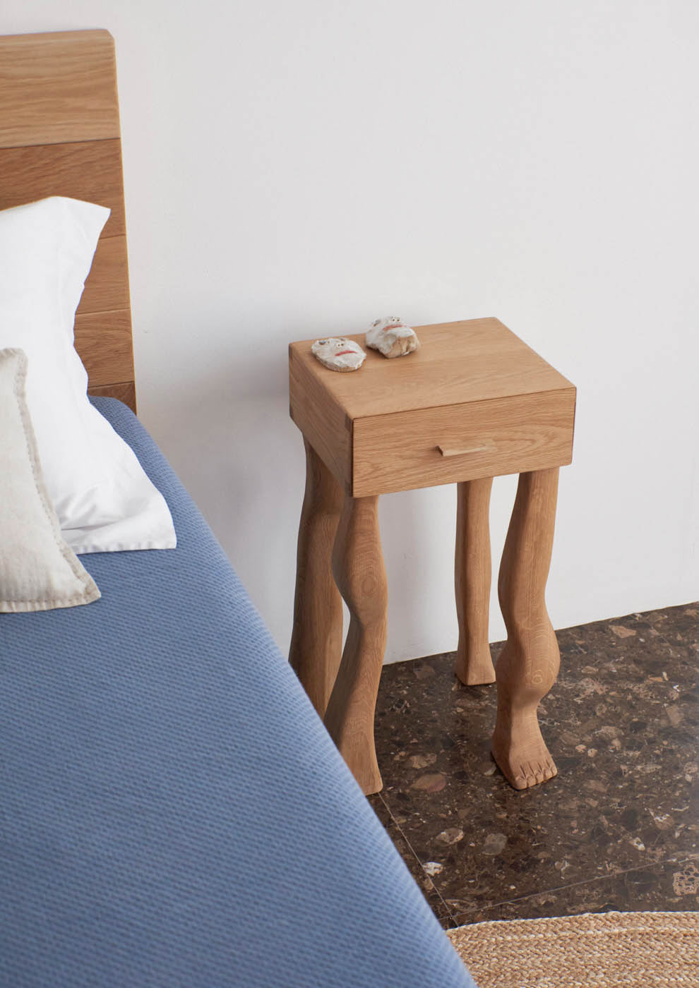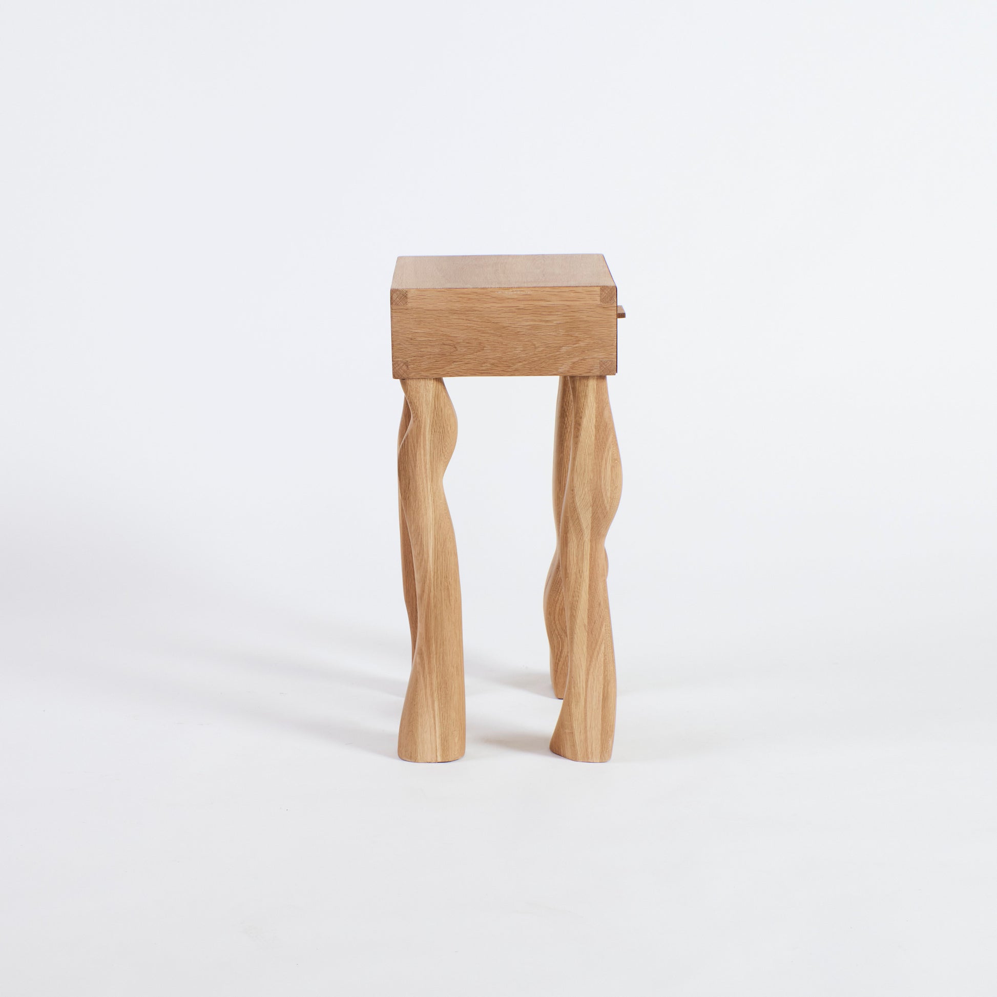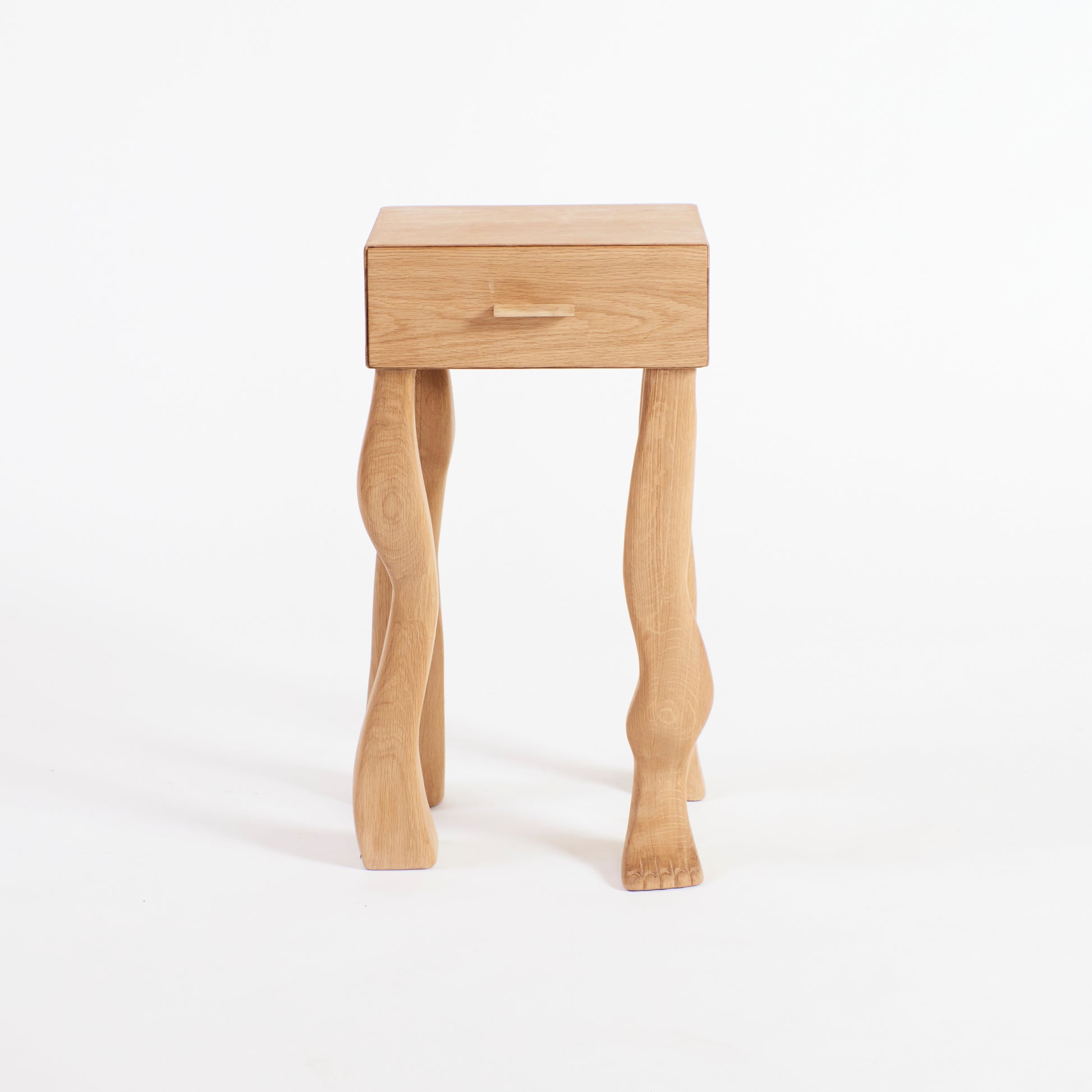The Foot Side Table, designed by Project 213A in 2023, is made from Walnut wood with carefully designed jointing details. The drawer stands on 4 irregular legs of which one has a foot.