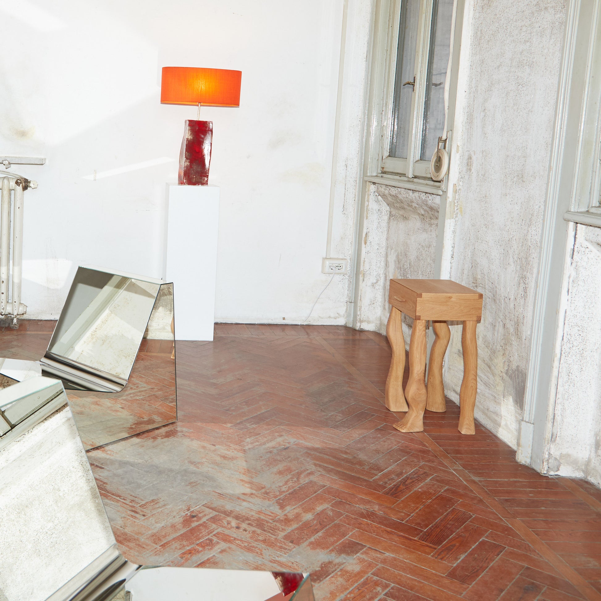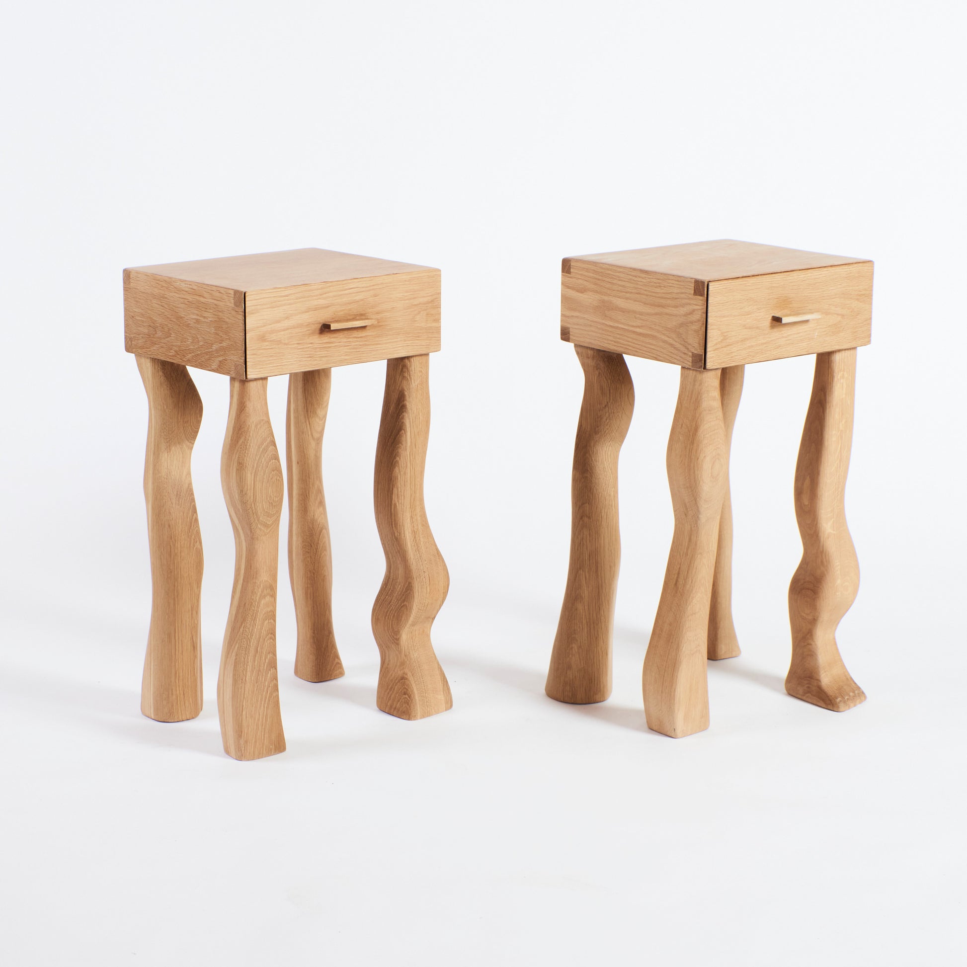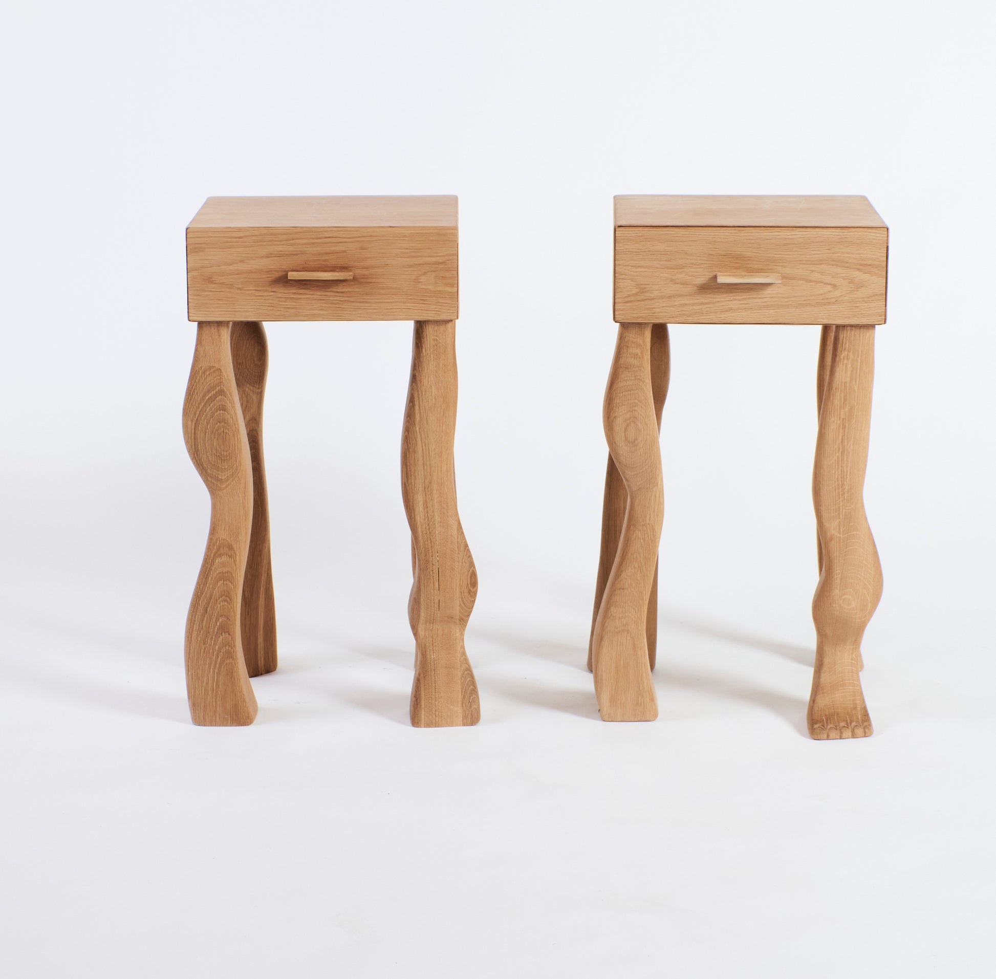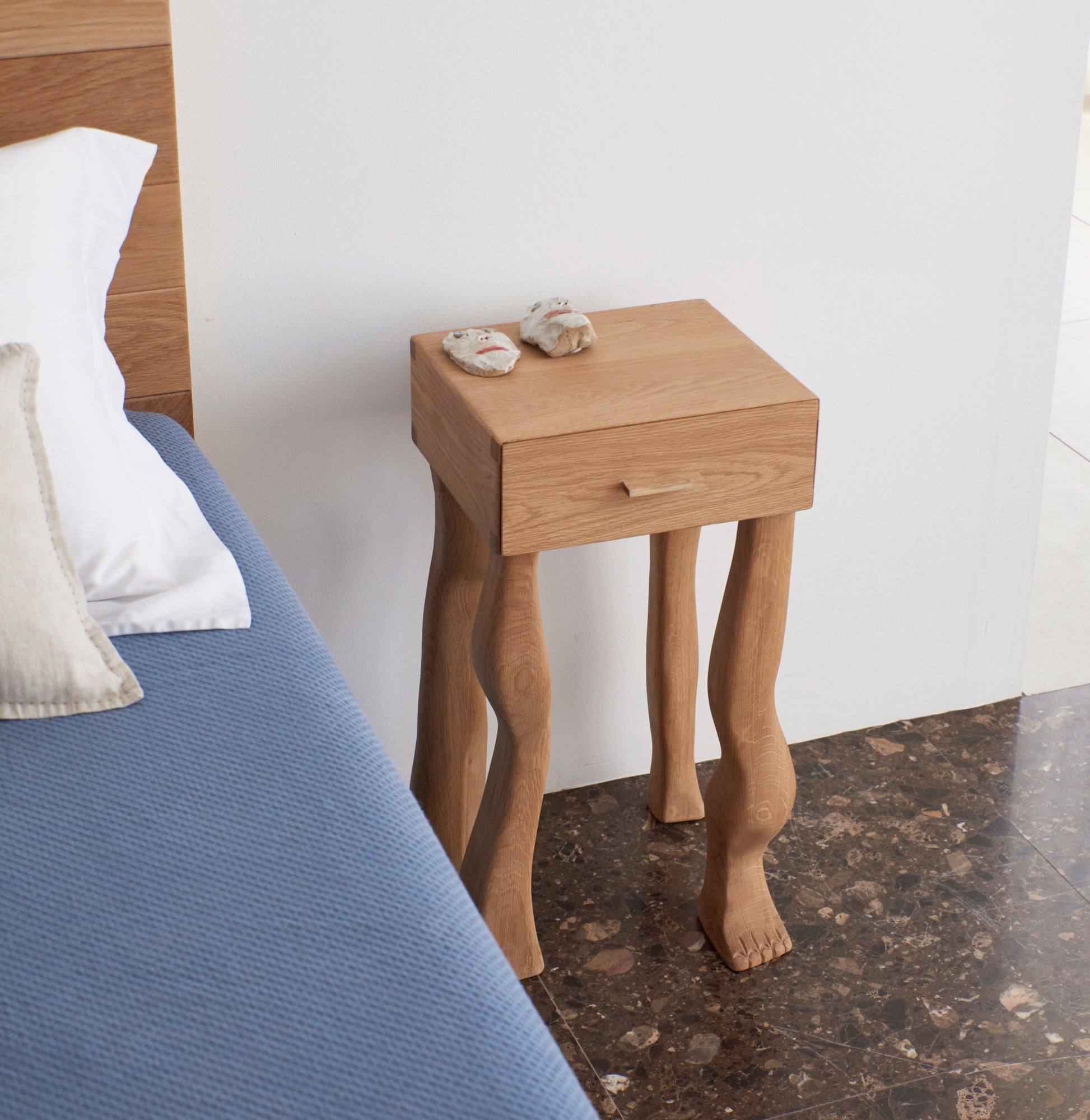 The Foot Side Table, designed by Project 213A in 2023, is made from Walnut wood with carefully designed jointing details. The drawer stands on 4 irregular legs of which one has a foot.