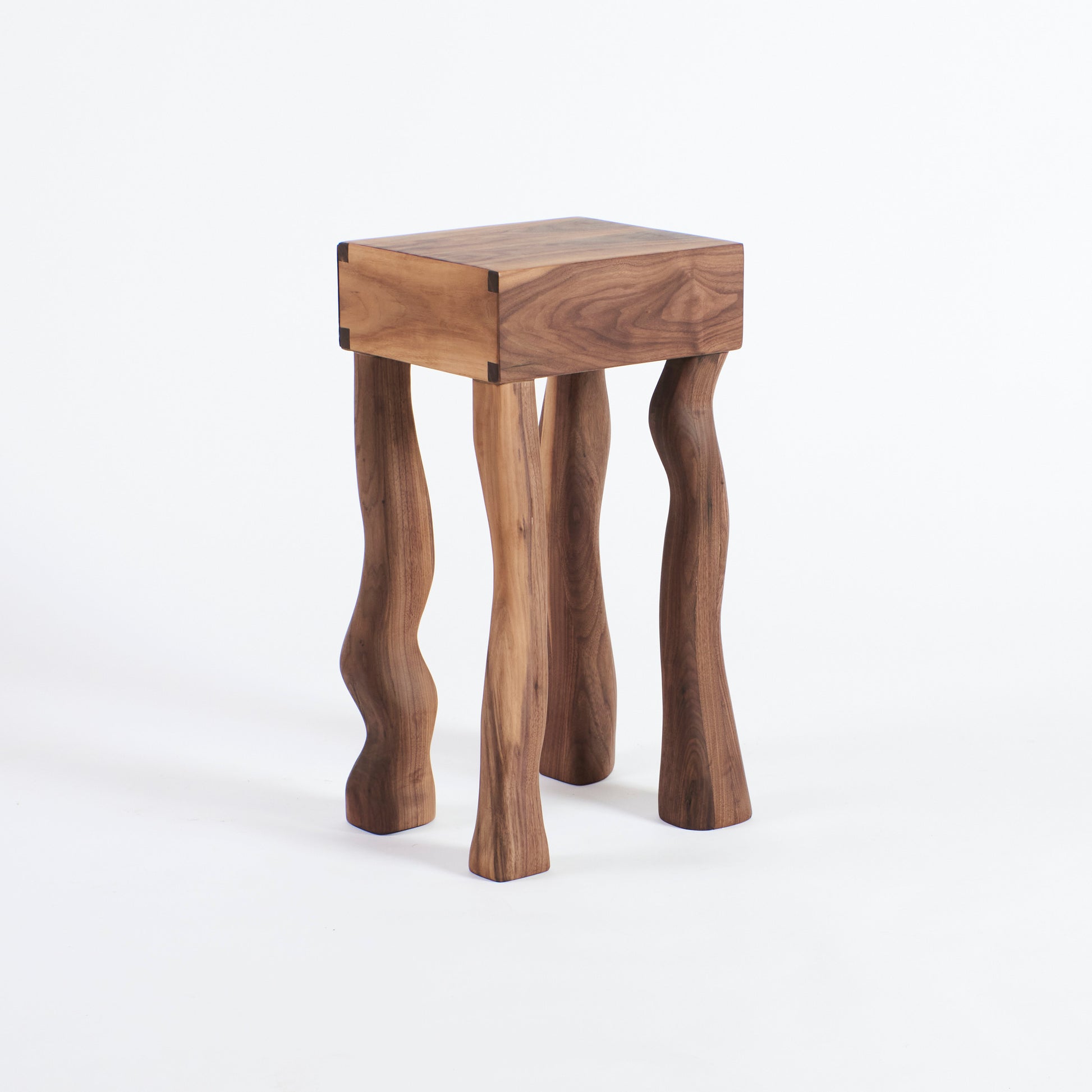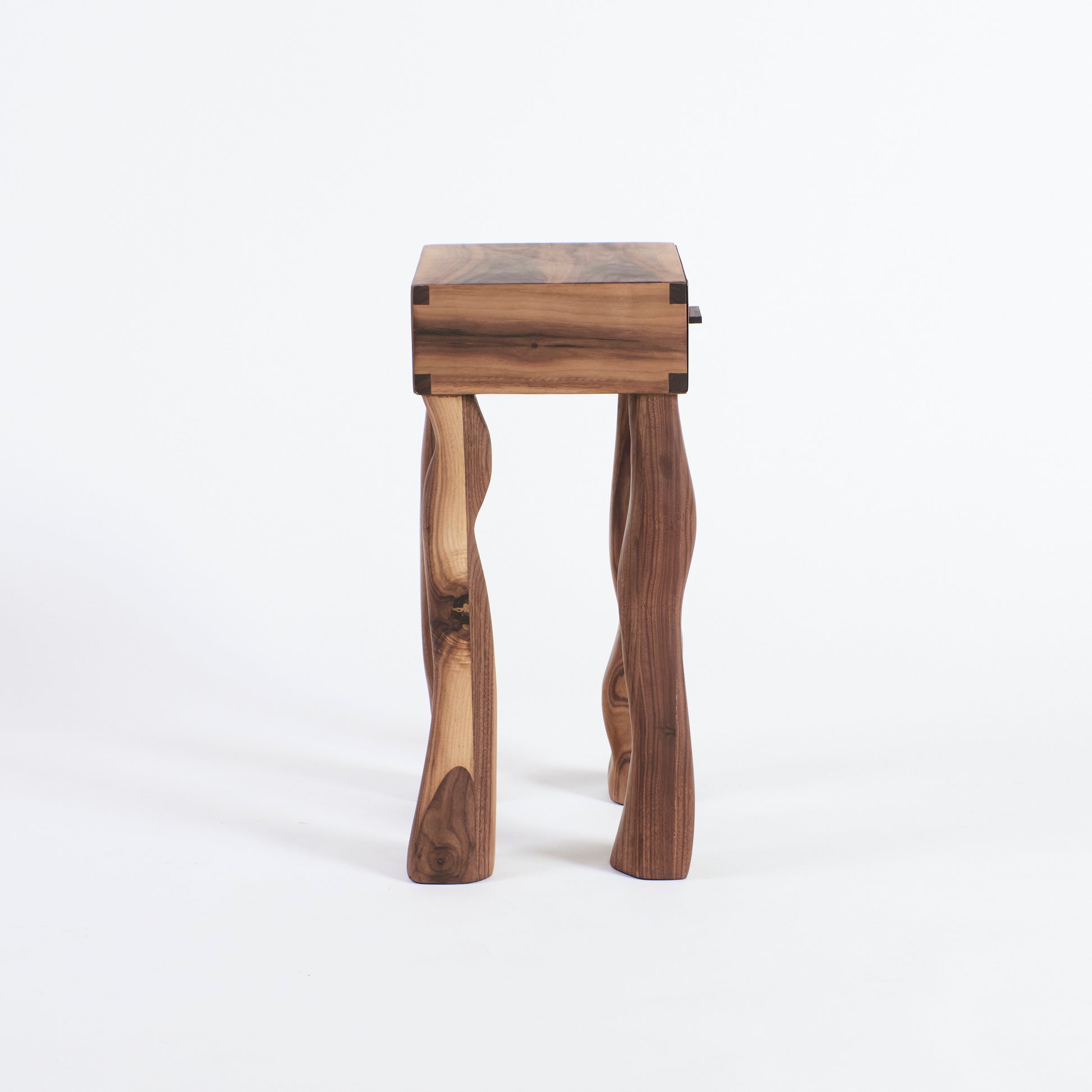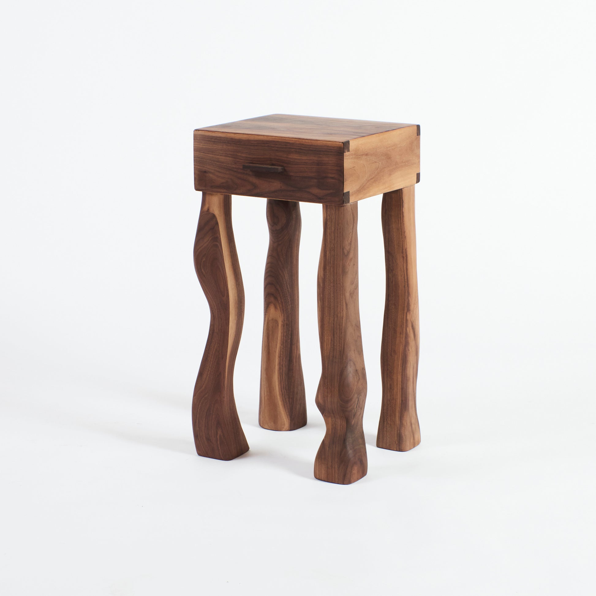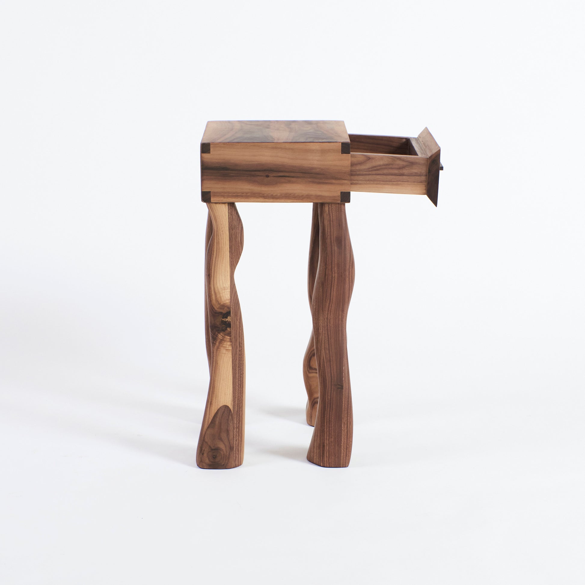 The Foot Side Table, designed by Project 213A in 2023, is made from Walnut wood with carefully designed jointing details. The drawer stands on 4 irregular legs of which one has a foot.