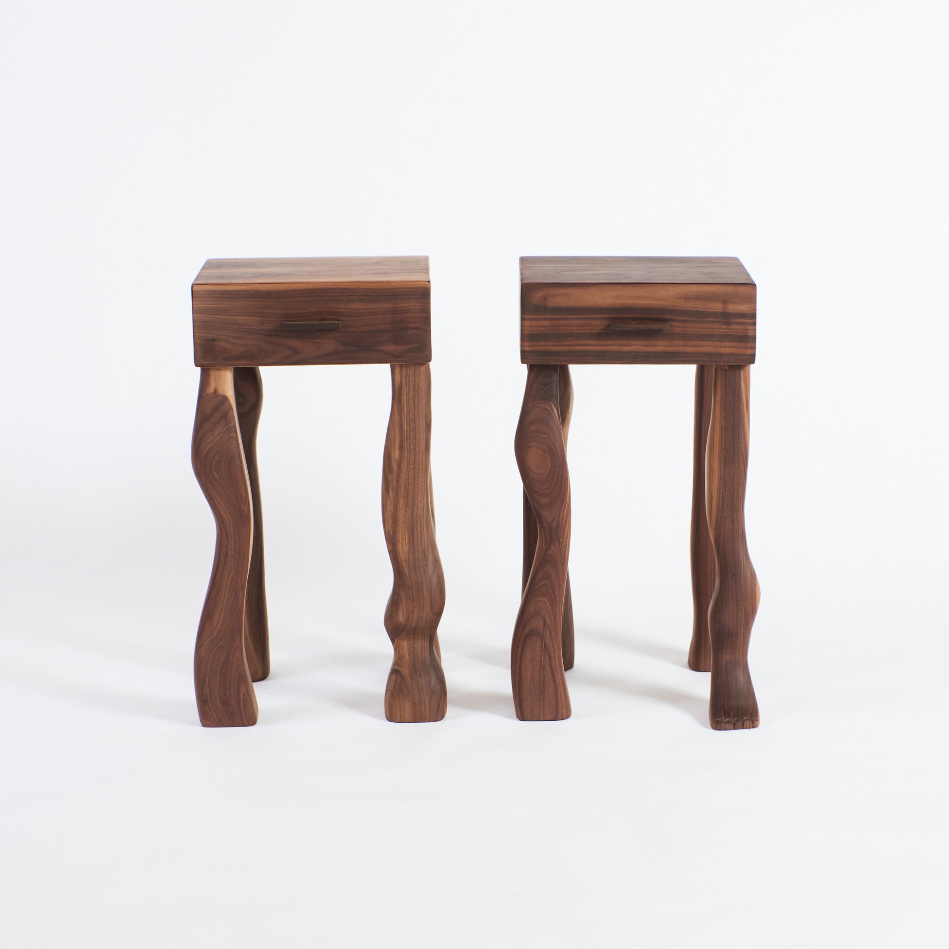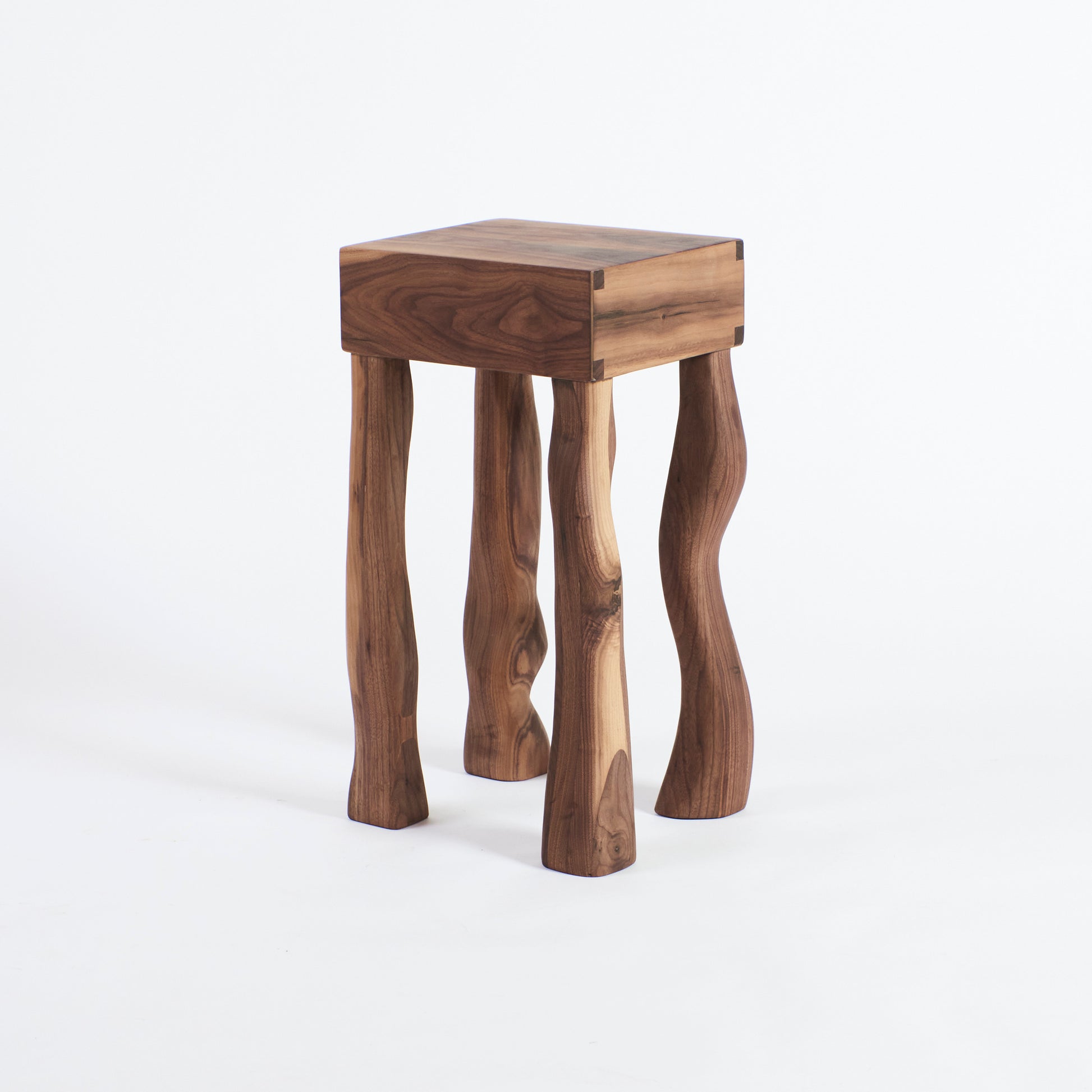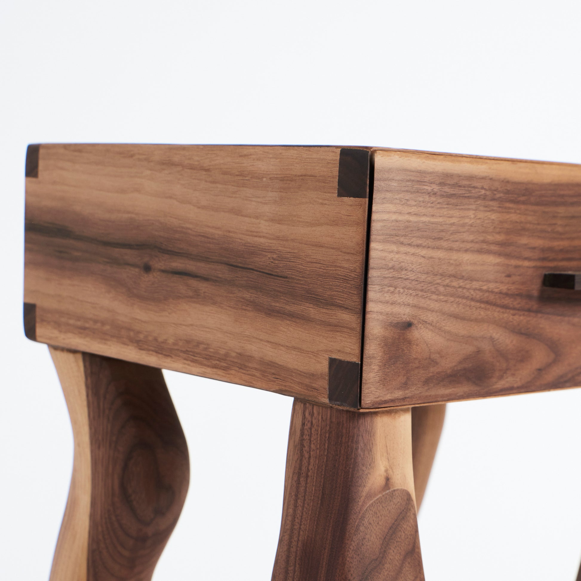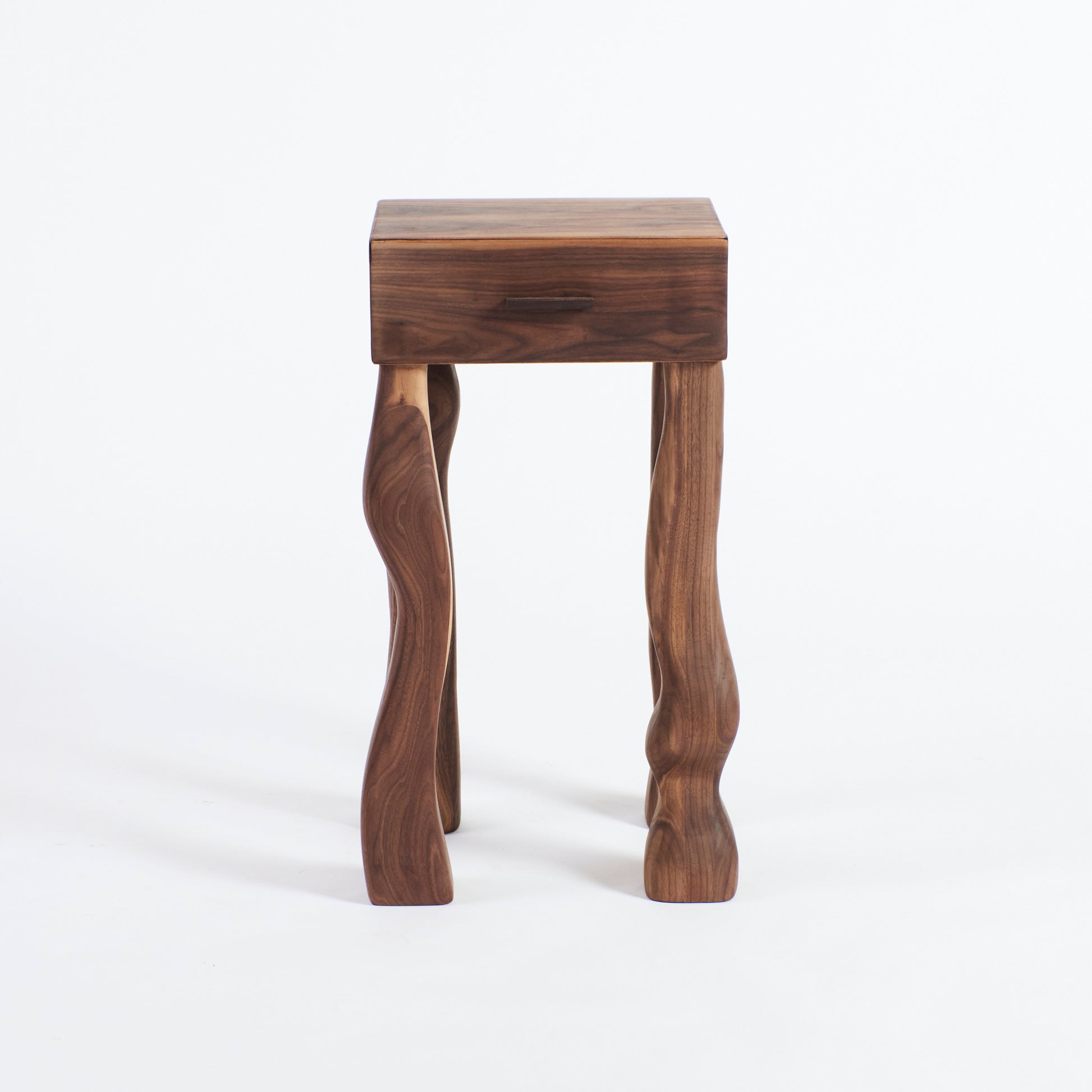 The Foot Side Table, designed by Project 213A in 2023, is made from Walnut wood with carefully designed jointing details. The drawer stands on 4 irregular legs of which one has a foot.