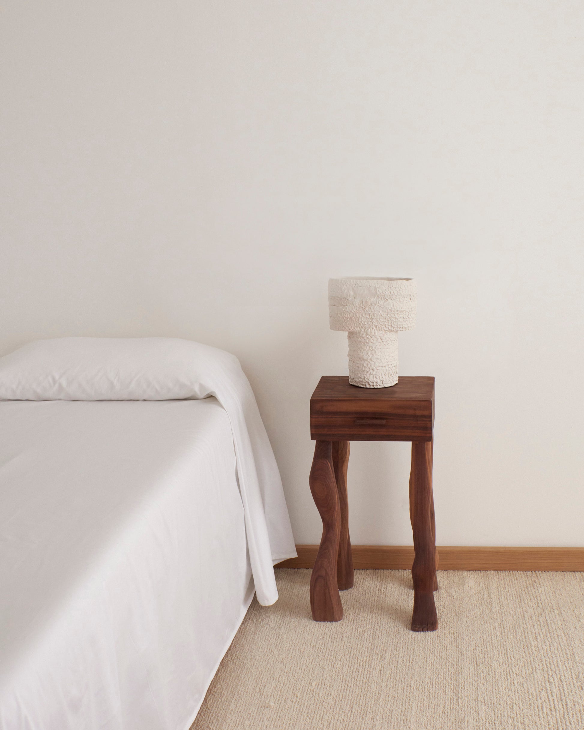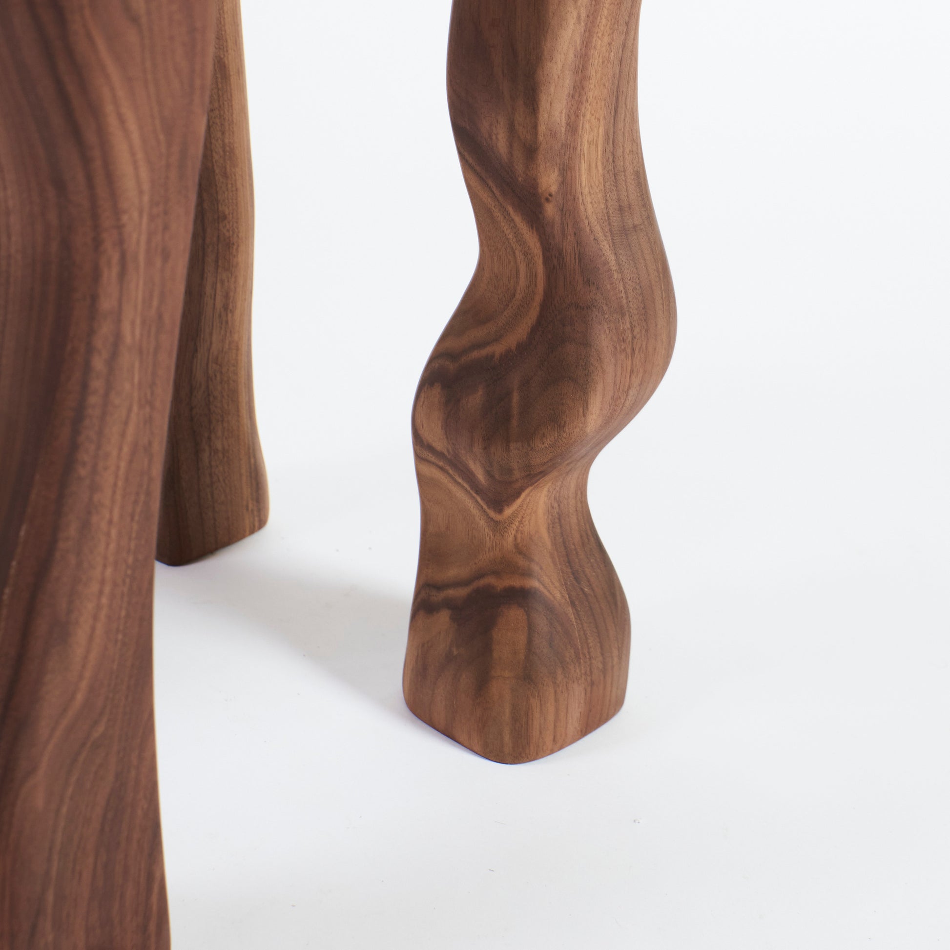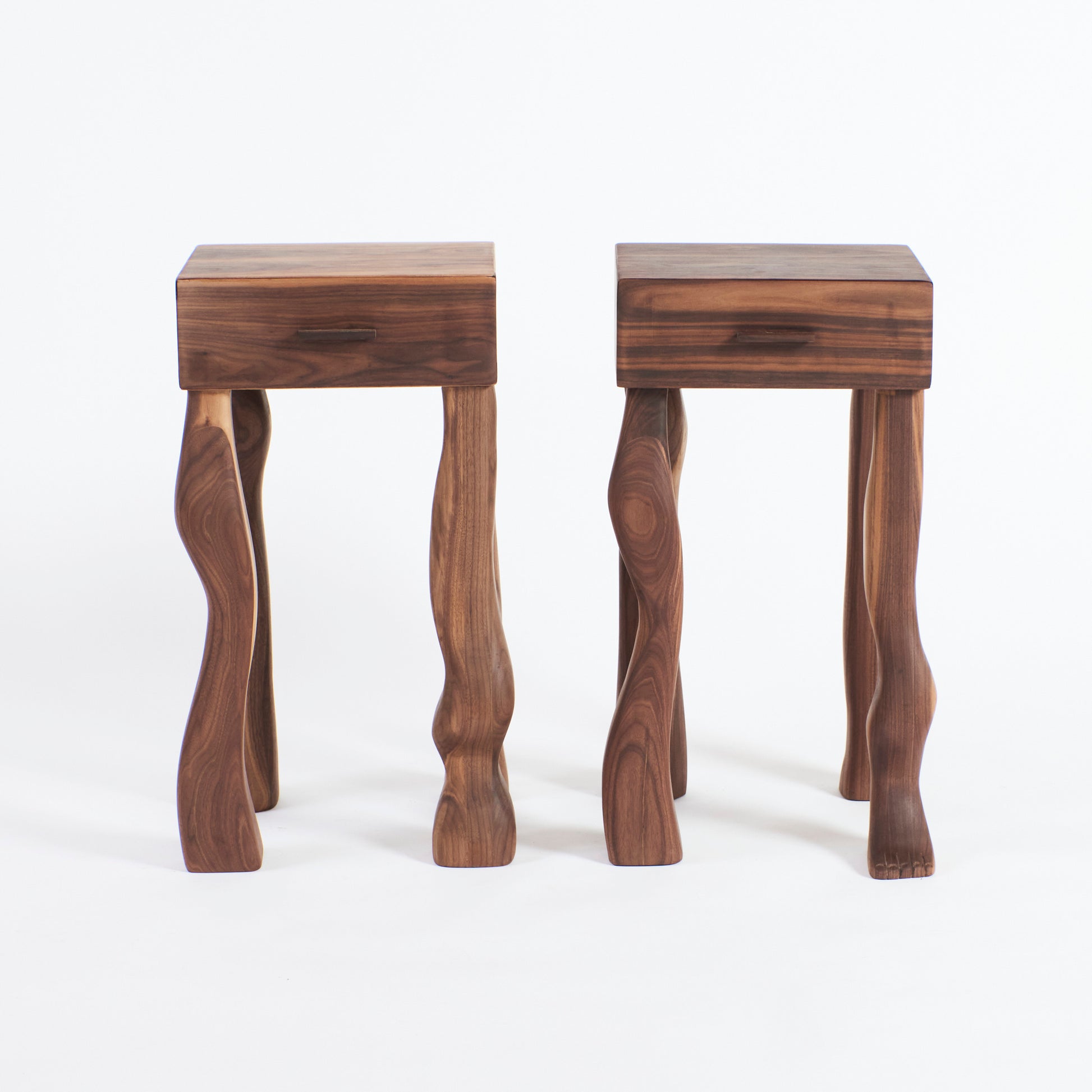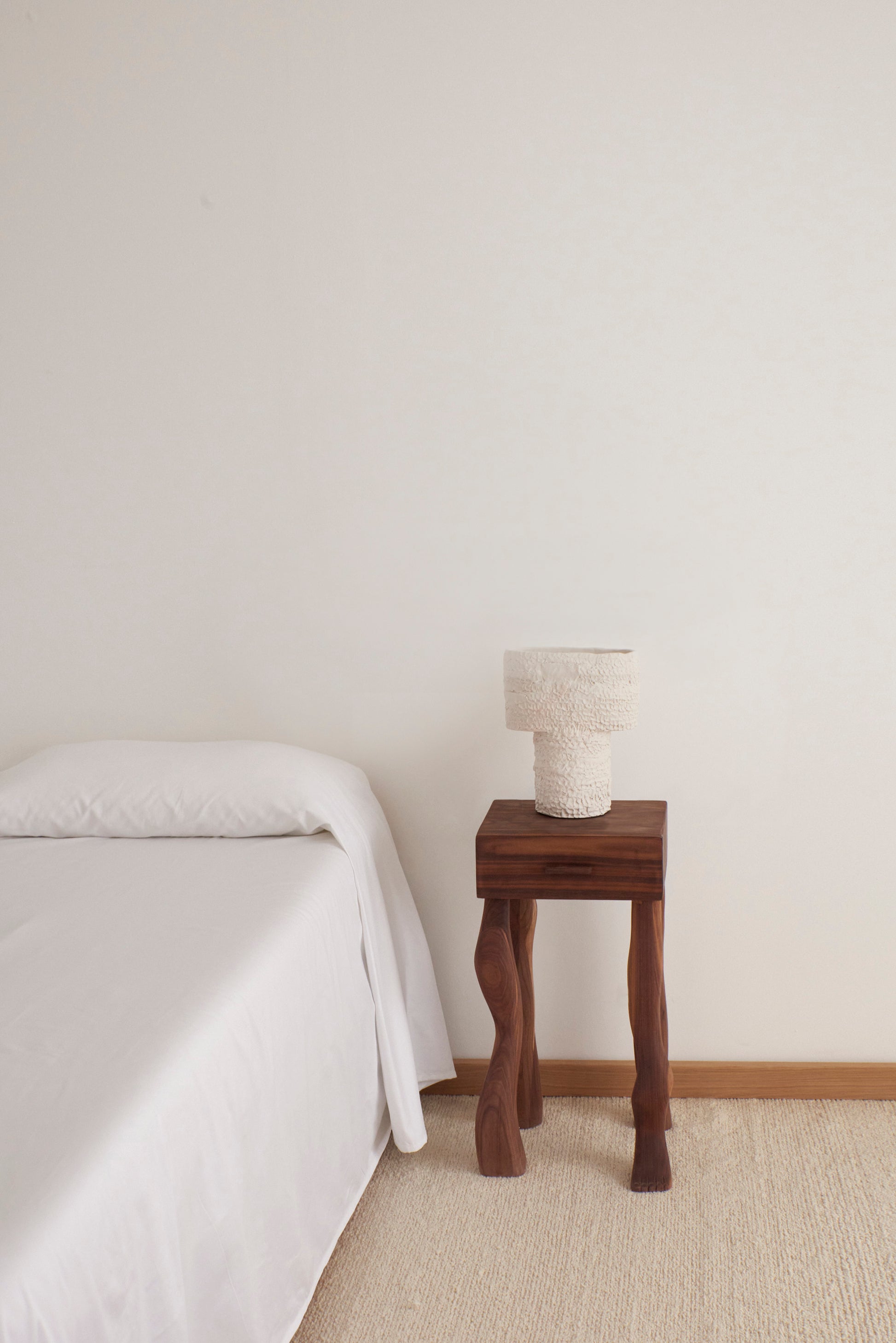 The Foot Side Table, designed by Project 213A in 2023, is made from Walnut wood with carefully designed jointing details. The drawer stands on 4 irregular legs of which one has a foot.