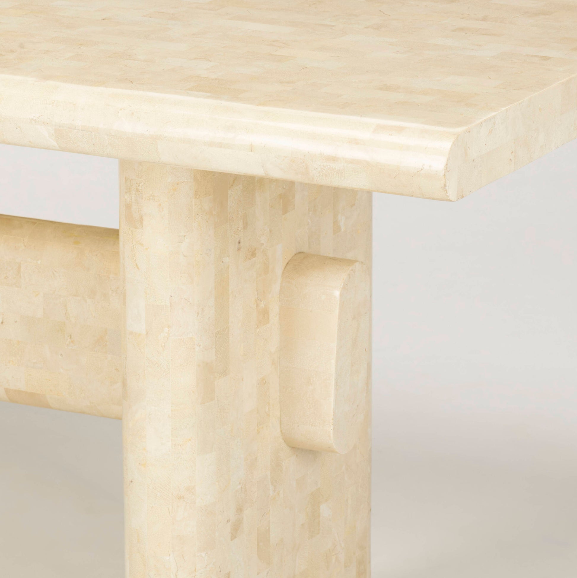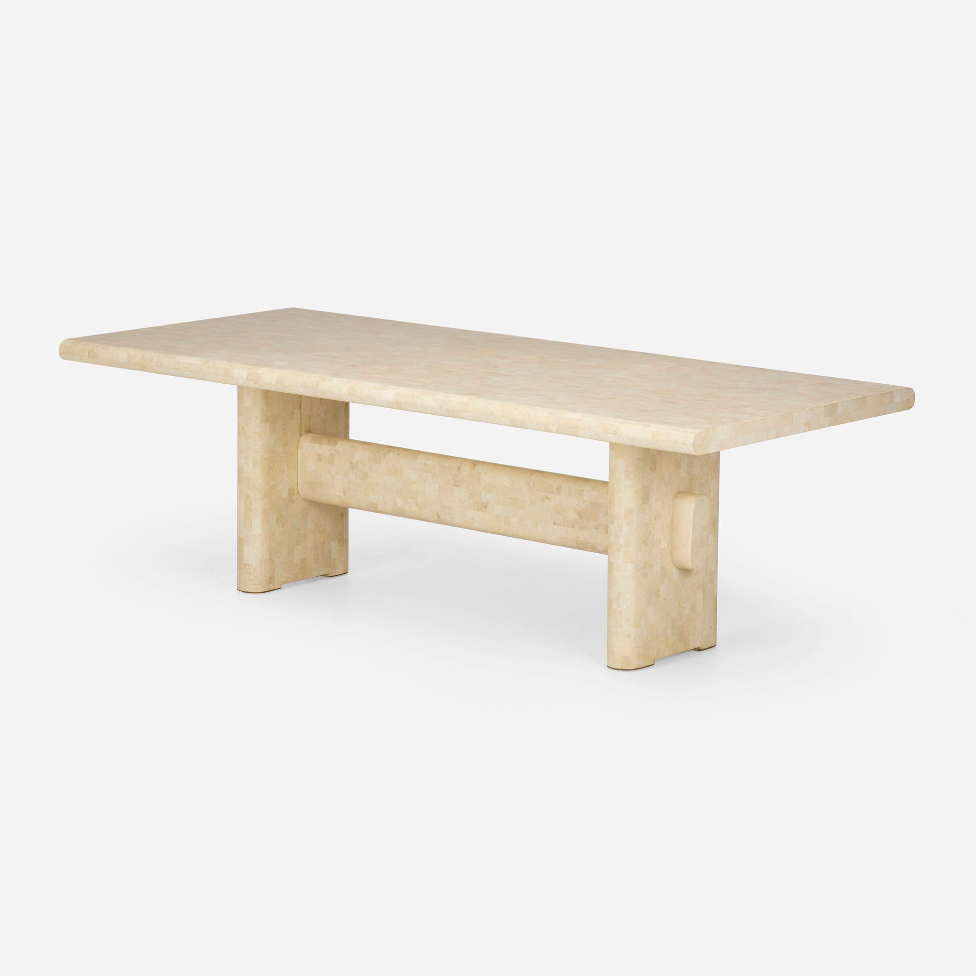 This beautiful Springer dining table is made of fossil stones inlaid over a wood frame. The stones create a very cool, smooth, shiny finish with the color variation and texture of each is extraordinary.