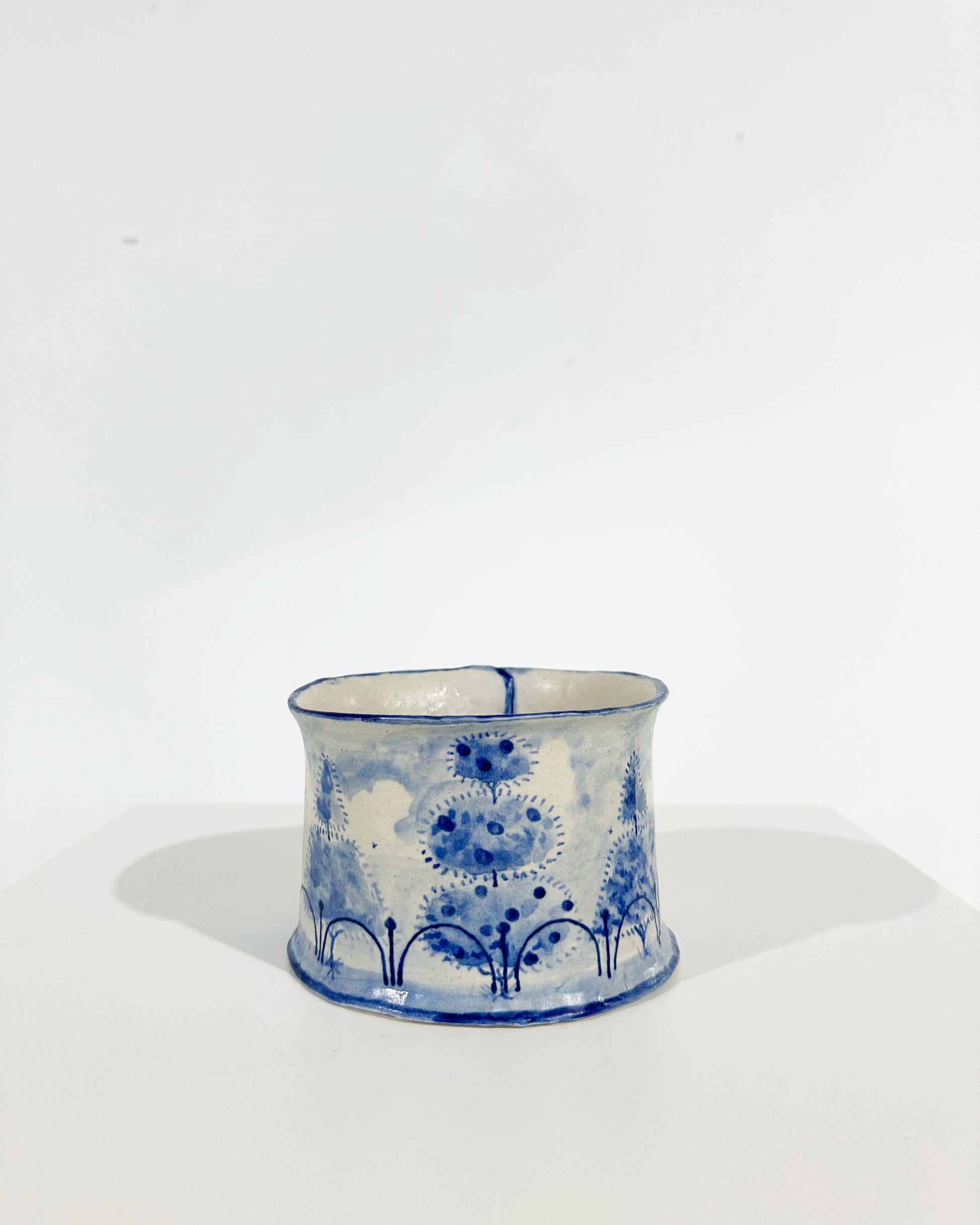 The Country Gentleman Collection by artist Maggie Robertson is a beautiful series of one-of-a-kind stoneware vessels. Each unique piece embraces the seams and irregularities of her hand-built technique complemented by intricate, hand-painted scenes of the English countryside in classic blue and white. The vessels are water tight and food safe, microwaveable and dishwasher safe; however, as they are art pieces and fragile, we would recommend hand washing.