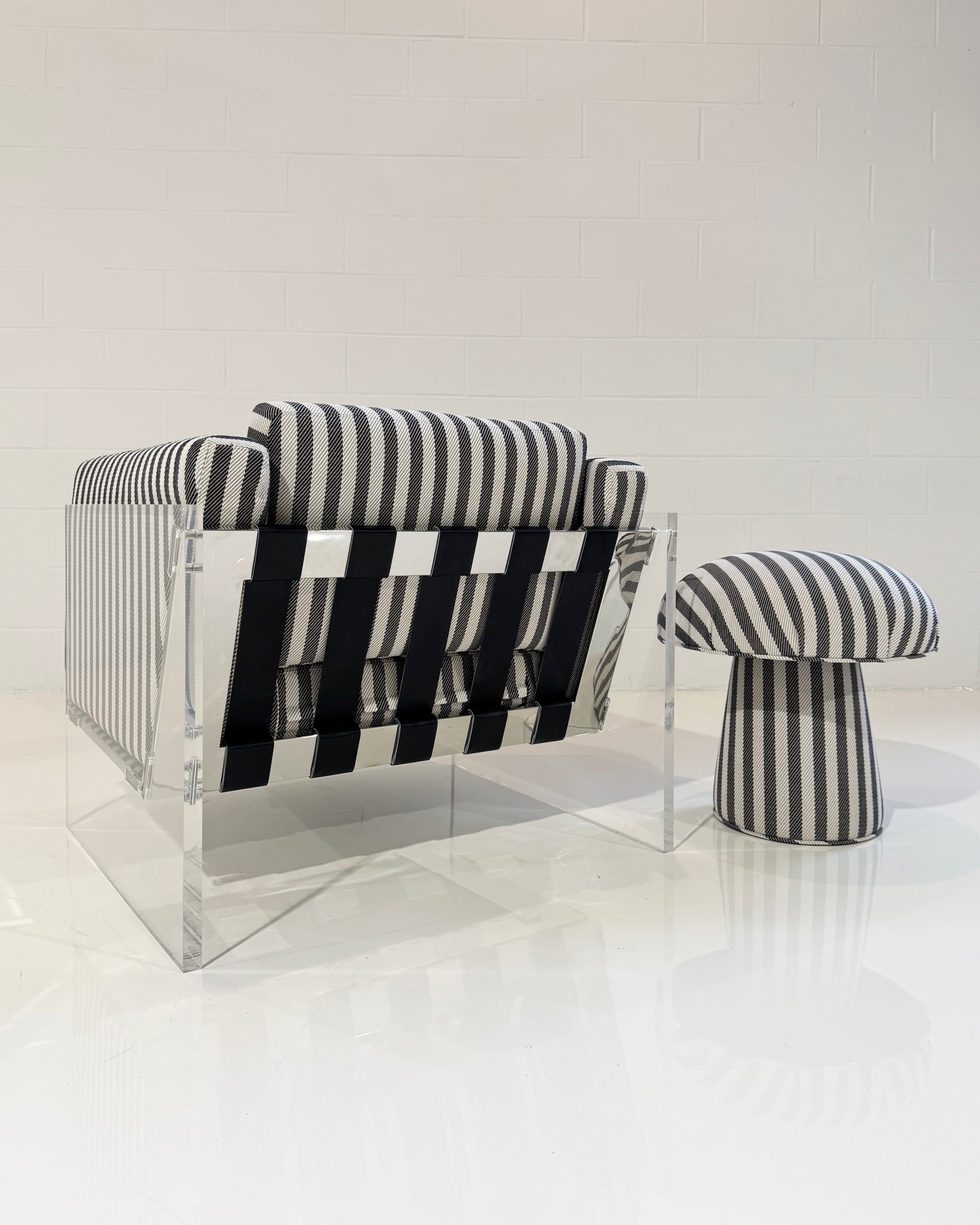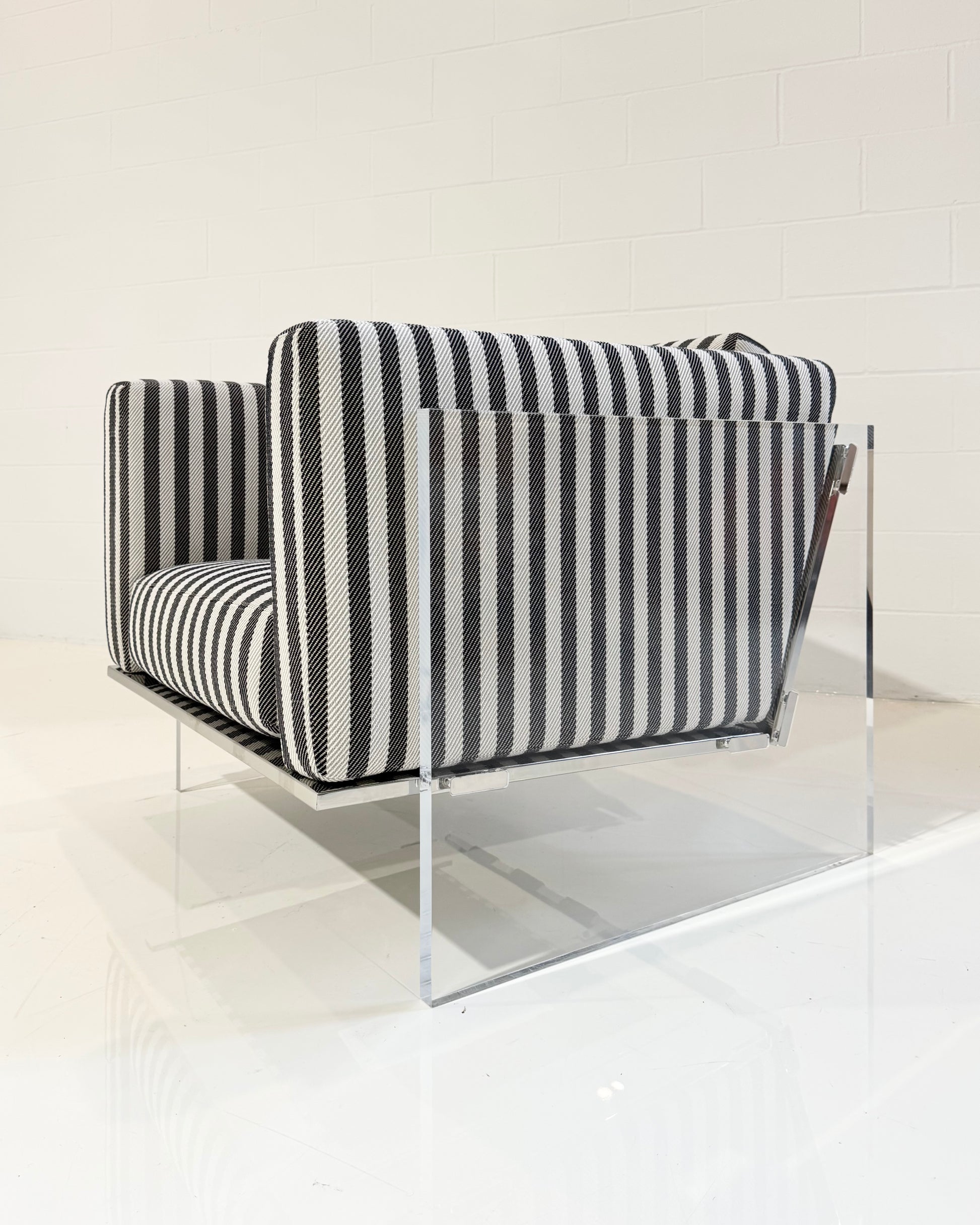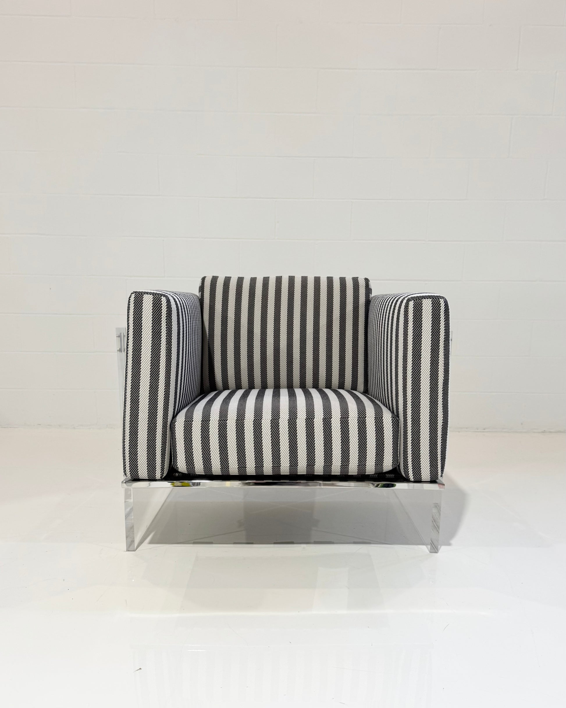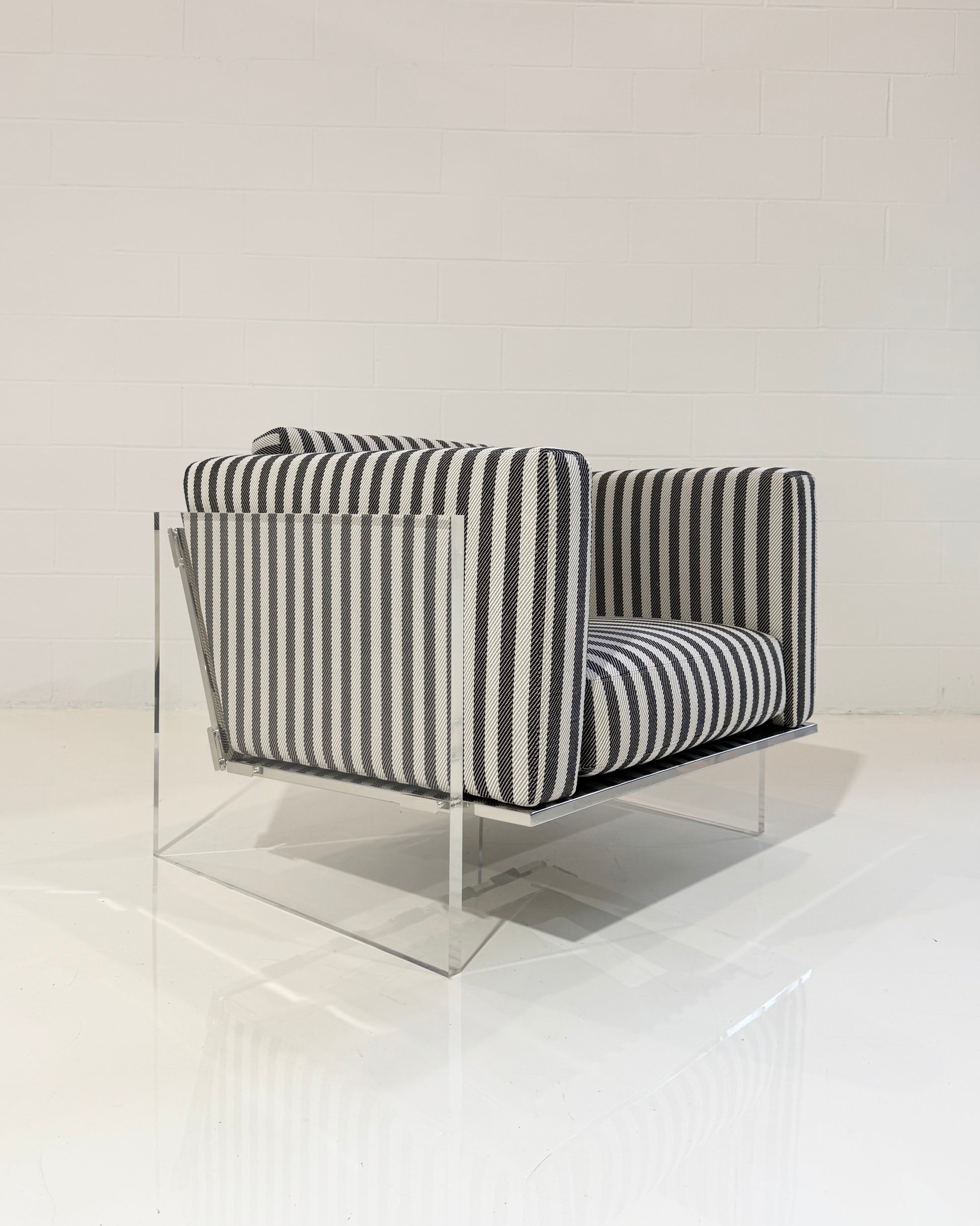 Originally designed in 1969 by Baughman, the Get Smart Lounge seemingly floats on air. Striking from all angles, the Get Smart features clear acrylic arm panels, stainless steel rails and black leather strapping standard. A companion sofa and studio sofa are also available. Select from our many fabrics or leathers or provide COM.
