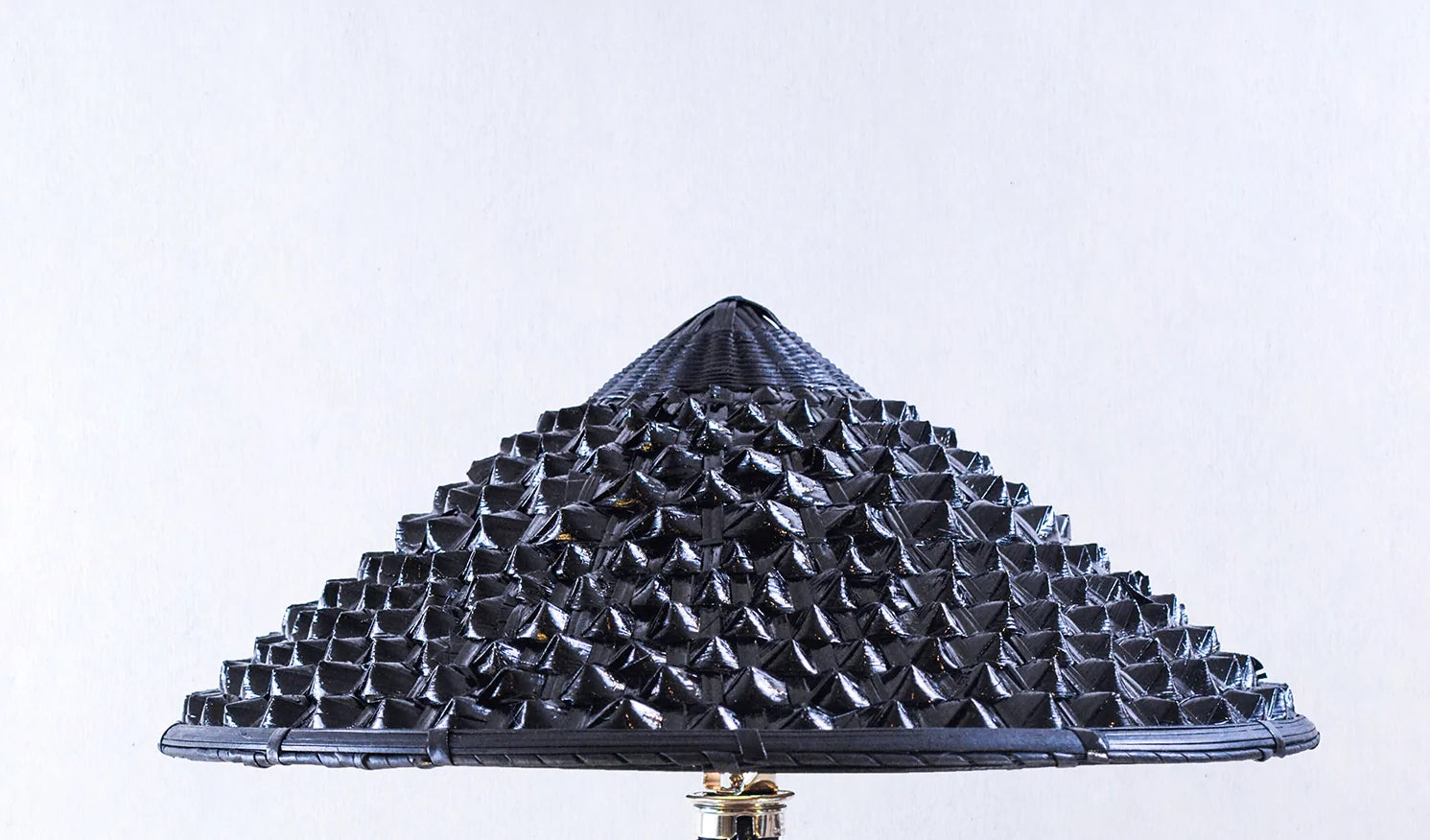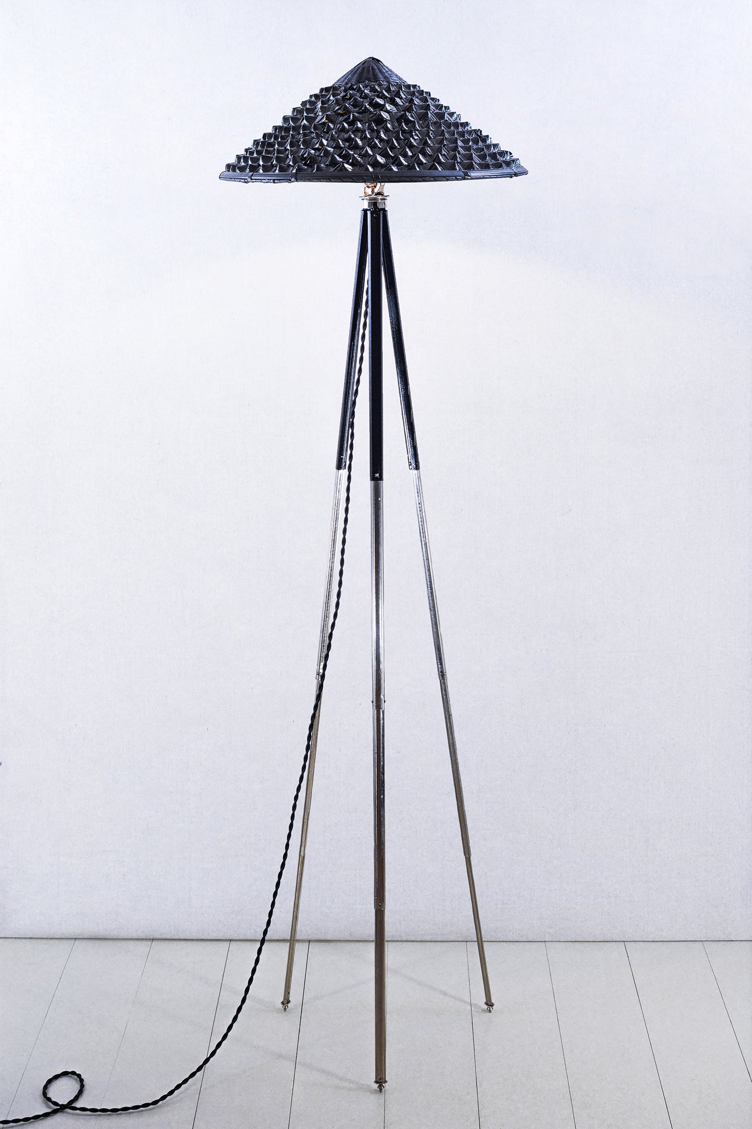 Model No. 008 features a hand-painted woven-grass shade atop an upcycled vintage black-and-chrome German-made camera tripod, fabric-covered cord, brass fittings, and 40w LED bulb.