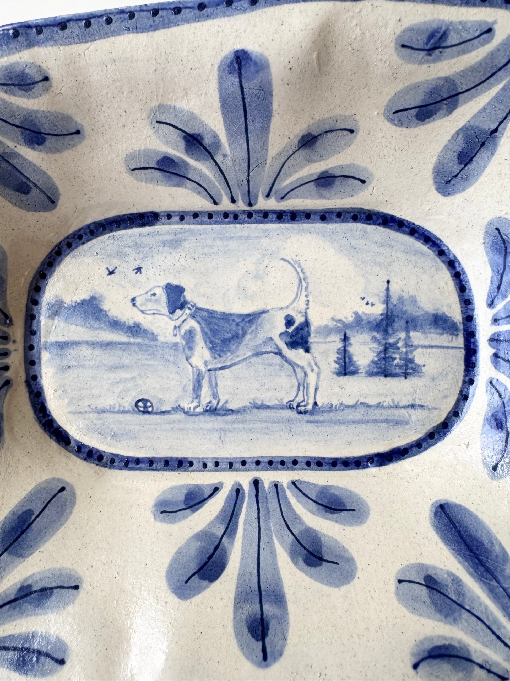 The Country Gentleman Collection by artist Maggie Robertson is a beautiful series of one-of-a-kind stoneware vessels. Each unique piece embraces the seams and irregularities of her hand-built technique complemented by intricate, hand-painted scenes of the English countryside in classic blue and white. The vessels are water tight and food safe, microwaveable and dishwasher safe; however, as they are art pieces and fragile, we would recommend hand washing.