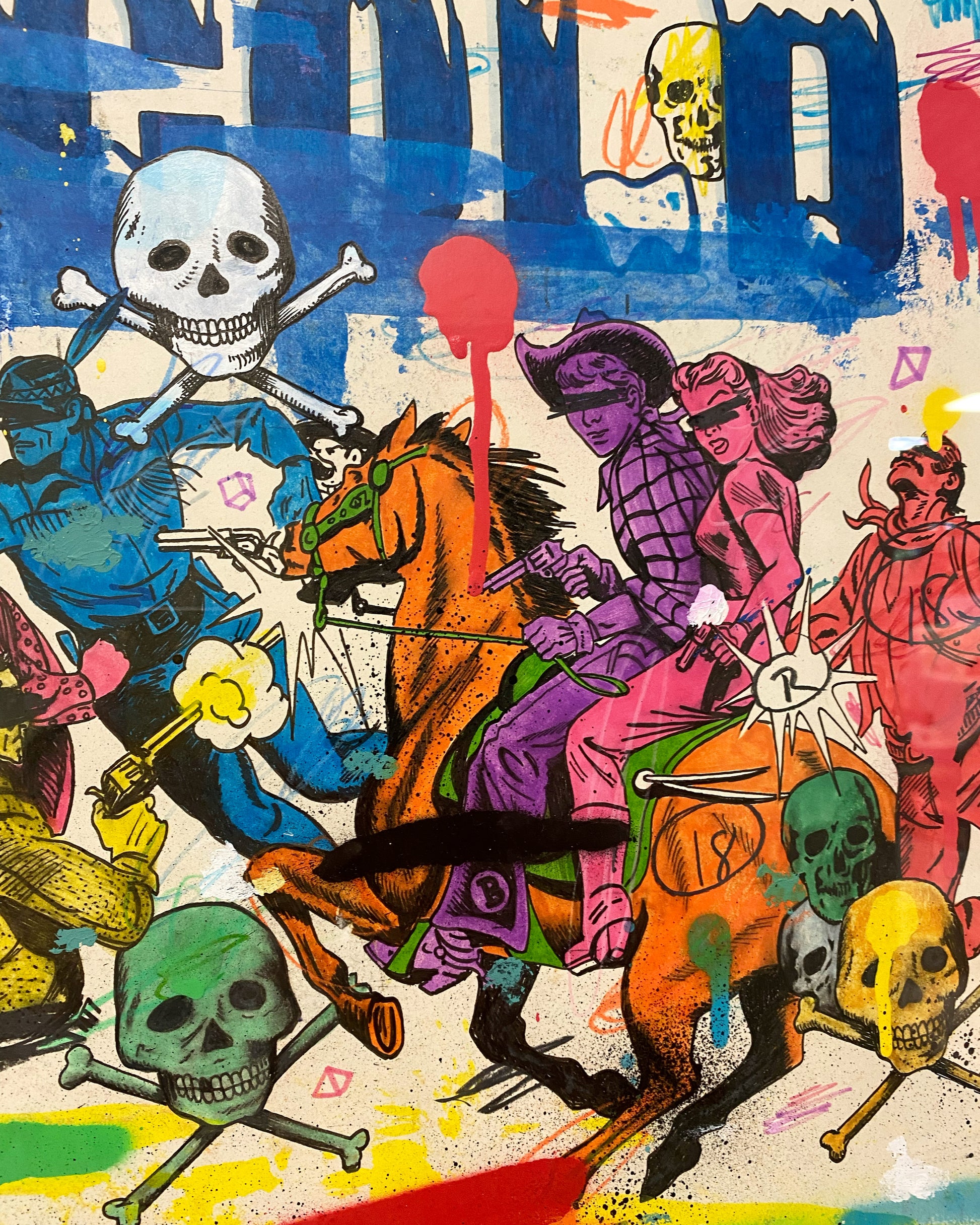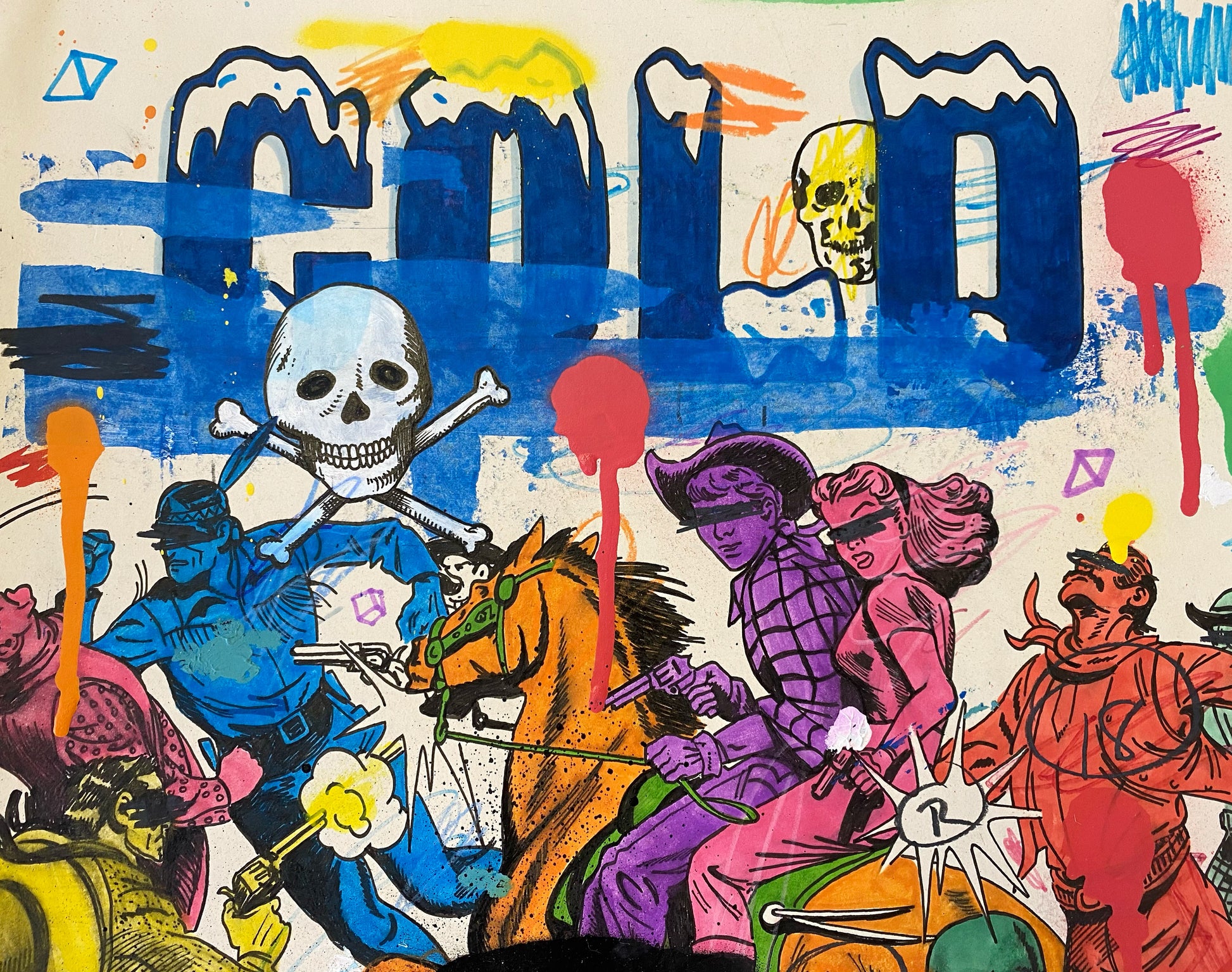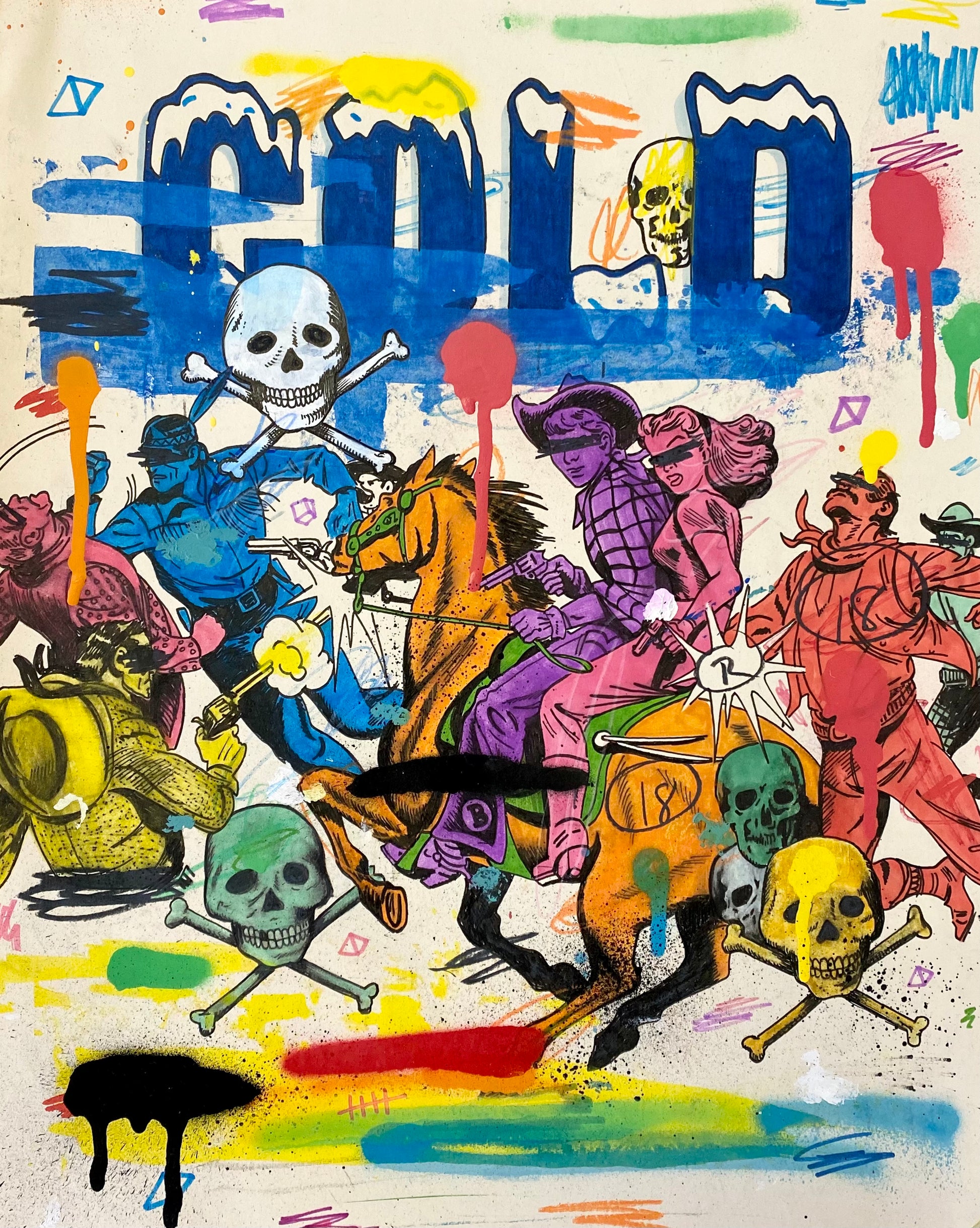 American (b. 1975). Matt Eddmenson, who graduated from The Art Academy of Cincinnati in 1999, draws from a range of influences and sources for his practice, including Cowboy Comics, Pop Art, and the work of Cy Twombly. His works are gatherings and reconfigurations of American imagery and iconography, commonly featuring cowboys, skulls, and rodeo horses. He also incorporates images from the golden age of comics and tattoo culture. Eddmenson explains: “I work from my memories as a child, I learned to draw by tracing comic book covers over and over until I was able to draw these characters from memory—I have a deep admiration for comic book art.” Works like 'You Keep Twistin My Words Around' (2020) and 'Don't Look at the Sun Too Long' (2020) demonstrate Eddmenson’s ability to reference western comics, his love for postmodern masters, and the great colorists of the 21st century.