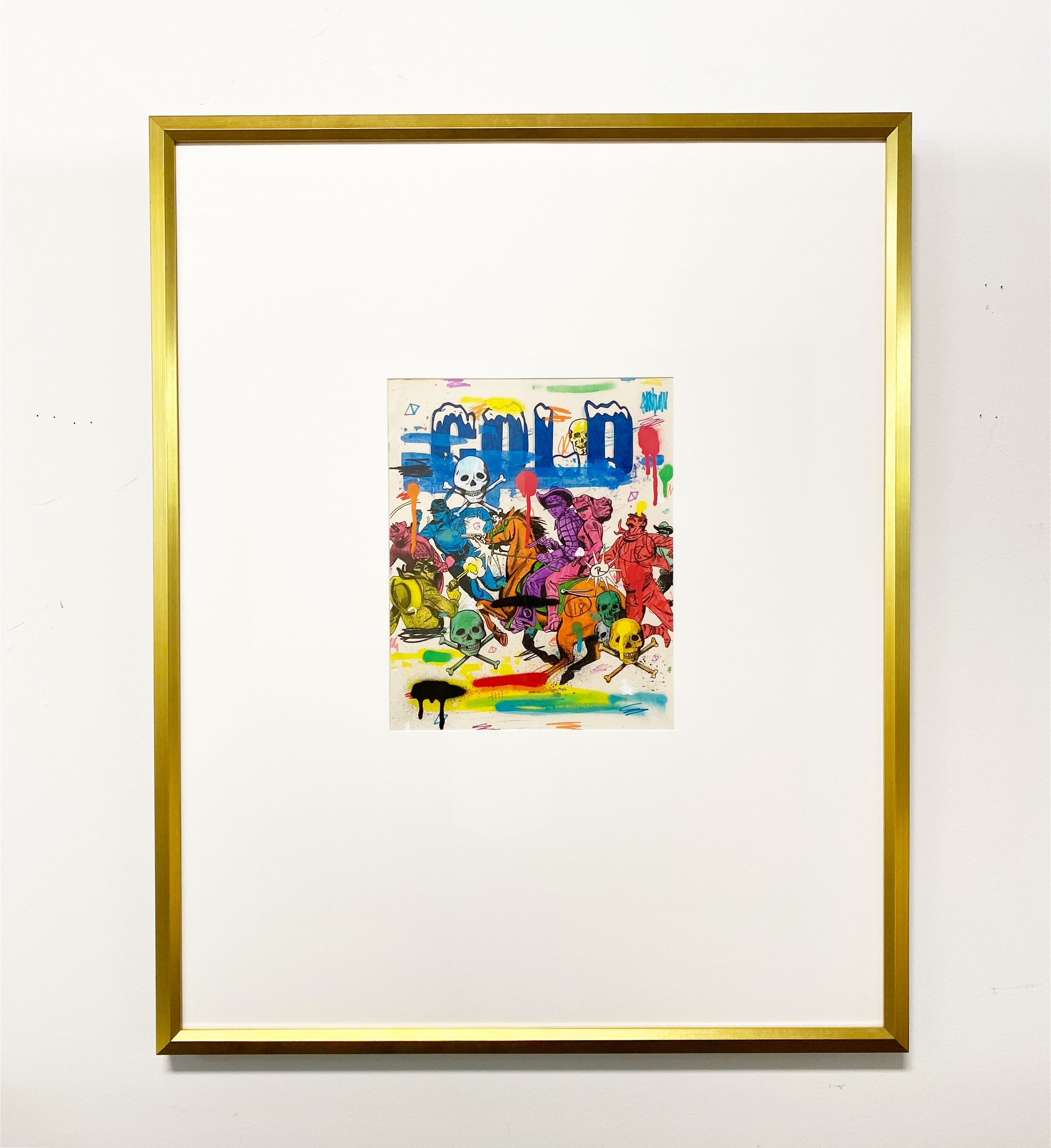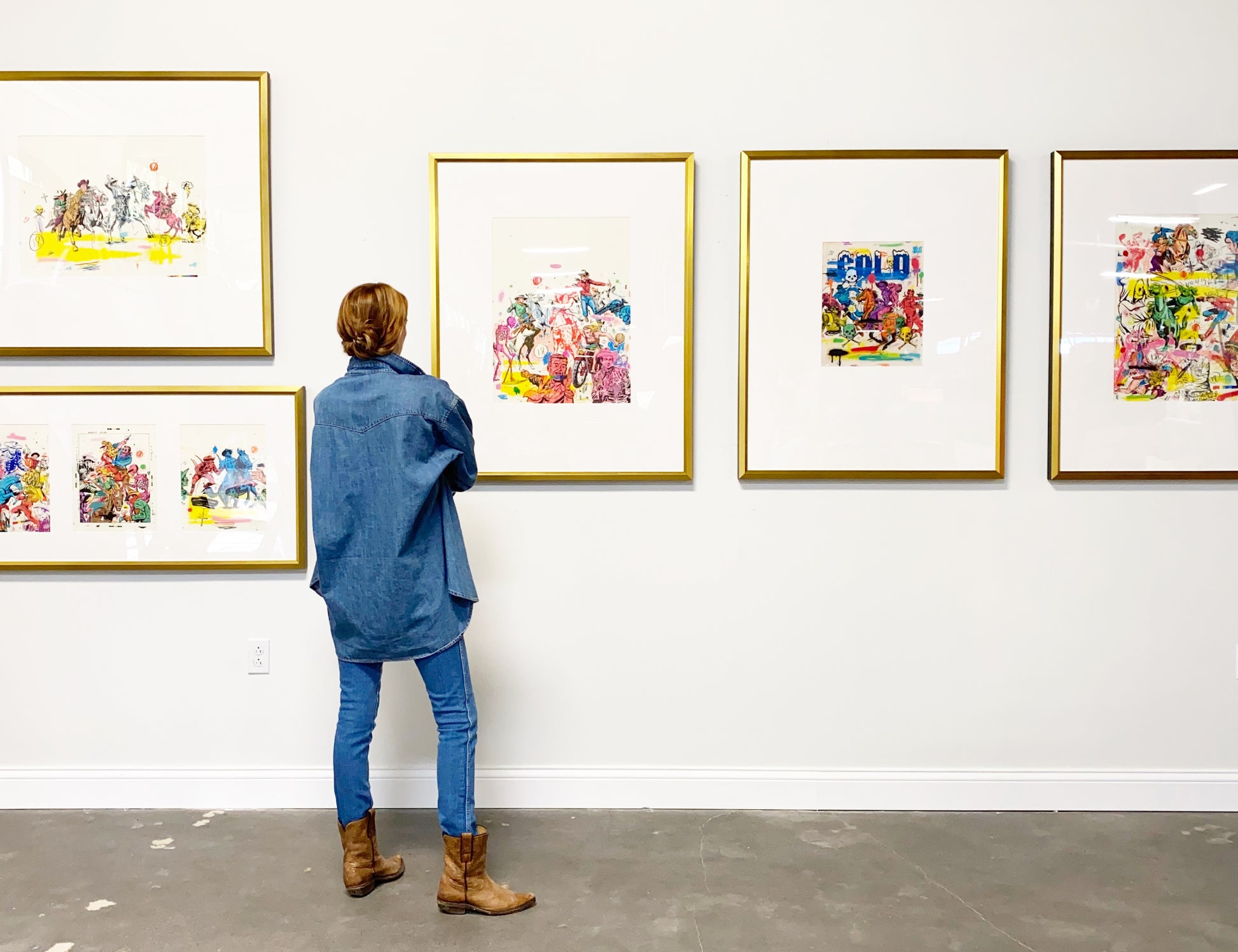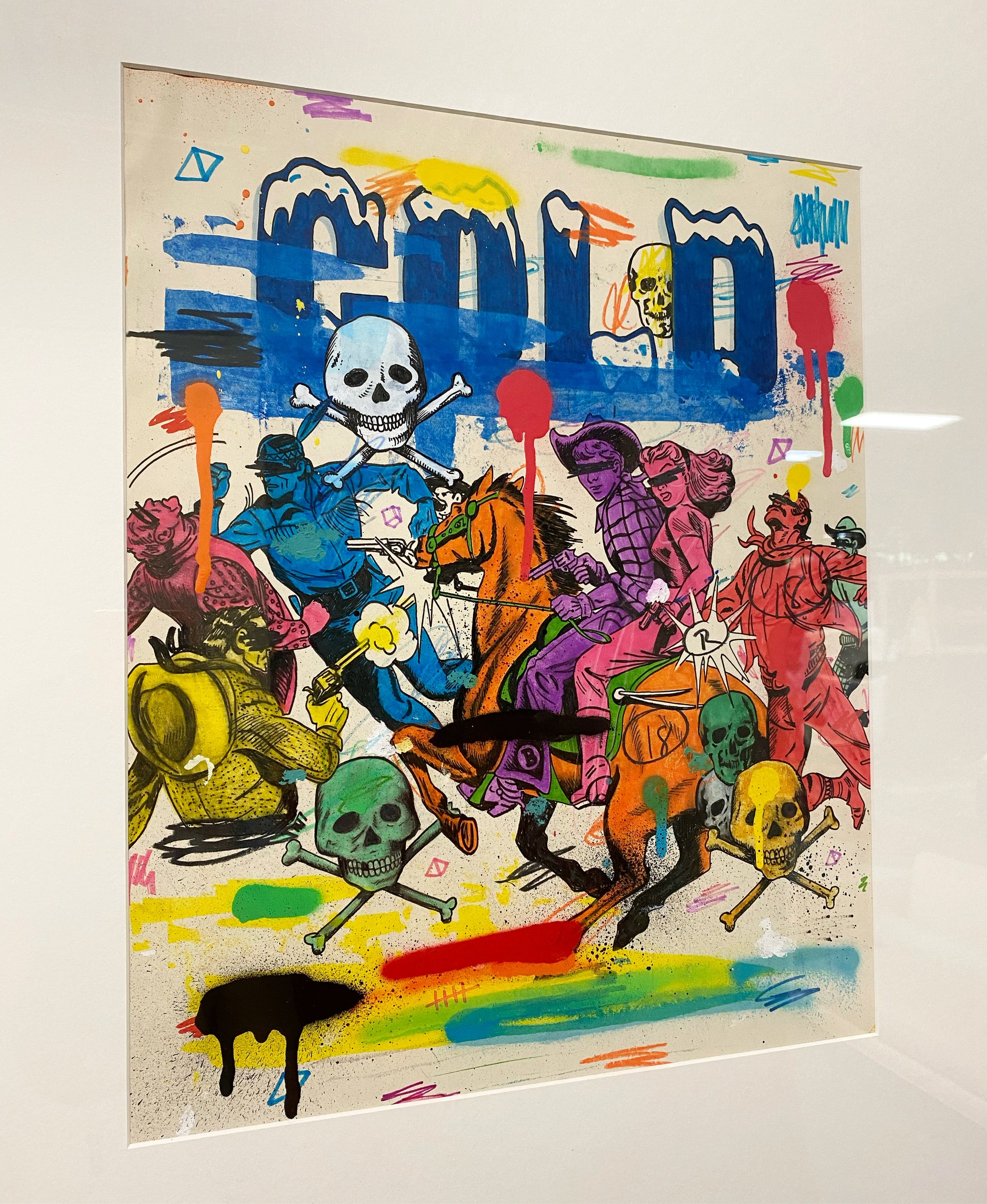 American (b. 1975). Matt Eddmenson, who graduated from The Art Academy of Cincinnati in 1999, draws from a range of influences and sources for his practice, including Cowboy Comics, Pop Art, and the work of Cy Twombly. His works are gatherings and reconfigurations of American imagery and iconography, commonly featuring cowboys, skulls, and rodeo horses. He also incorporates images from the golden age of comics and tattoo culture. Eddmenson explains: “I work from my memories as a child, I learned to draw by tracing comic book covers over and over until I was able to draw these characters from memory—I have a deep admiration for comic book art.” Works like 'You Keep Twistin My Words Around' (2020) and 'Don't Look at the Sun Too Long' (2020) demonstrate Eddmenson’s ability to reference western comics, his love for postmodern masters, and the great colorists of the 21st century.