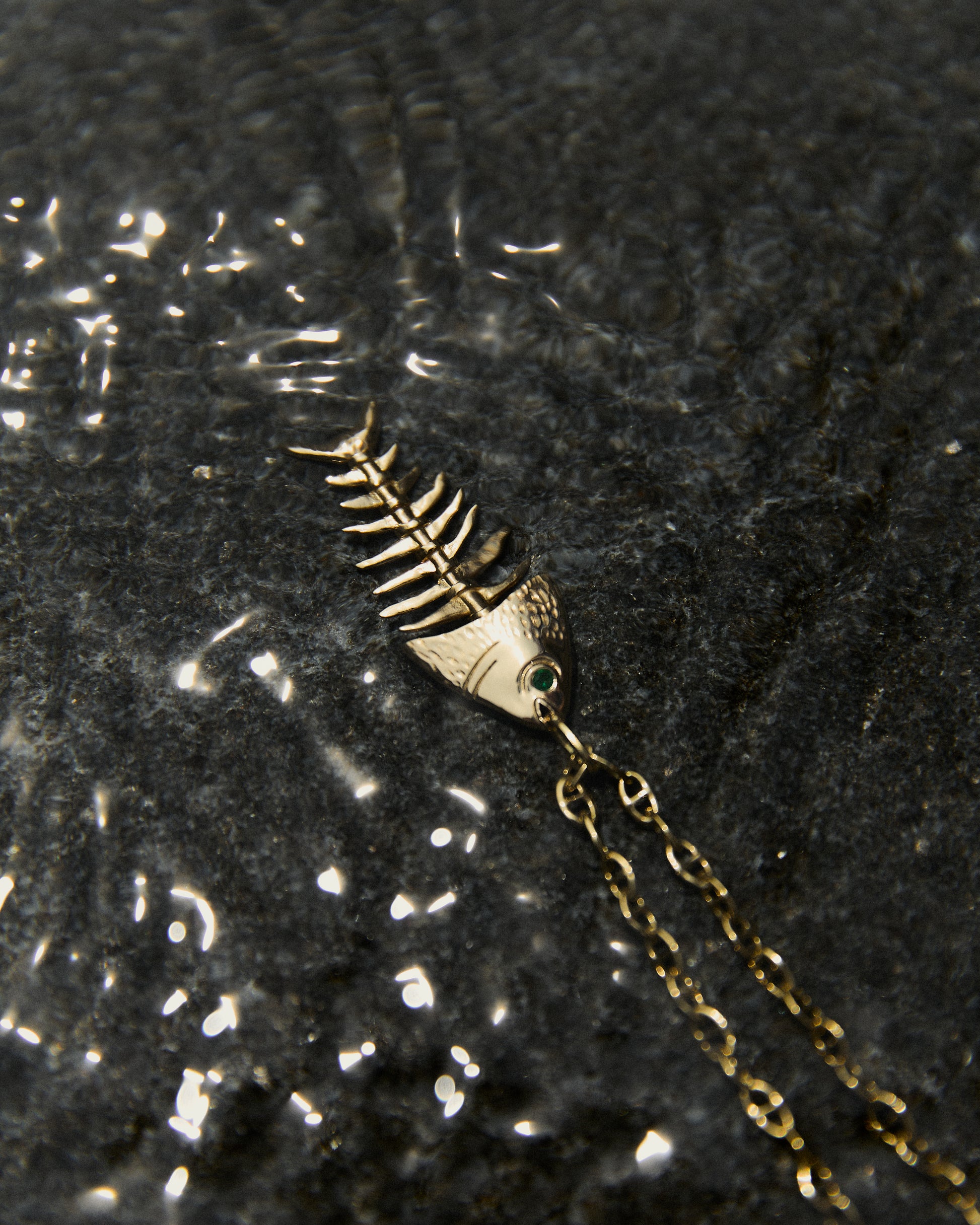 Part of Jennifer Alfano's Summer Souvenirs Collection, the Il Pesce Pendant is 18k gold with an undulating spine, measures 18mm in width by 45 mm in length and is set with 1.8mm emerald eyes (also available as diamonds, rubies or sapphires, please reach out if you are interested in a different gemstone.)
