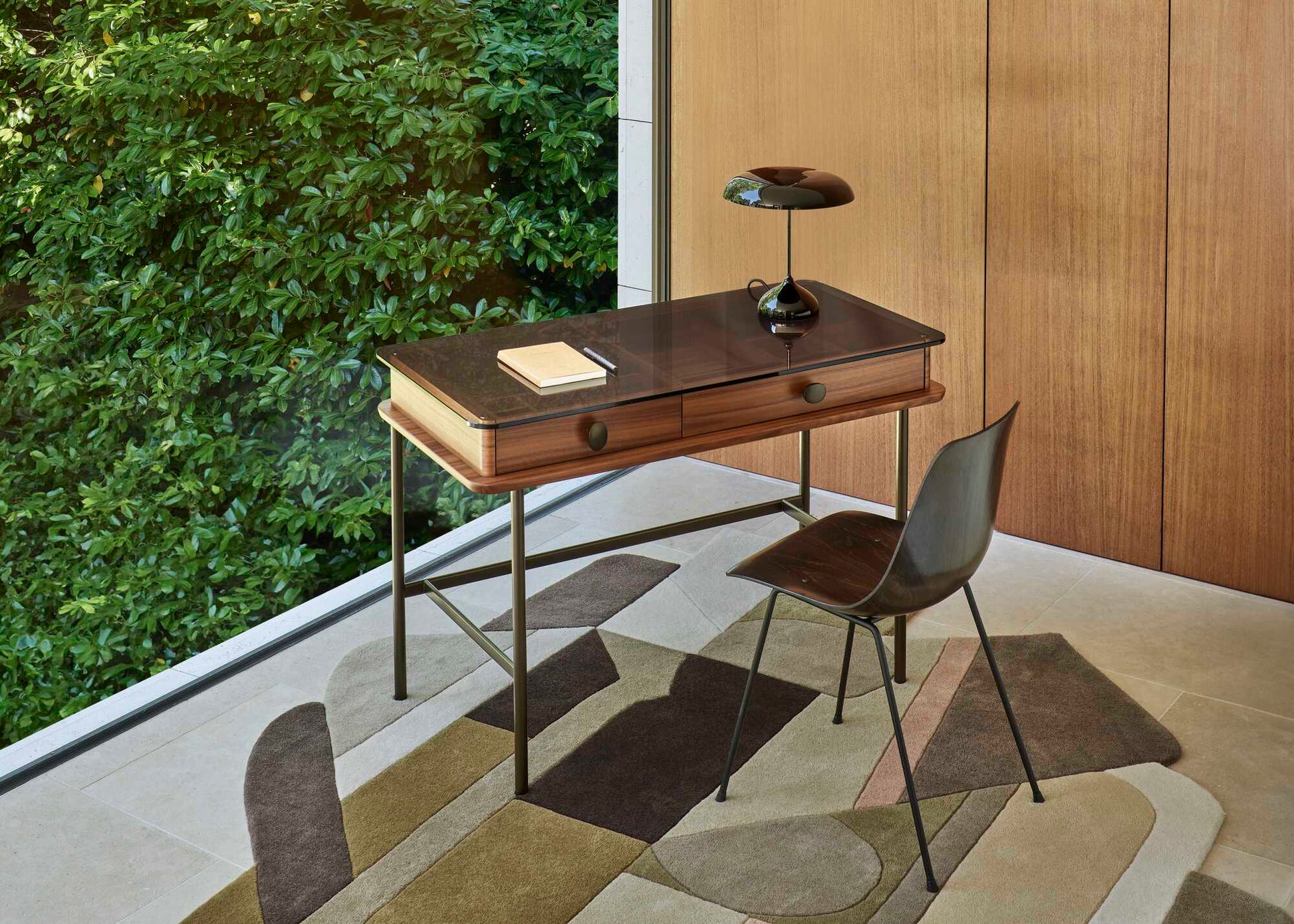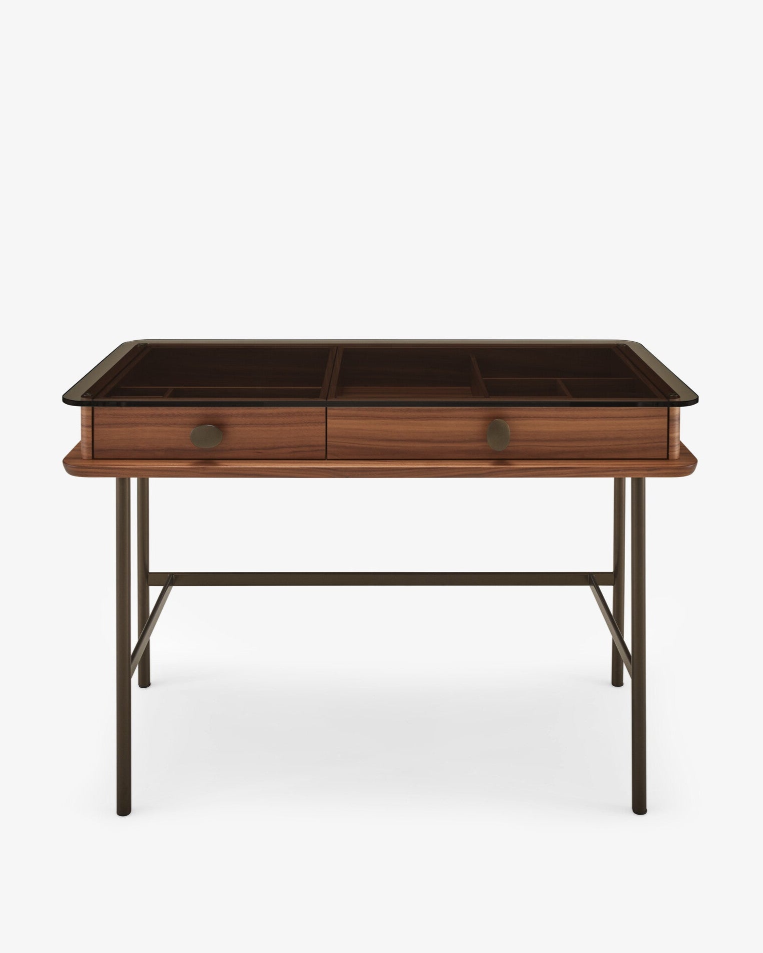 Indiscret is a hybrid product, both secretaire and dressing table. Its name partly comes from the extra clear glass top allowing you to see the contents of each drawer with compartments to store tablets, notebooks, pens or brushes, combs, hair accessories... The Indiscret desk is perfect as a dressing table when accompanied by a mirror. “Dark bronze” lacquered steel base, extra clear tempered glass top revealing the compartments of the 2 drawers in American walnut veneered MDF with natural varnish. Two moulded aluminum handles in “dark bronze” lacquer, satin finish.