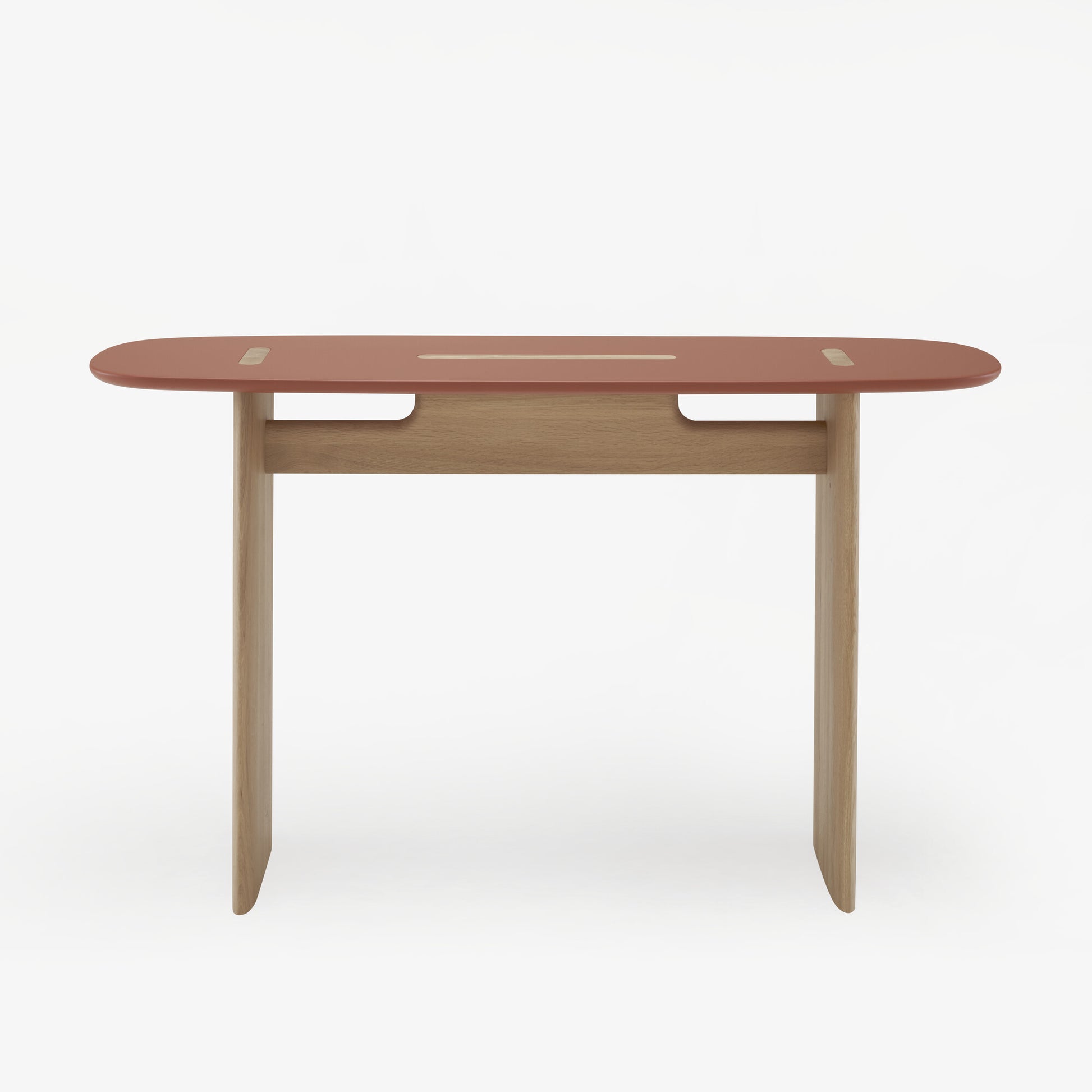 Console with a whitened solid oak base and satin copper brown lacquered MDF top.
