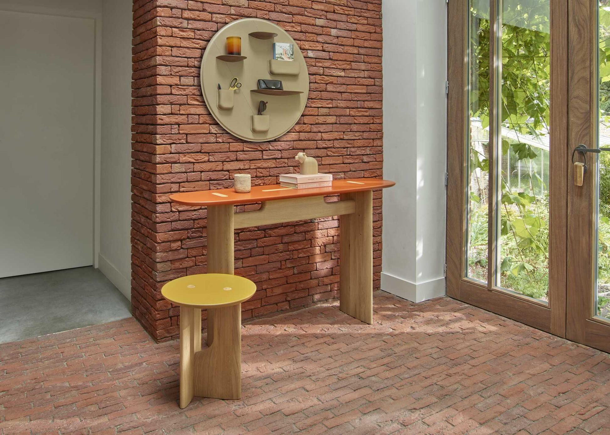 Console with a whitened solid oak base and satin copper brown lacquered MDF top. - Occasional table with whitened oak legs and top in satin brun vert lacquered MDF.