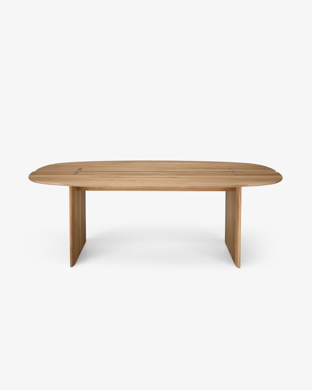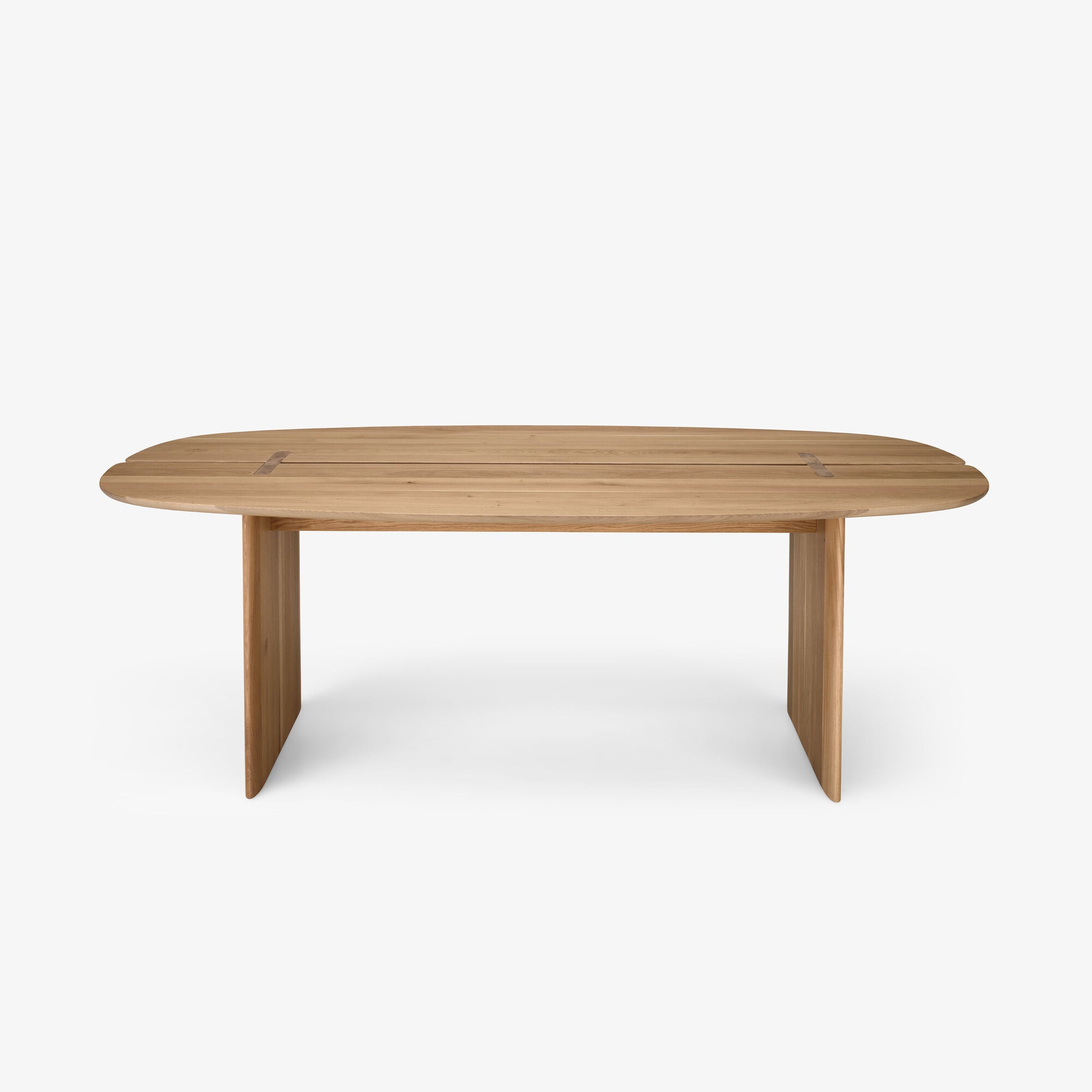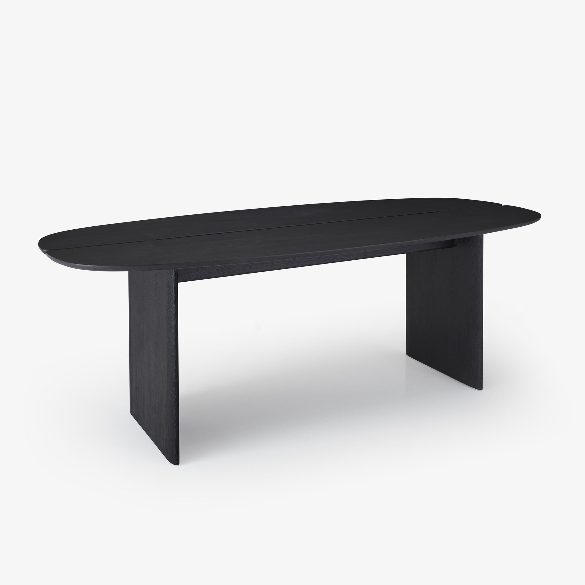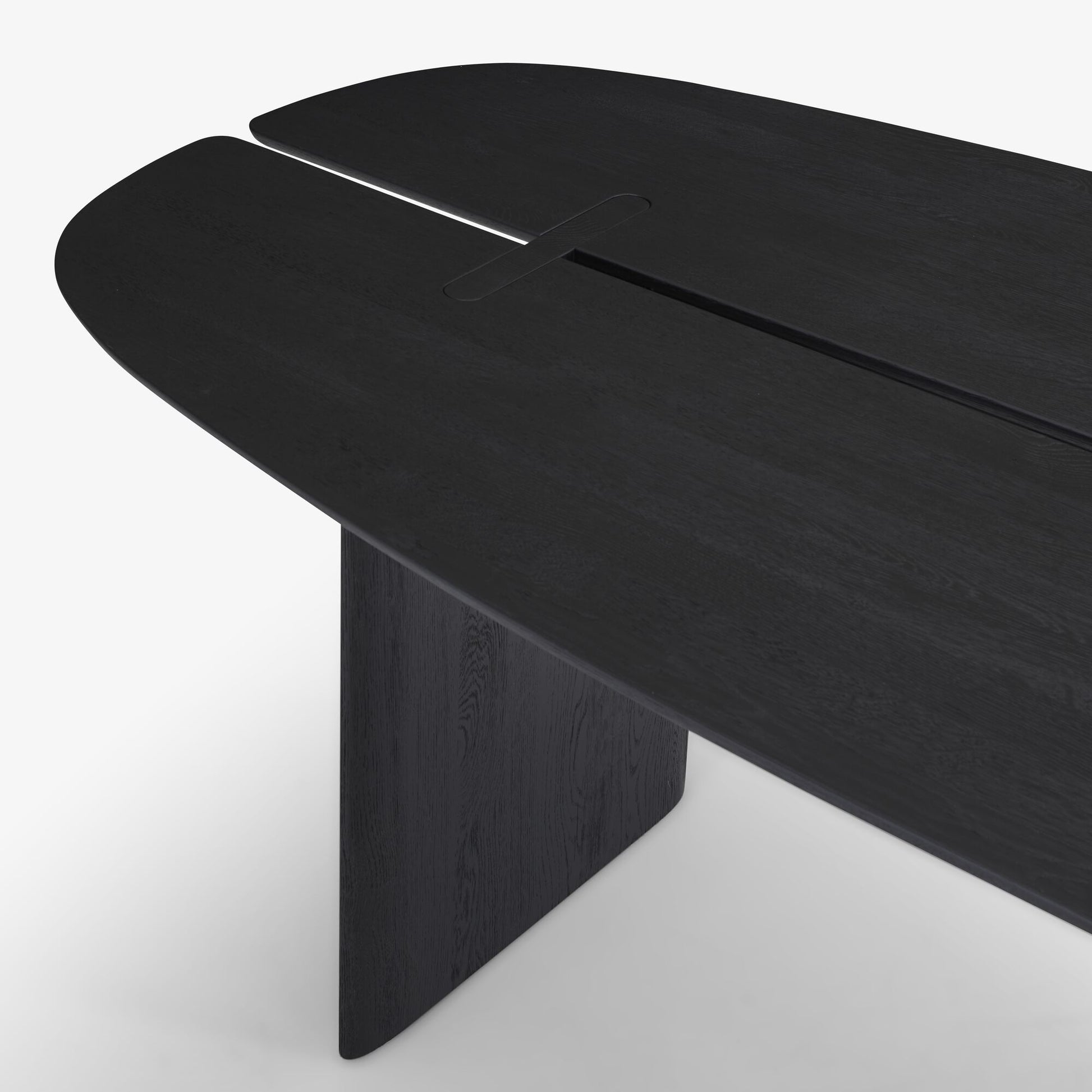 With ''Intervalle'', Delvigne brings us a highly graphic table. Around the central opening the light flows pleasantly onto the tapered aero-plane wing-shaped base. The two original features of this range lie as much in this central ''fault line'' and the way in which the two base parts emerge beneath it, as in the way in which the veins in the end grain used for the legs intersect with those in the flat-grained timber used for the tops. It is, to summarize, a play of lines, directions and sweeping curves which we are invited to discover, whatever the distance and angle from which these two tables are viewed. A way of paying homage to the nobility of the solid wood from which they are constructed.