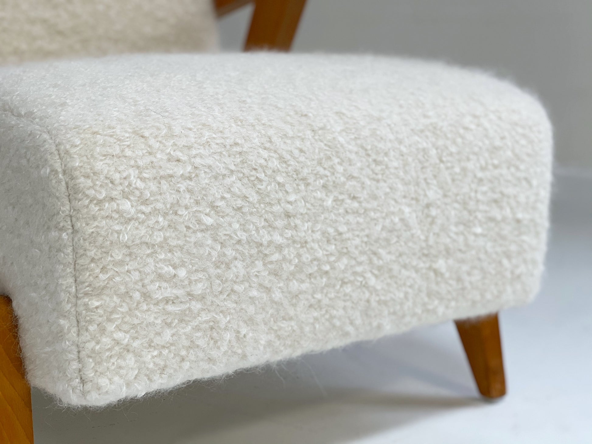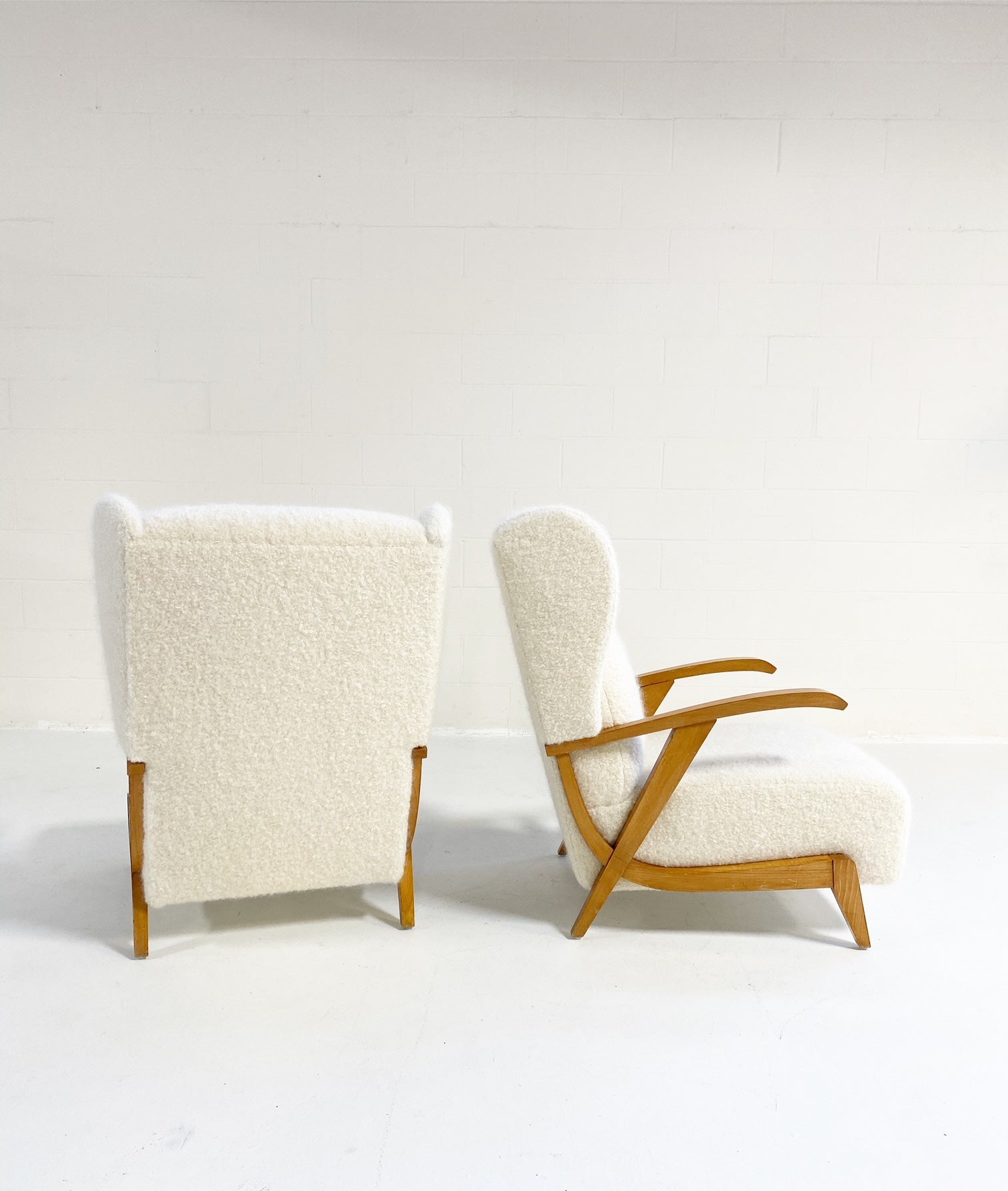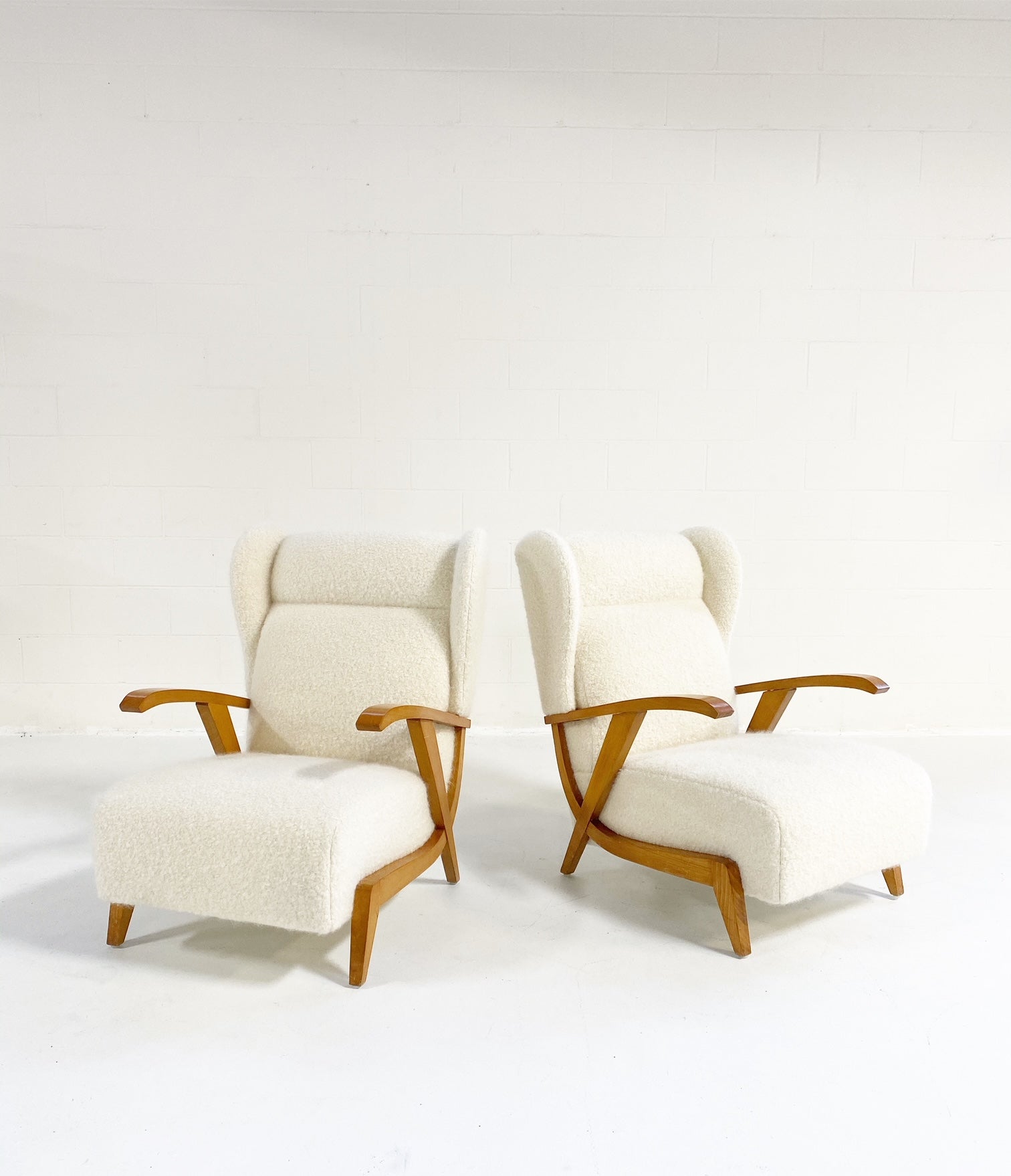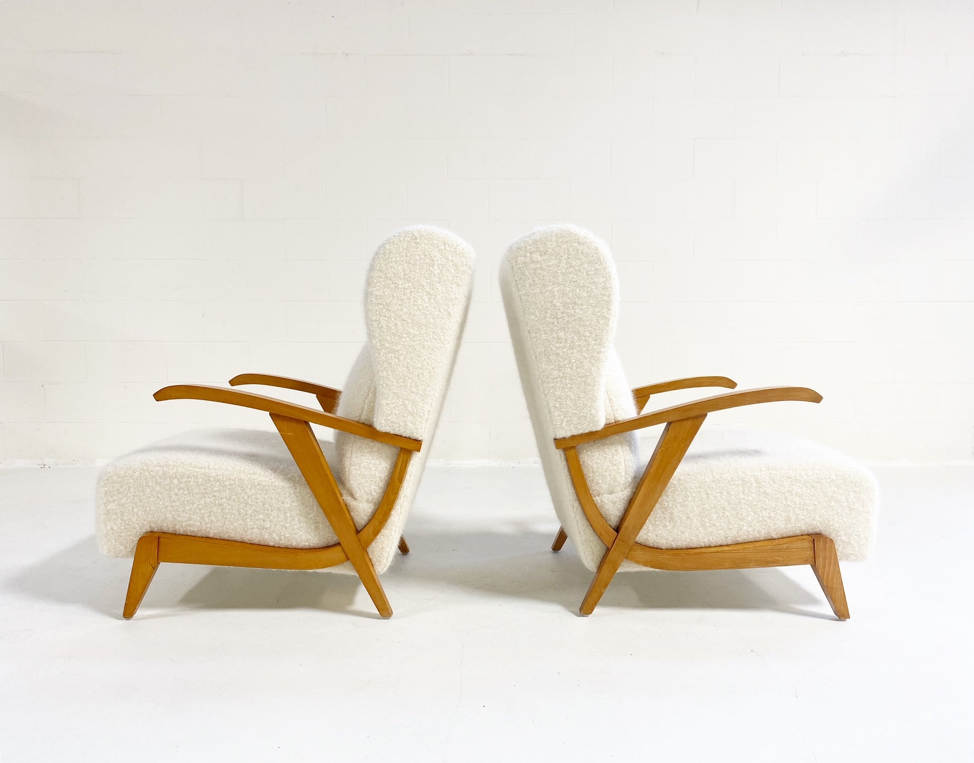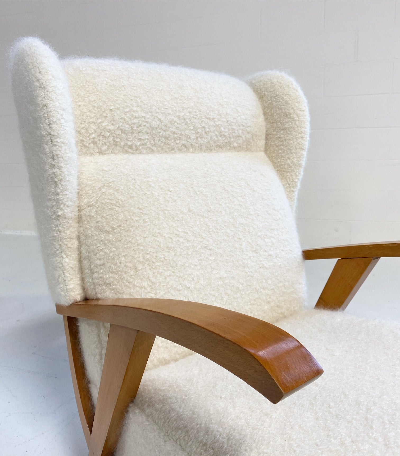 These vintage Italian lounge chairs are outstanding. The details of the wood frame and arms, the deep seat, a perfect lounge pair for a cozy living area. We chose an exceptional, ultra-luxurious boucle from renowned label, Pierre Frey, for restoration and reupholstery. Add a couple throw pillows for a pop of color or keep it sans pillow for a sleek, modern feel.