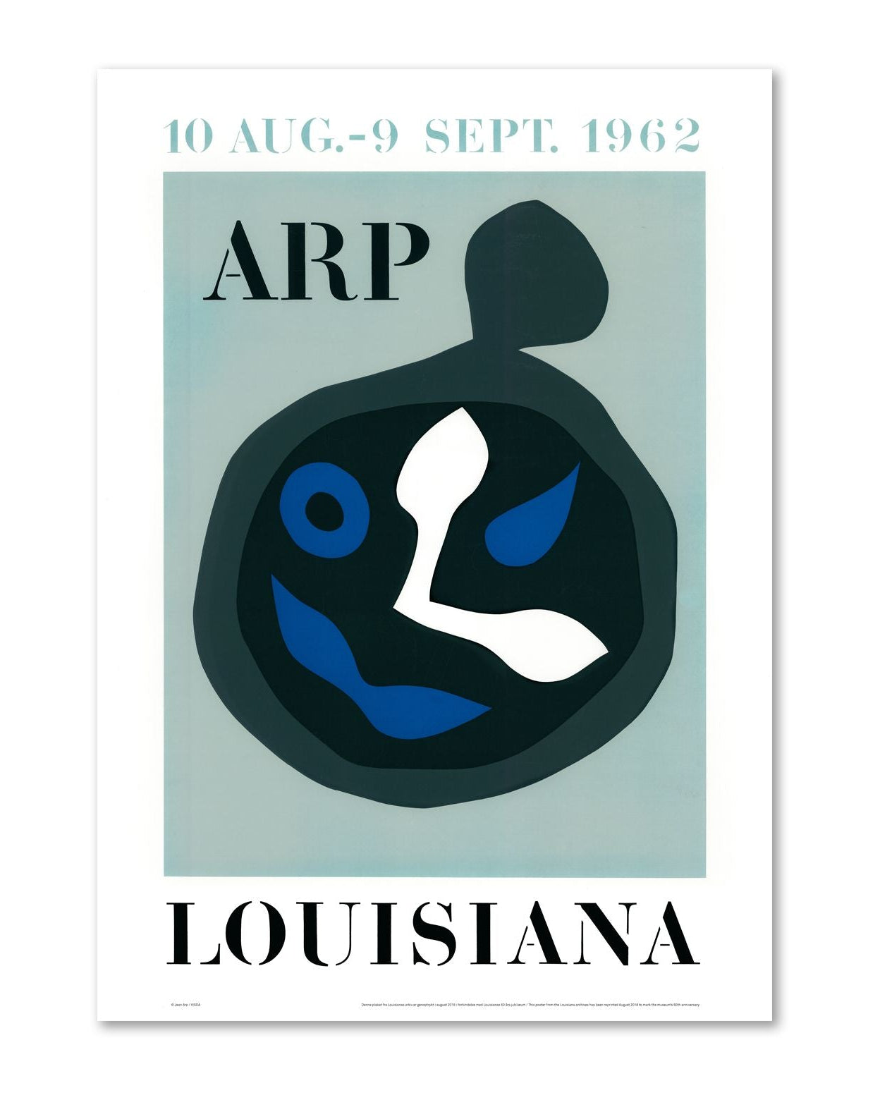 Anniversary poster featuring the work of the German-French artist, Jean Arp, (1886-1966), from Louisiana's exhibition with Arp in 1962. The tradition of graphically striking expressions in poster form was already established in Louisiana's infancy, of which this poster from 1962 is a distinguished example of. The poster here is one of the posters reprinted in conjunction with Louisiana's 60th anniversary in 2018.