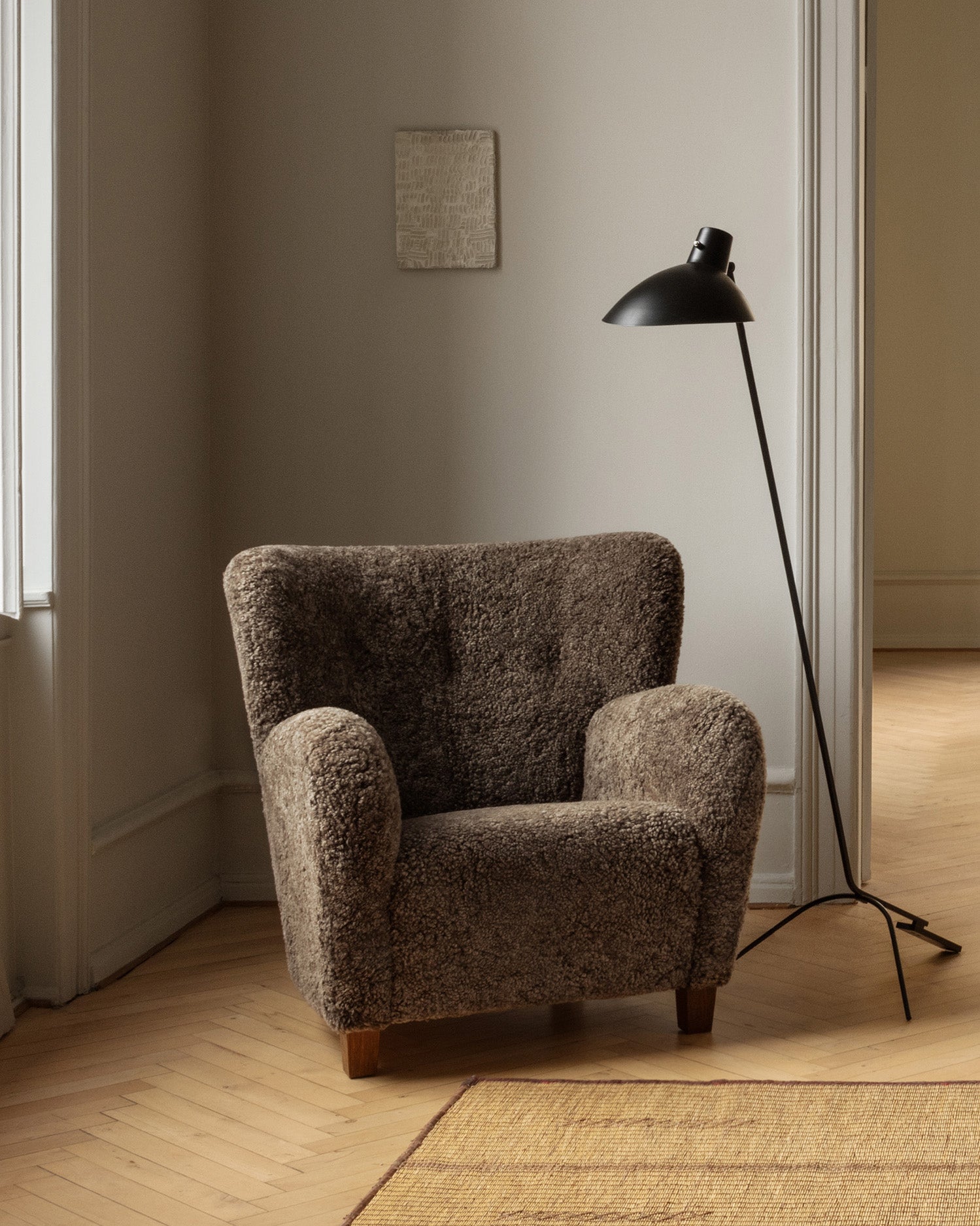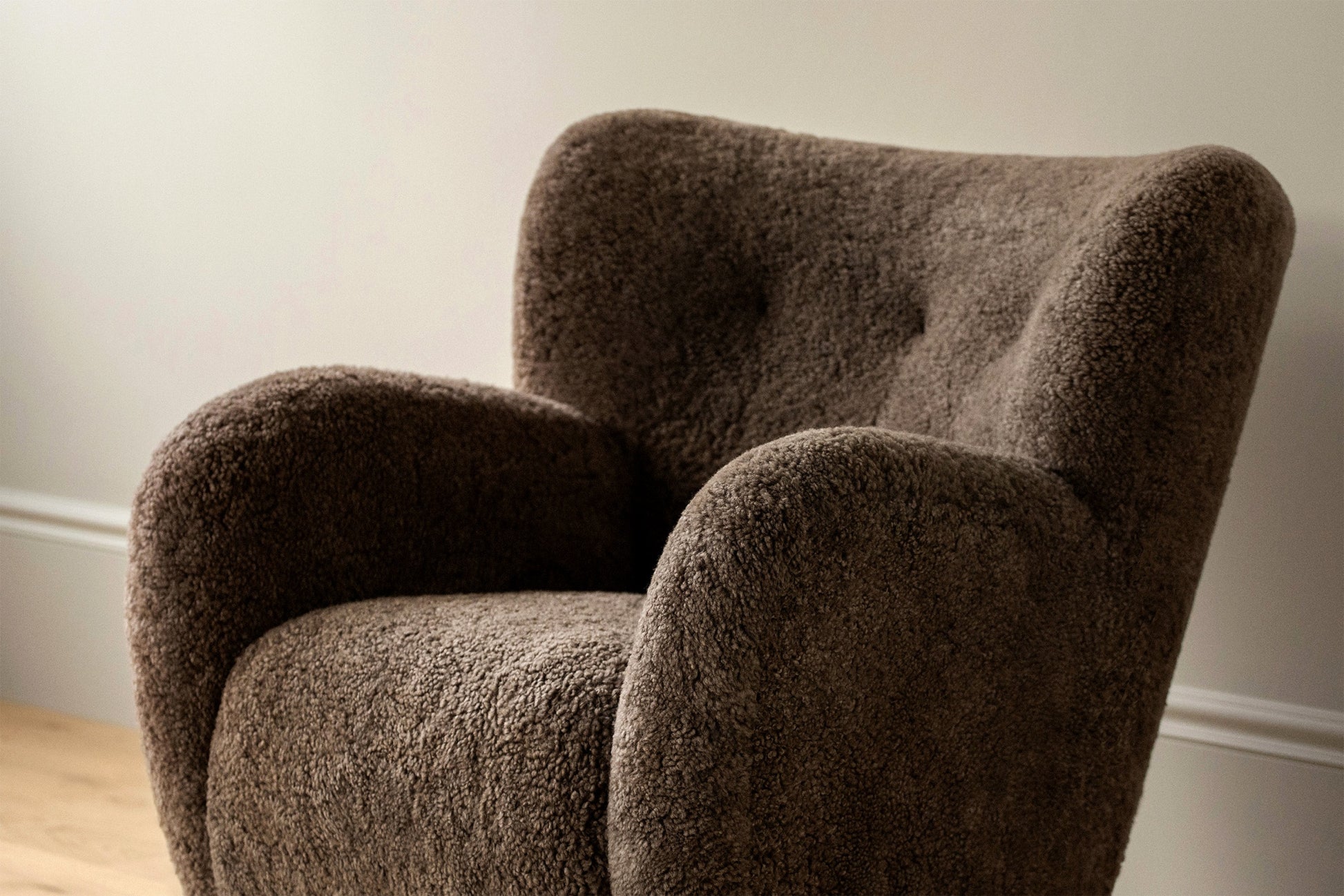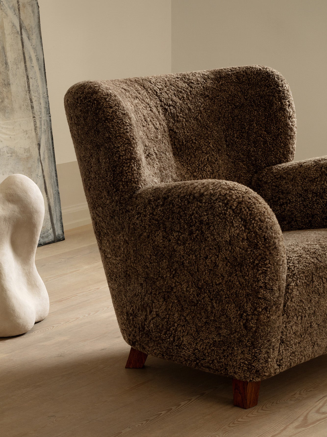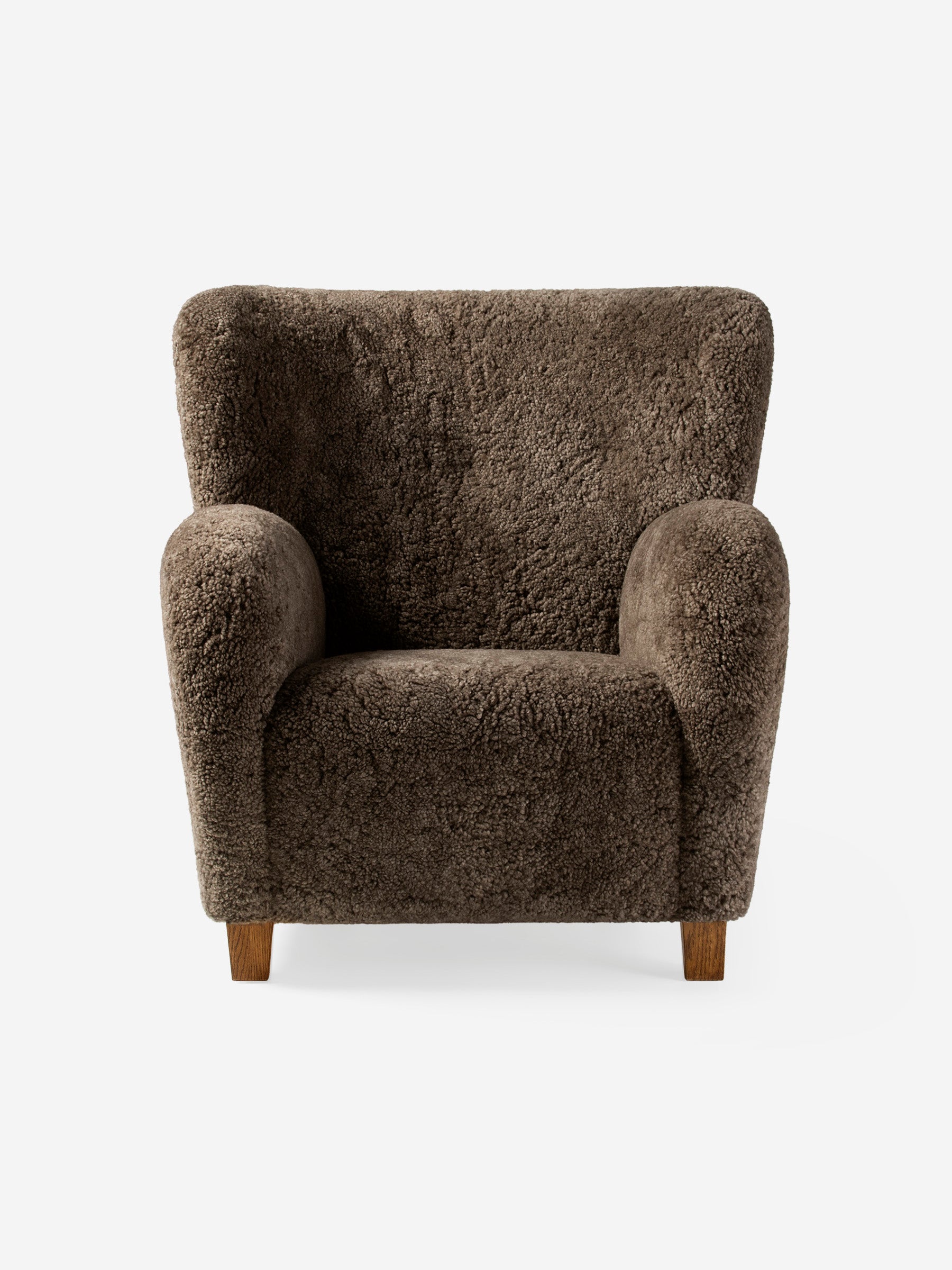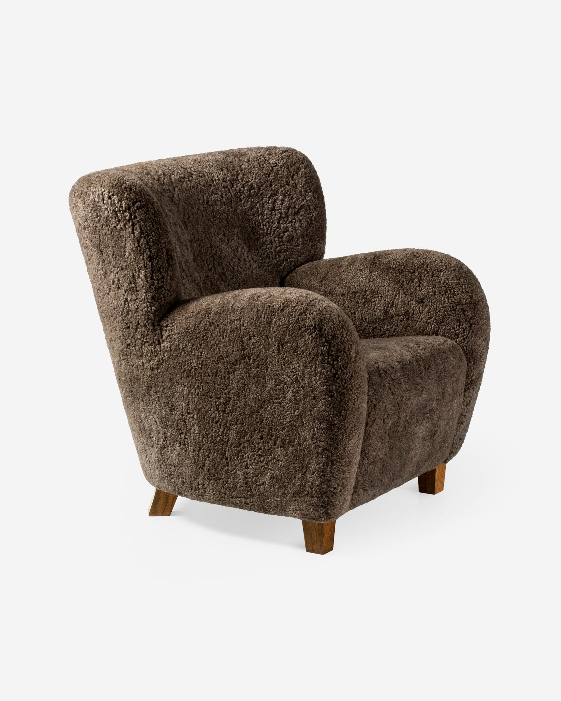 The Karu chair is a contemporary update of a classic design first produced in Finland by the Haimi Oy company in the early 1950s. The inviting curved arms and subtle winged back are the epitome of the post-war Nordic aesthetic. Karu offers perfect proportions for a bedroom or living room chair. This example is upholstered in genuine Australian sheepskin.