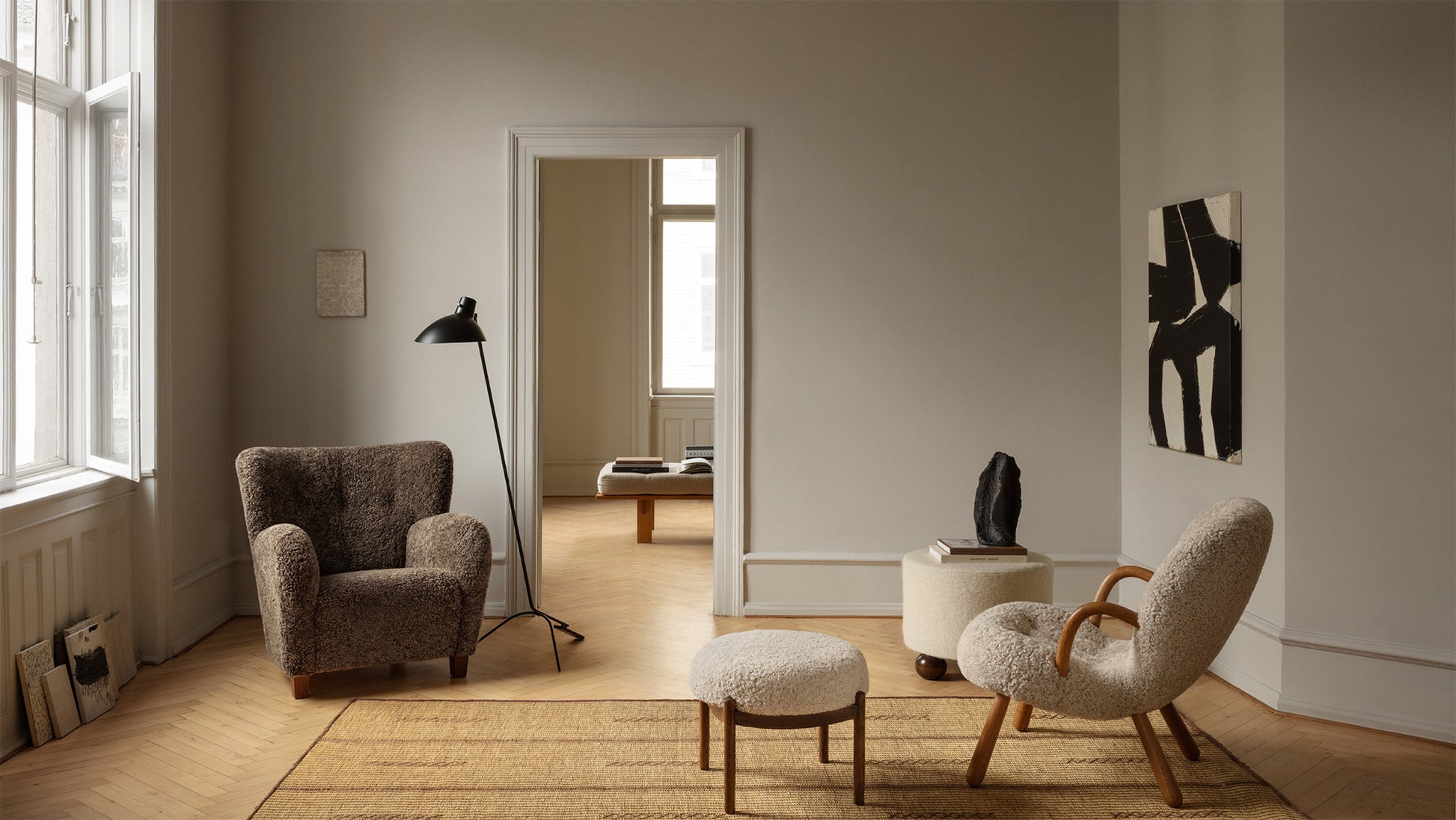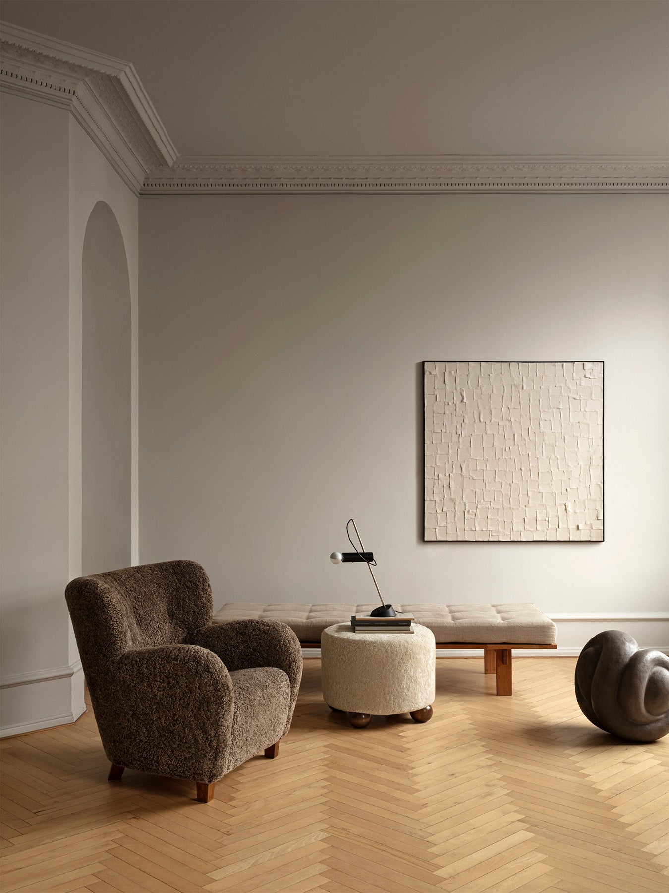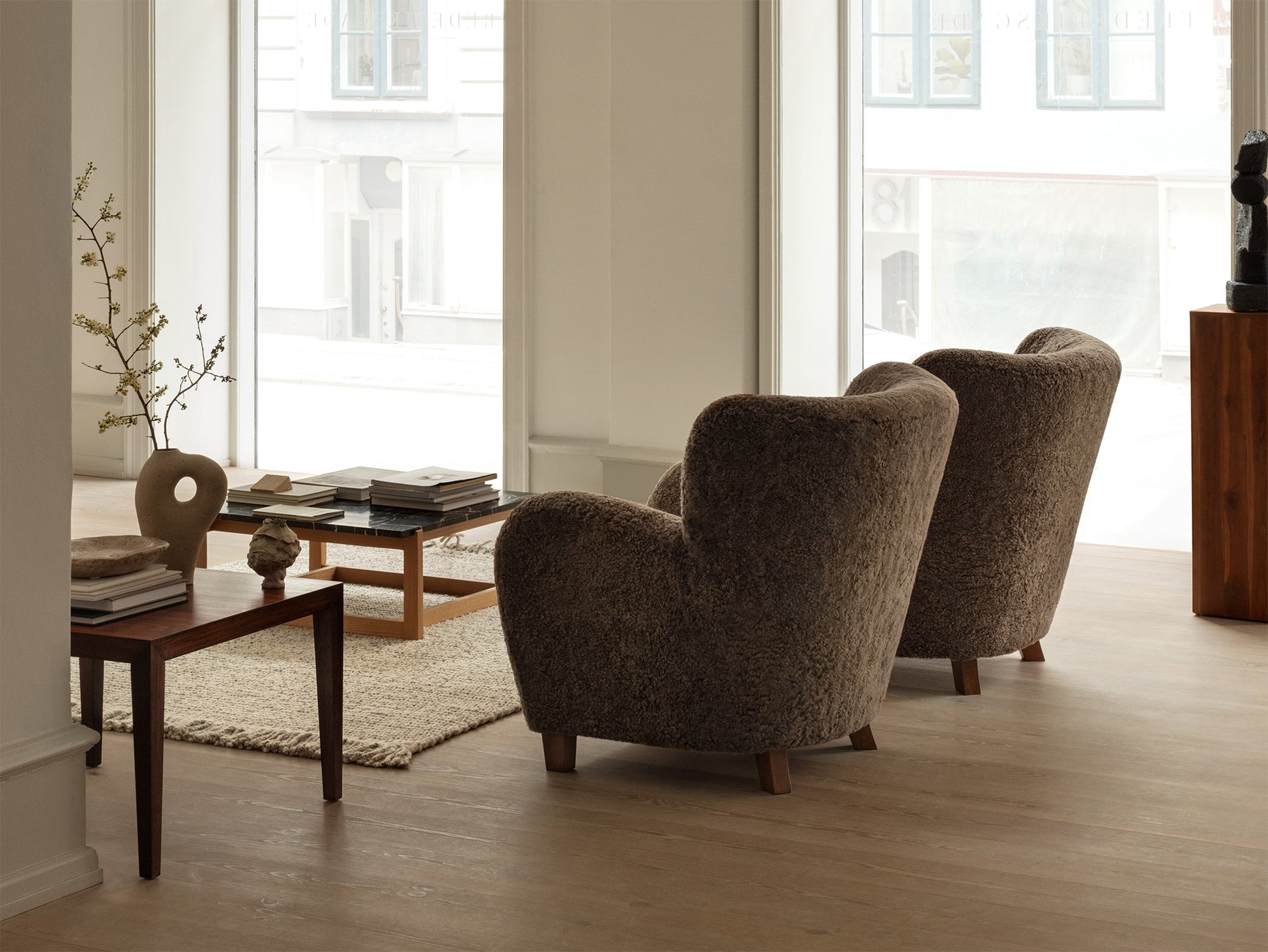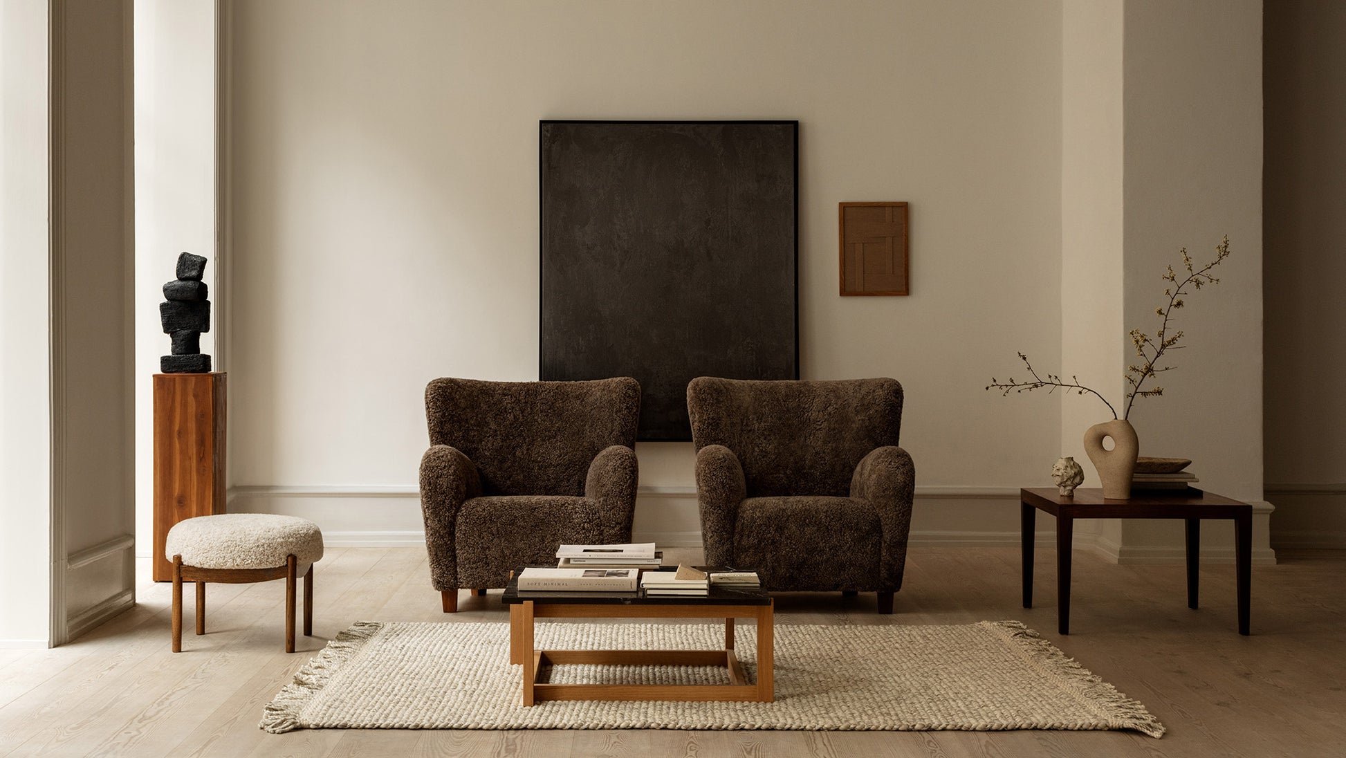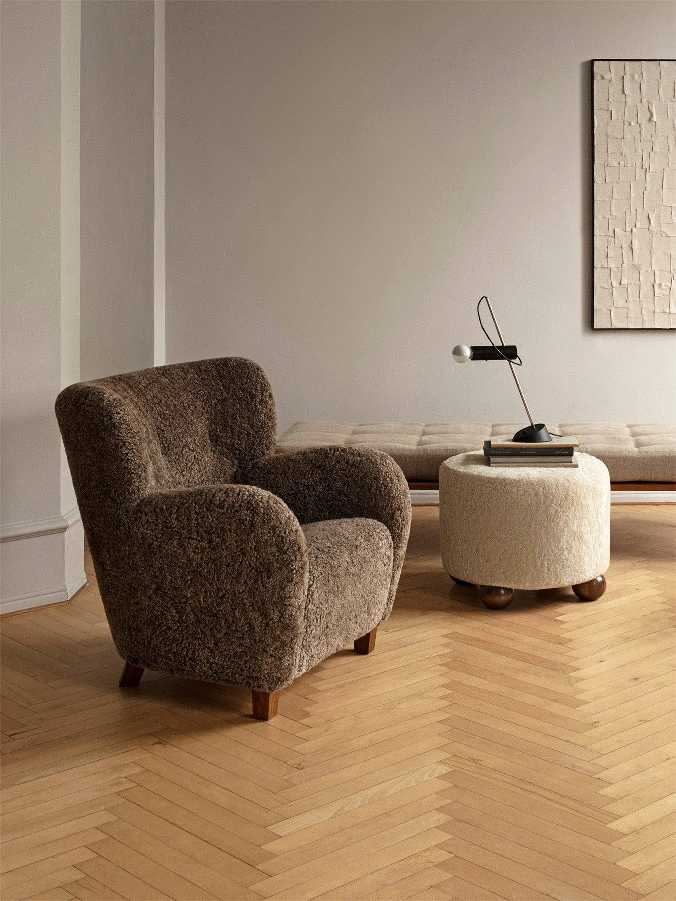 The Karu chair is a contemporary update of a classic design first produced in Finland by the Haimi Oy company in the early 1950s. The inviting curved arms and subtle winged back are the epitome of the post-war Nordic aesthetic. Karu offers perfect proportions for a bedroom or living room chair. This example is upholstered in genuine Australian sheepskin.