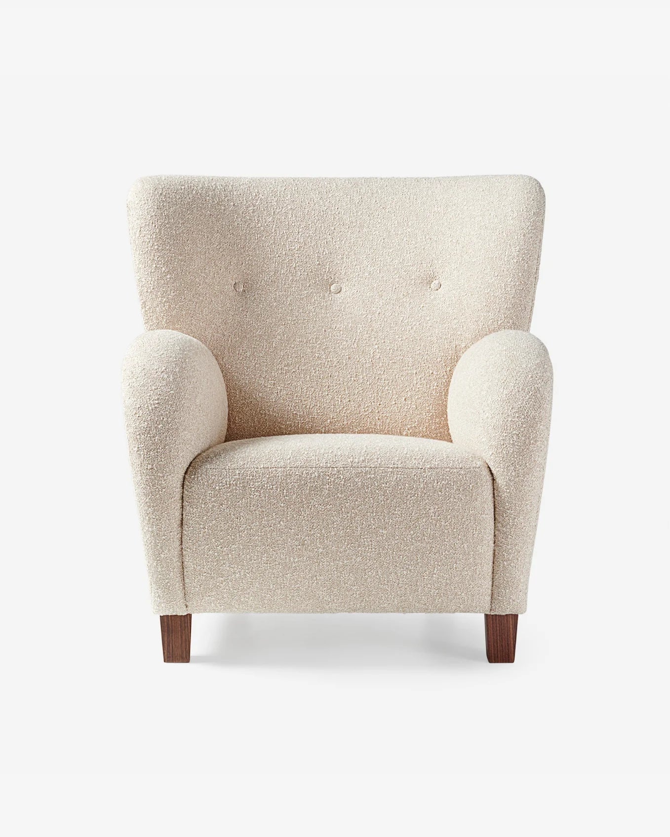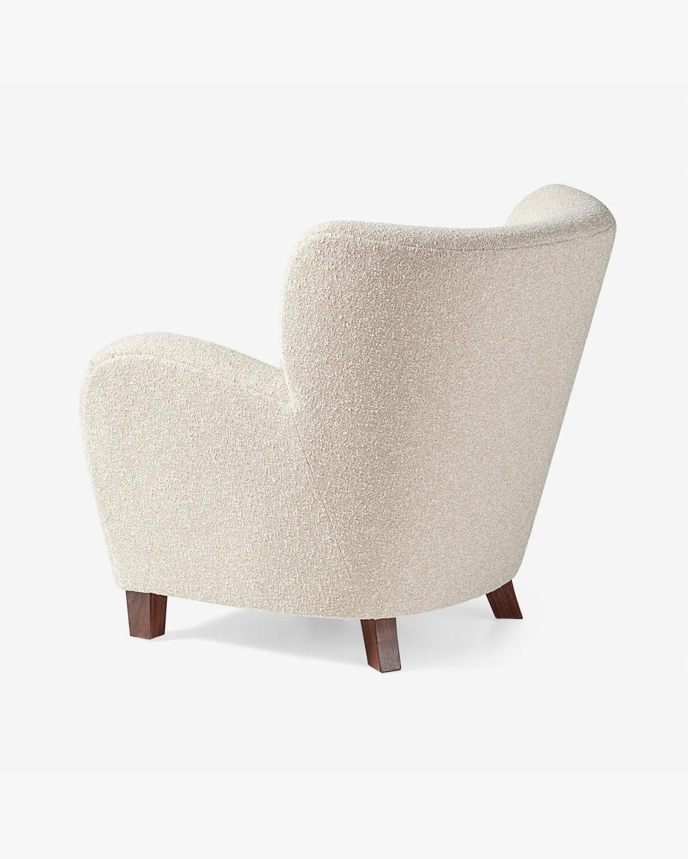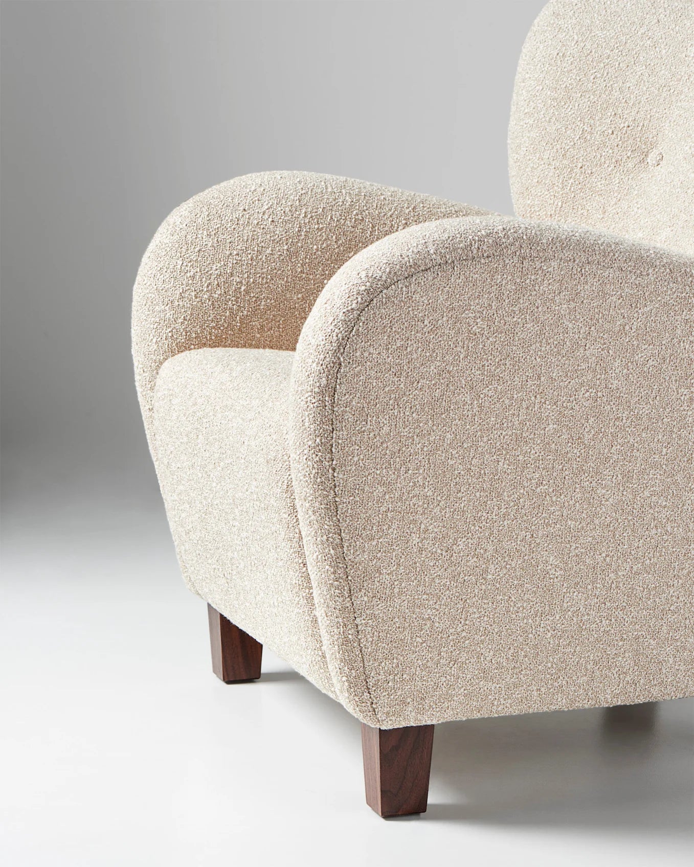The Karu chair is a contemporary update of a classic design first produced in Finland by the Haimi Oy company in the early 1950s. The inviting curved arms and subtle winged back are the epitome of the post-war Nordic aesthetic. Karu offers perfect proportions for a bedroom or living room chair. Shown in Zero from Sahco by Kvadrat, a soft and luxurious bouclé fabric.