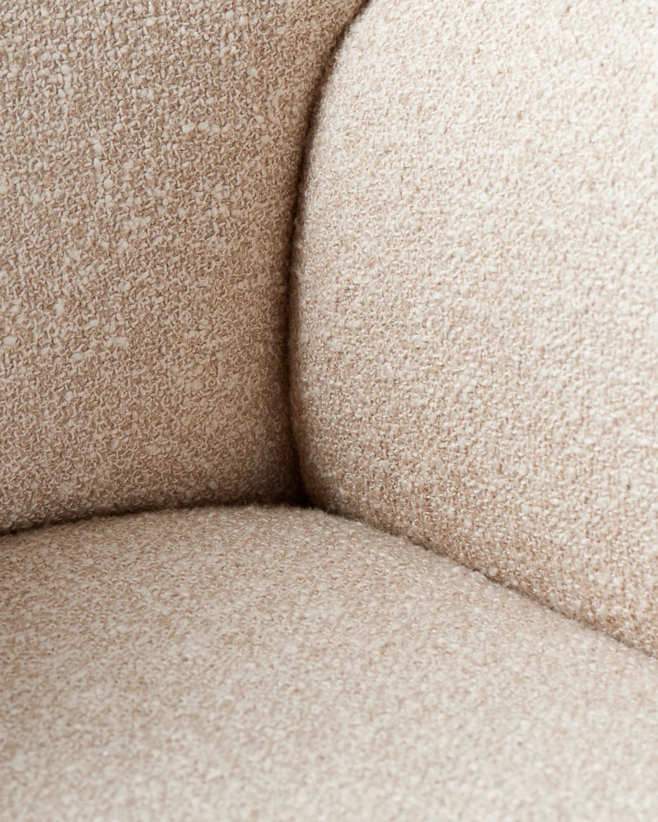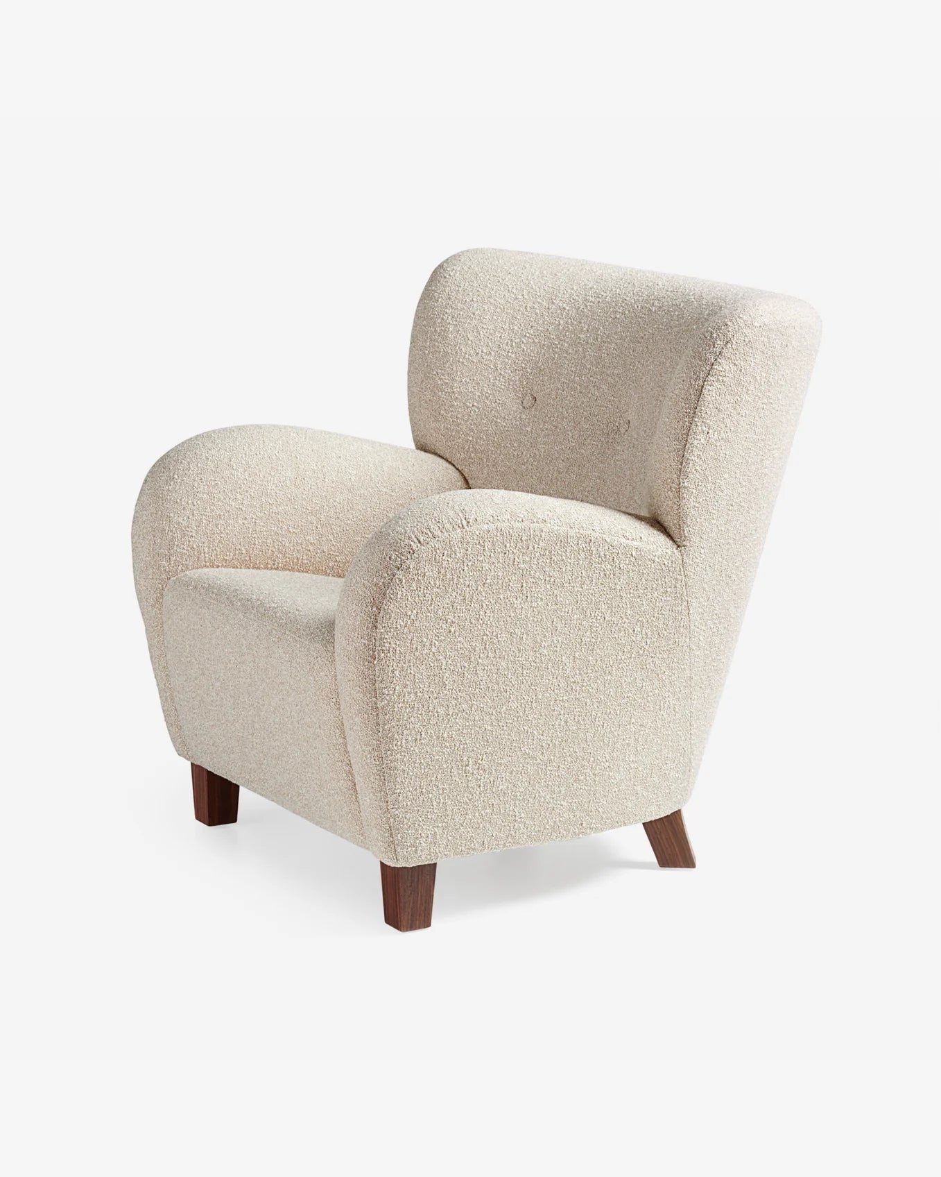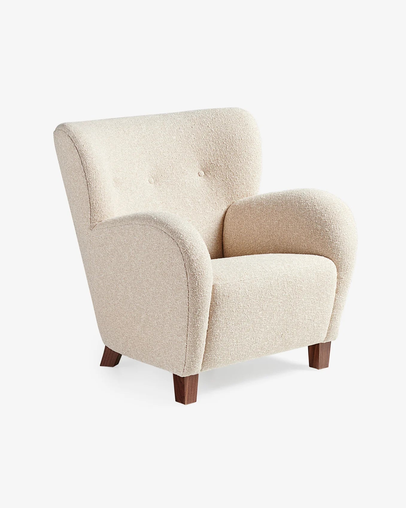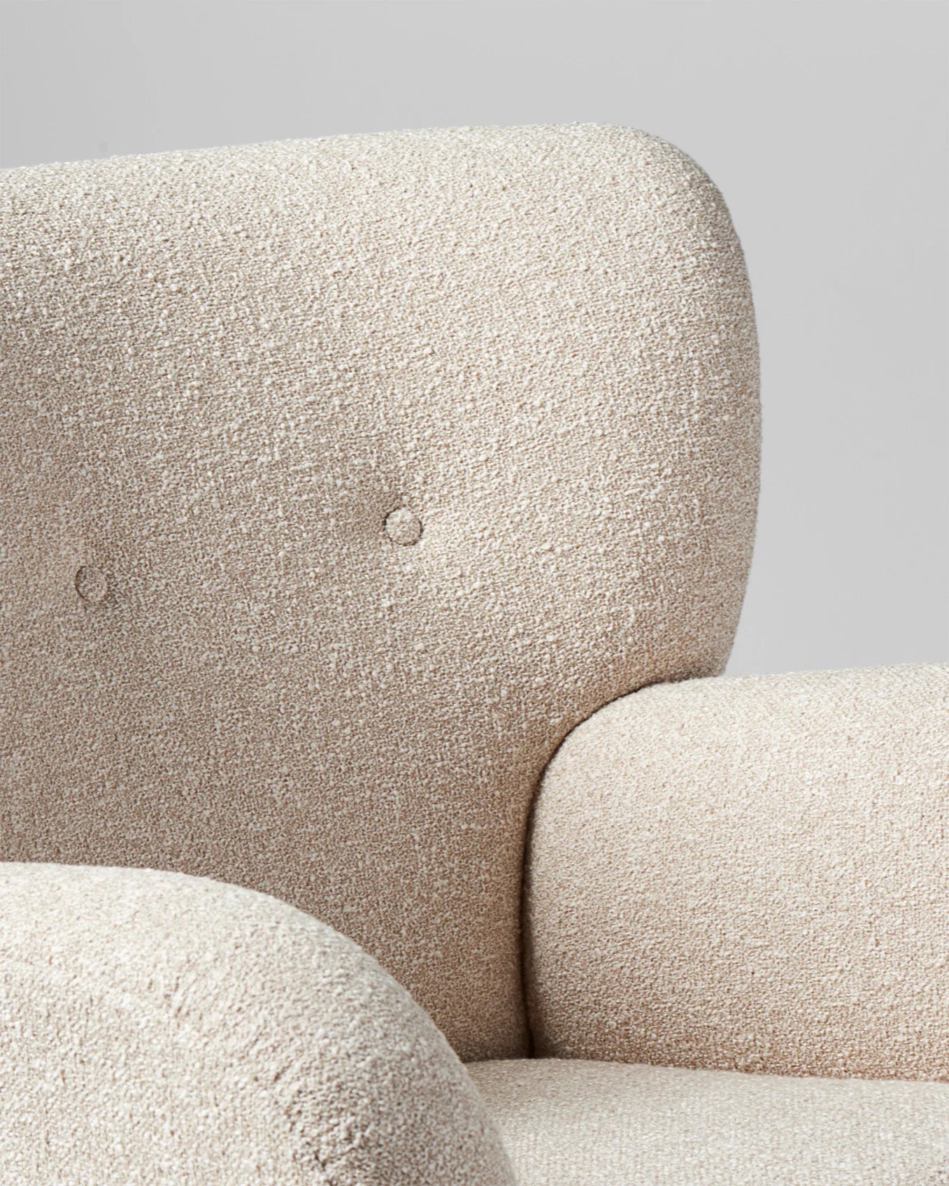 The Karu chair is a contemporary update of a classic design first produced in Finland by the Haimi Oy company in the early 1950s. The inviting curved arms and subtle winged back are the epitome of the post-war Nordic aesthetic. Karu offers perfect proportions for a bedroom or living room chair. Shown in Zero from Sahco by Kvadrat, a soft and luxurious bouclé fabric.