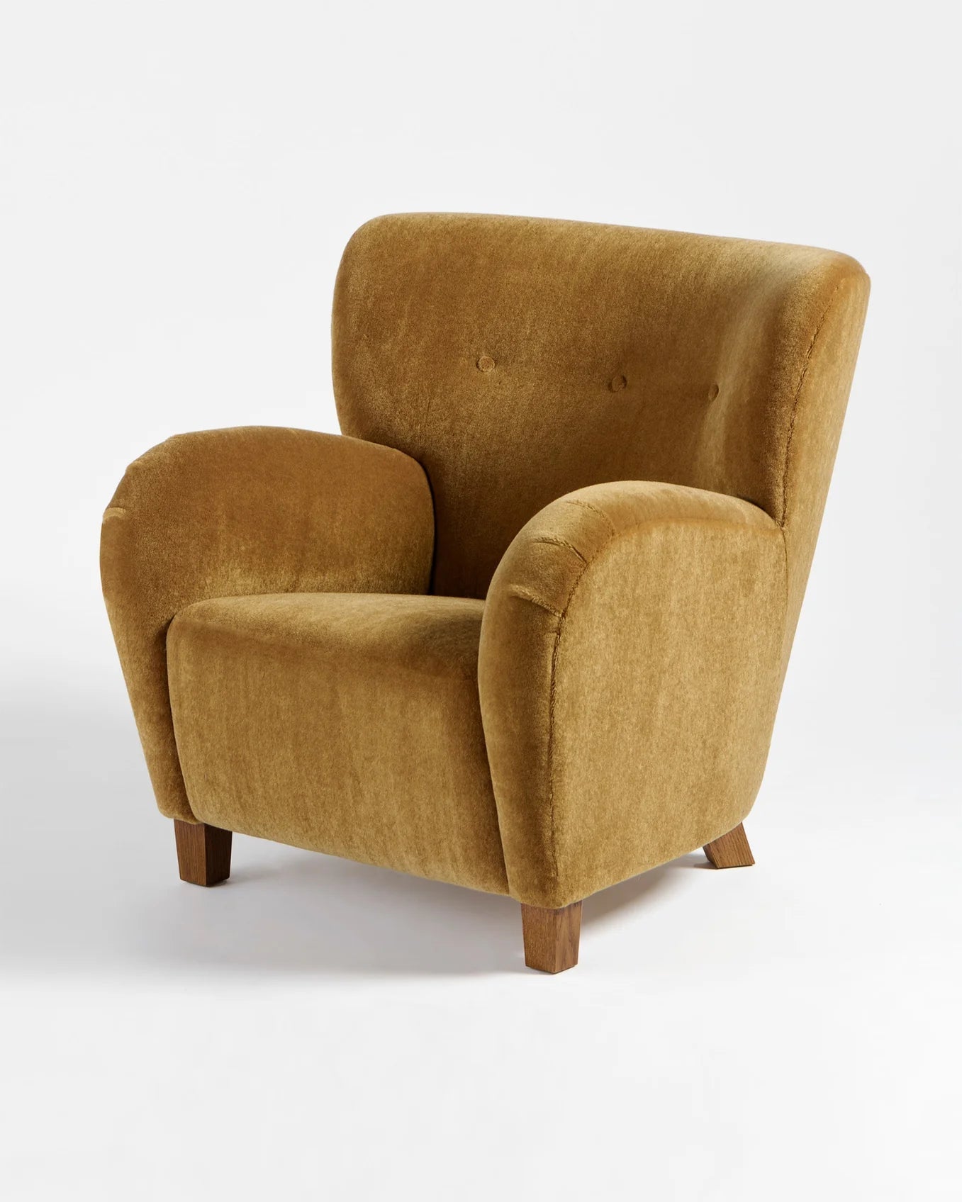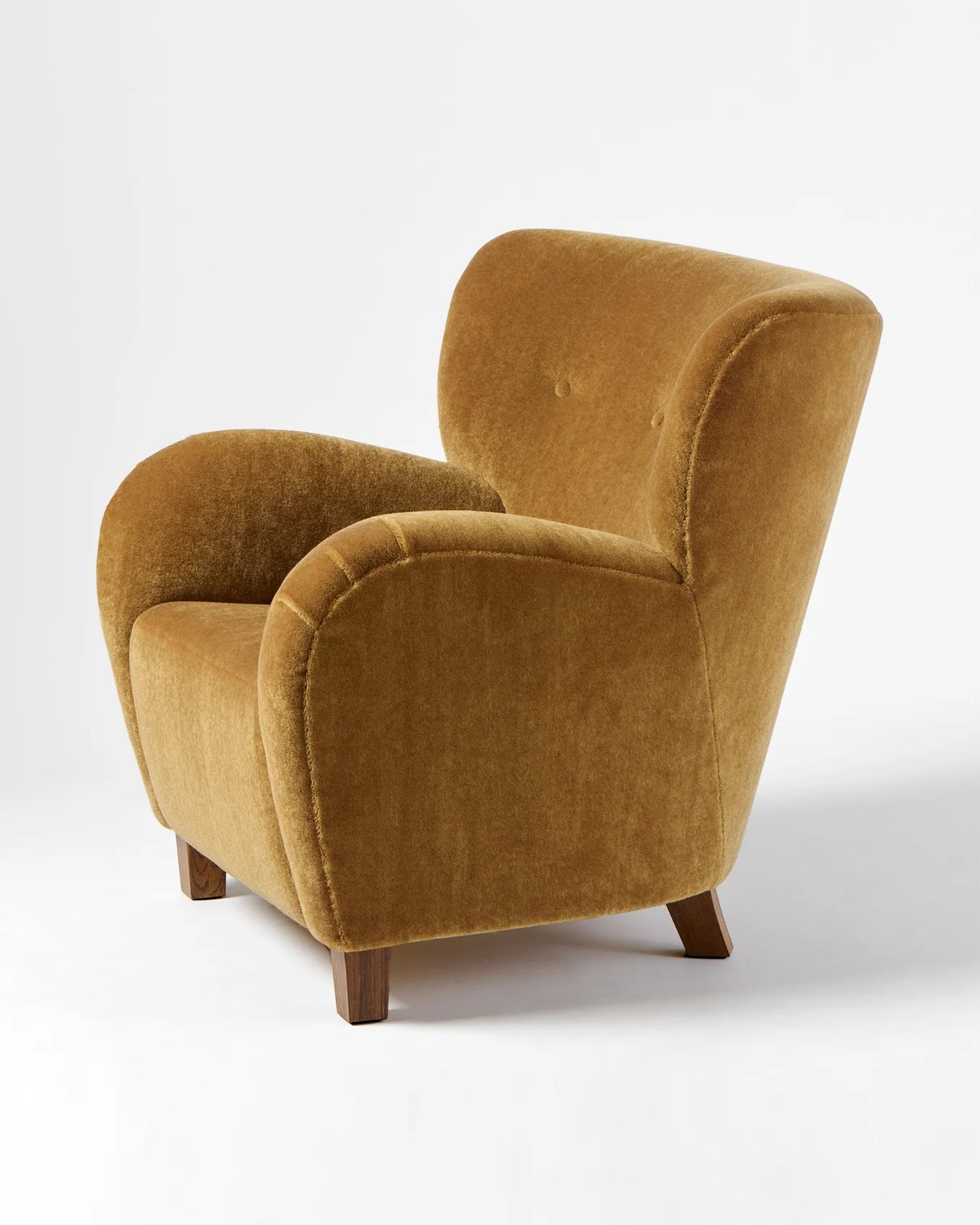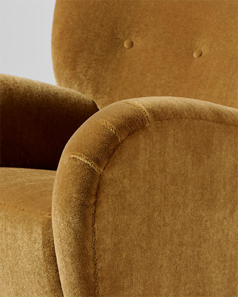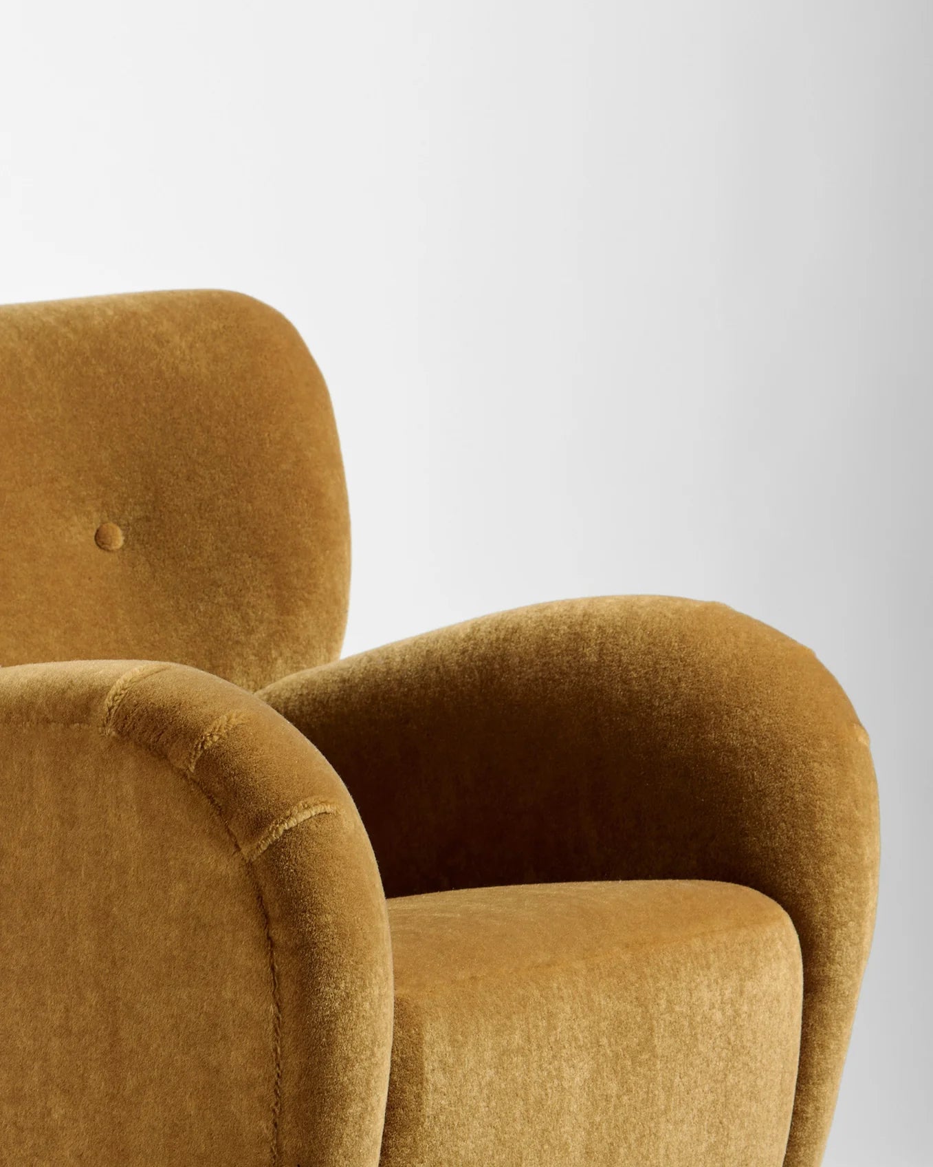 The Karu chair is a contemporary update of a classic design first produced in Finland by the Haimi Oy company in the early 1950s. The inviting curved arms and subtle winged back are the epitome of the post-war Nordic aesthetic. Karu offers perfect proportions for a bedroom or living room chair. Shown in Pierre Frey's gorgeous long-pile Teddy Mohair.