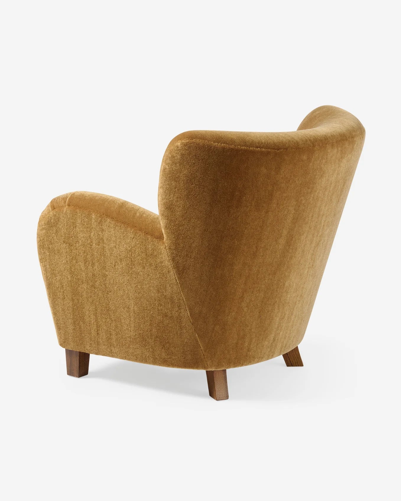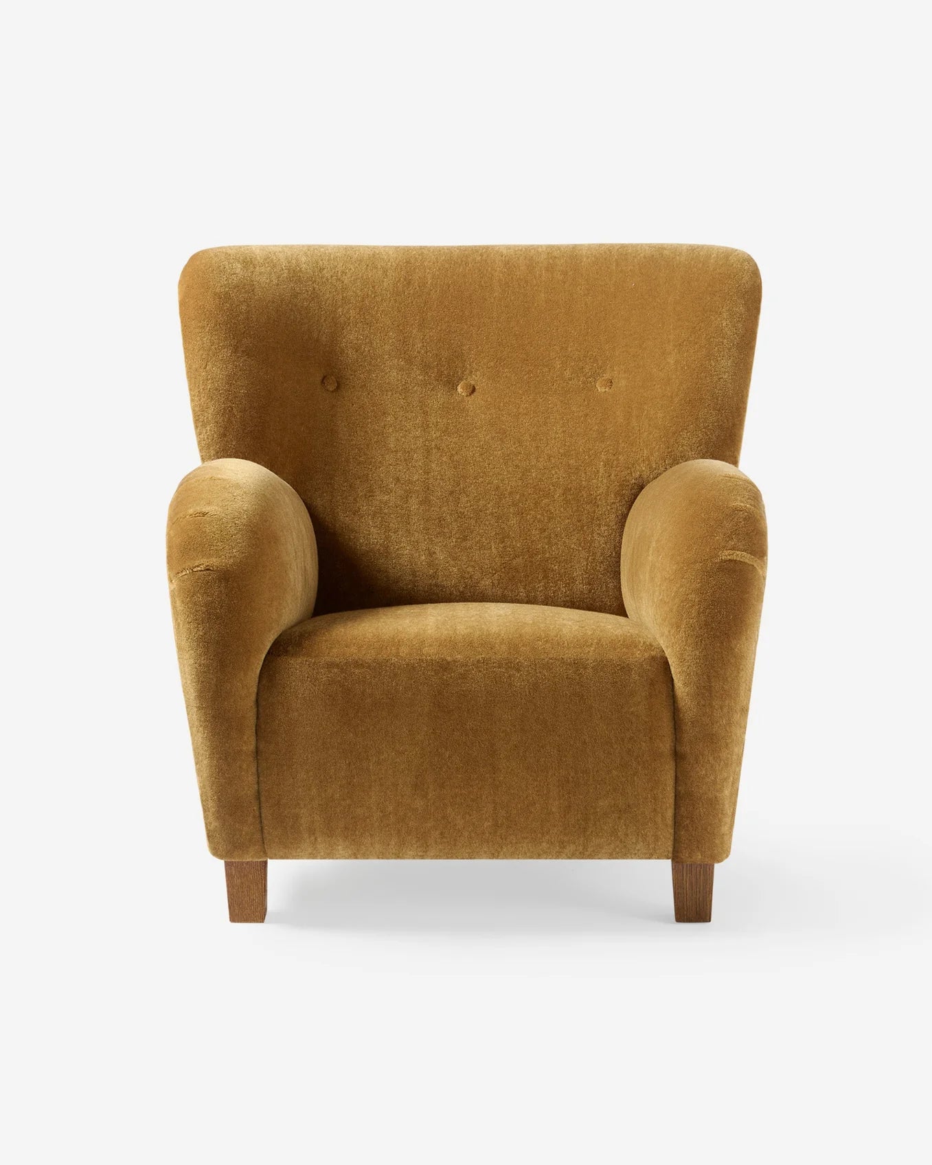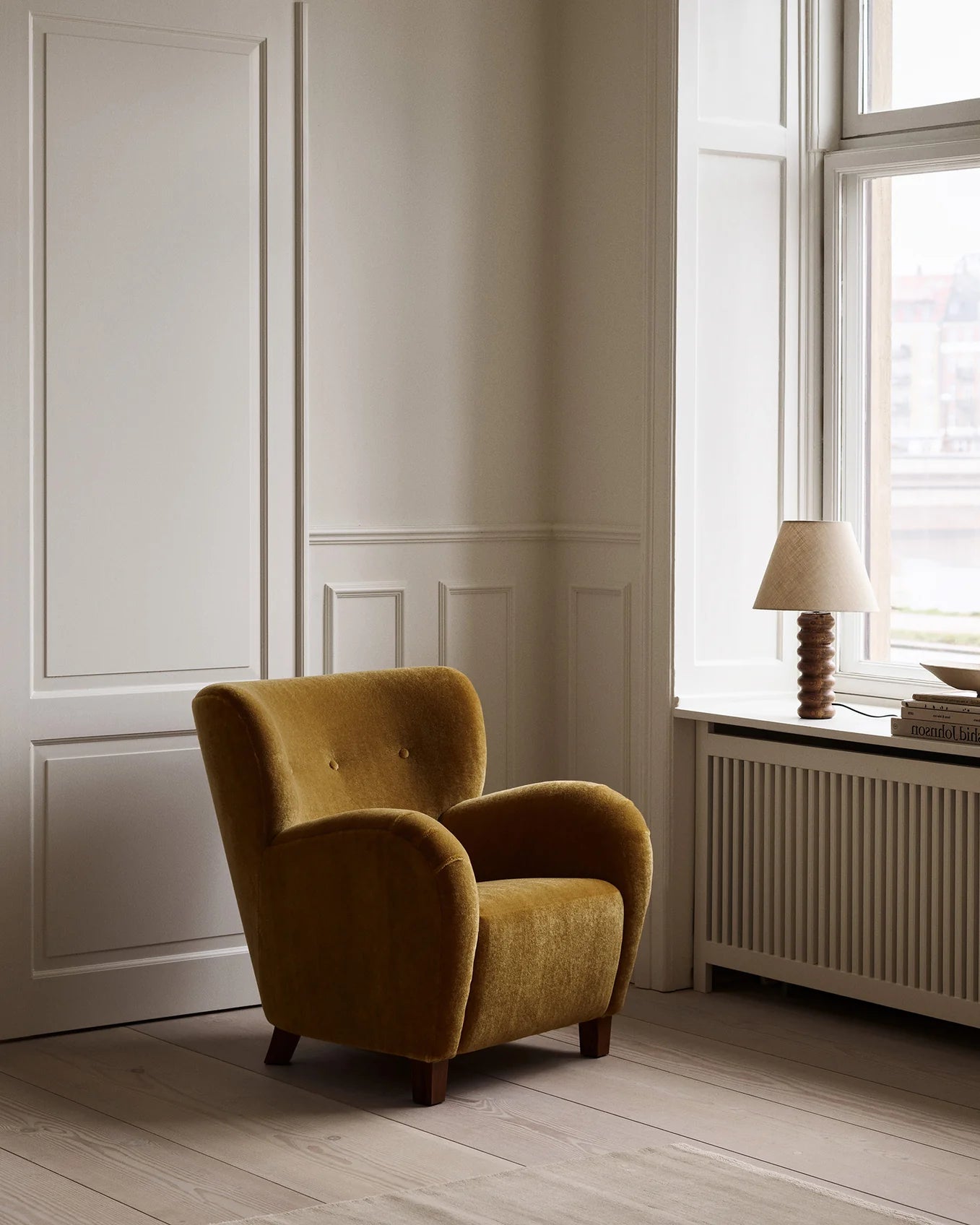 The Karu chair is a contemporary update of a classic design first produced in Finland by the Haimi Oy company in the early 1950s. The inviting curved arms and subtle winged back are the epitome of the post-war Nordic aesthetic. Karu offers perfect proportions for a bedroom or living room chair. Shown in Pierre Frey's gorgeous long-pile Teddy Mohair.