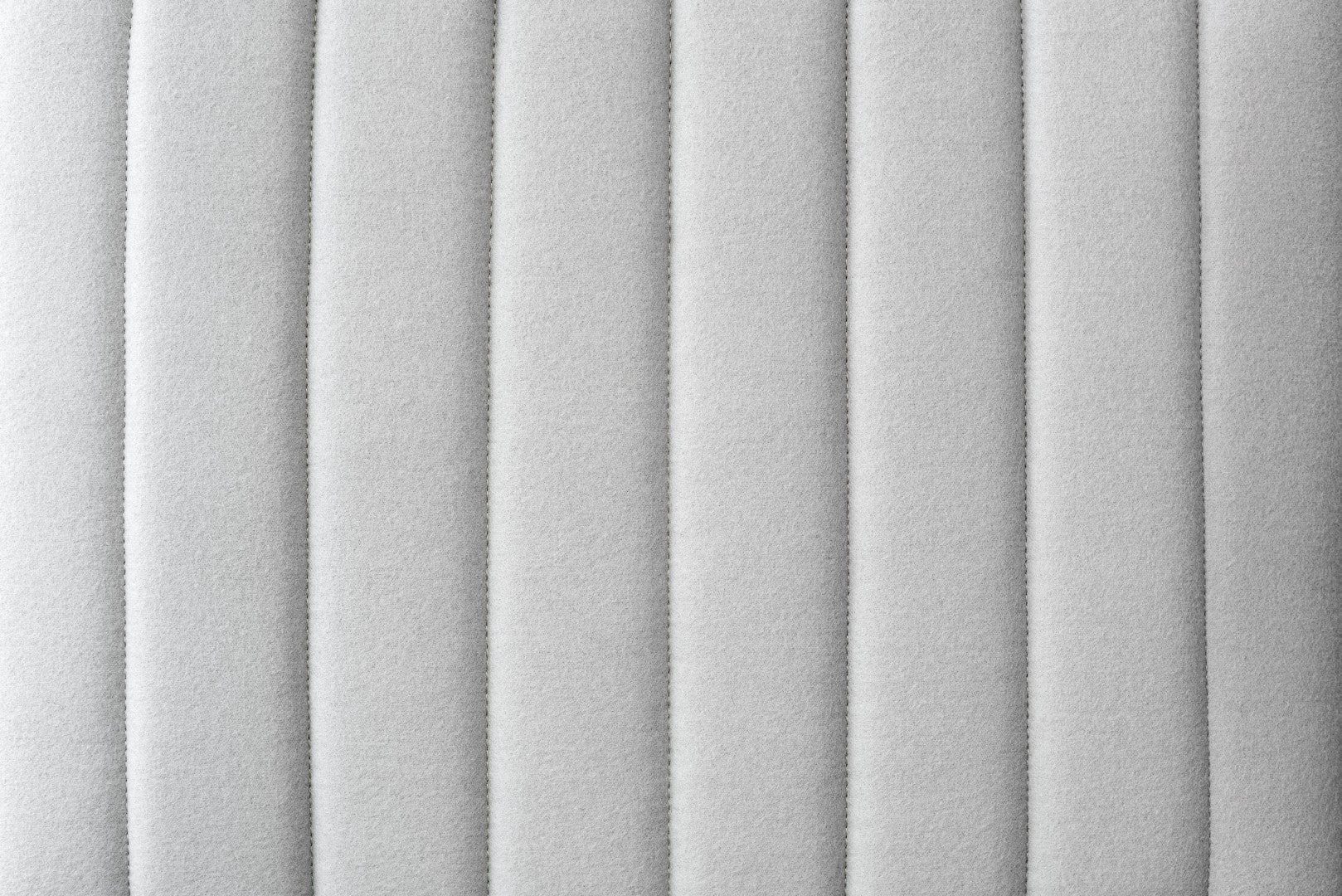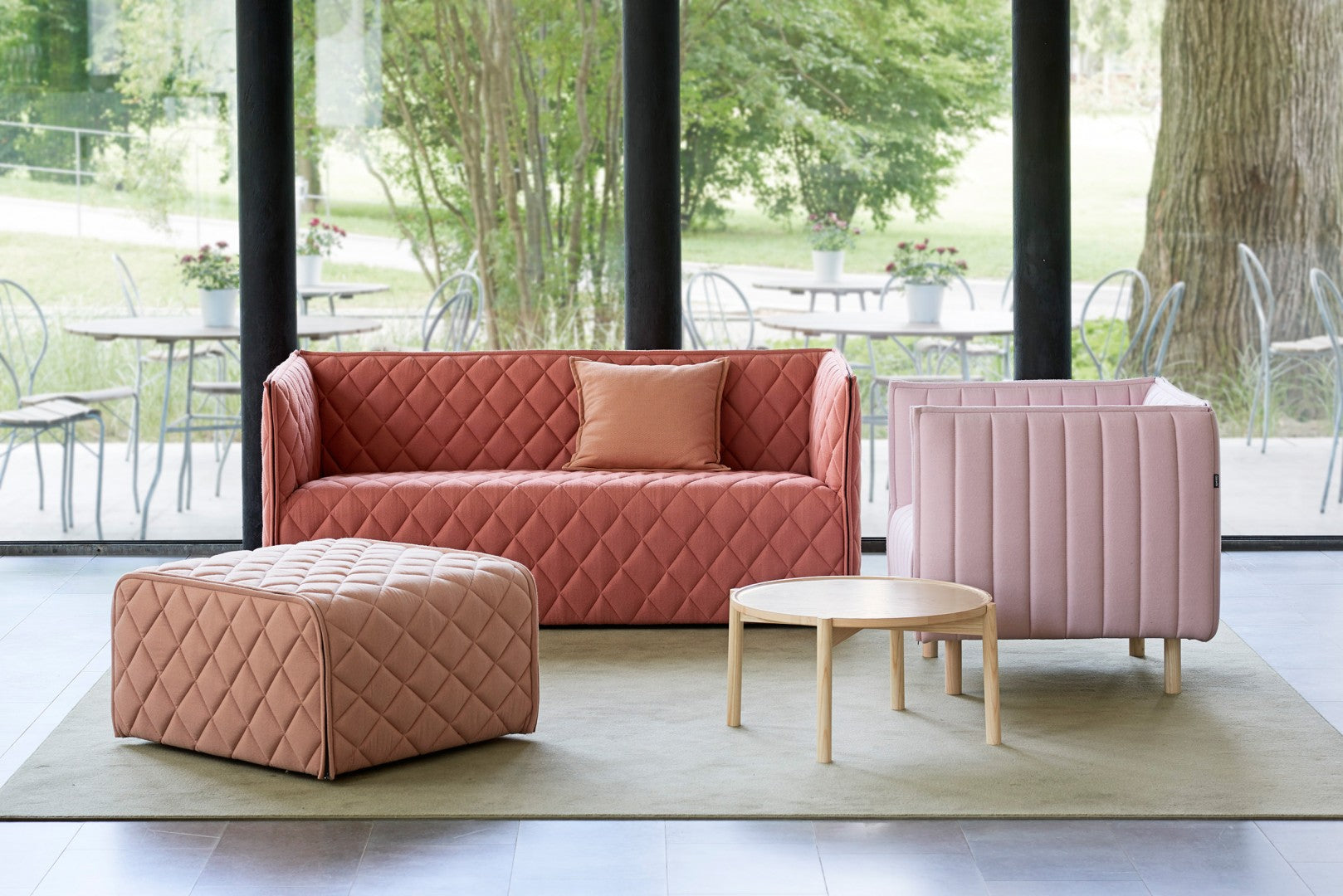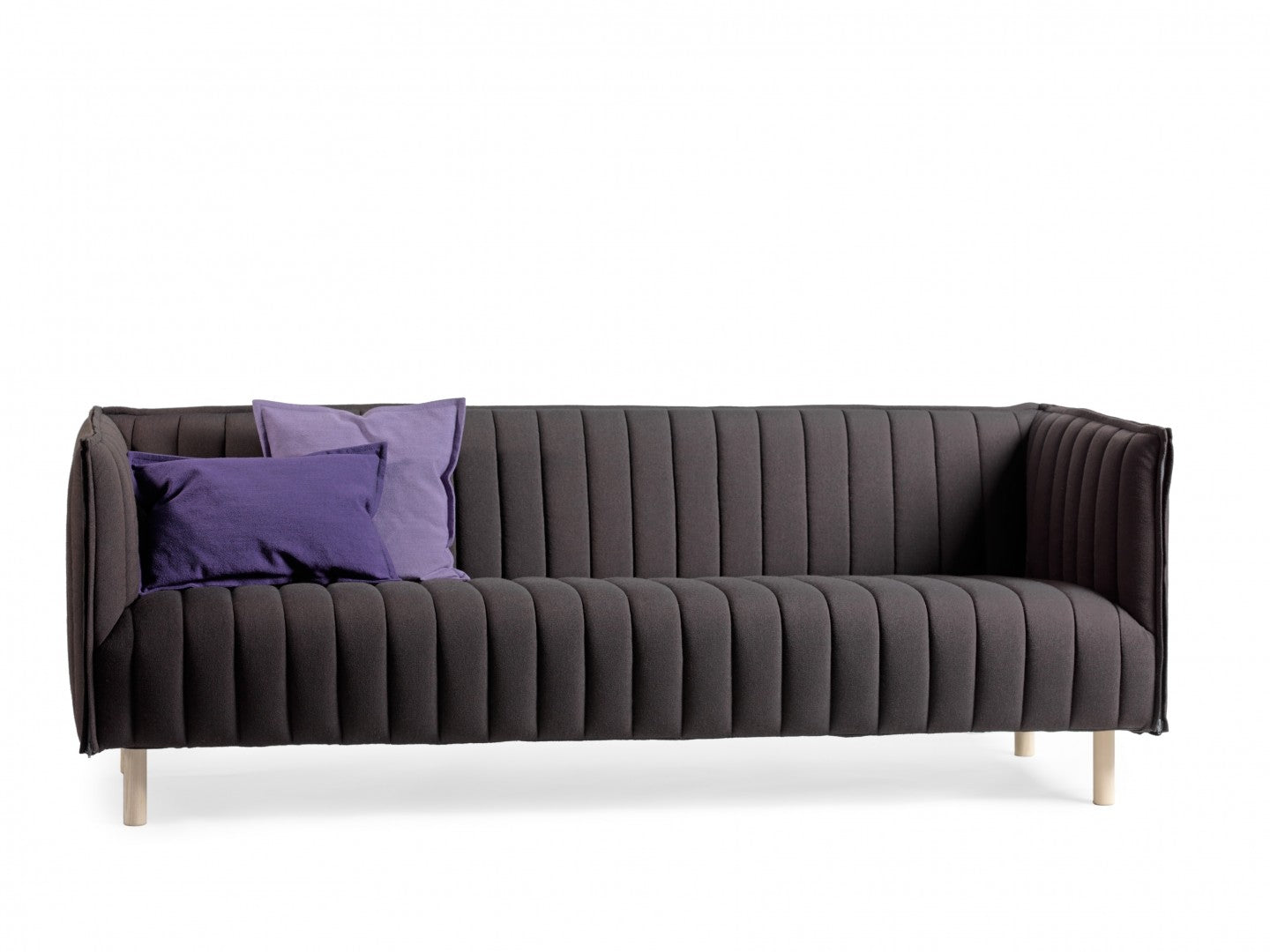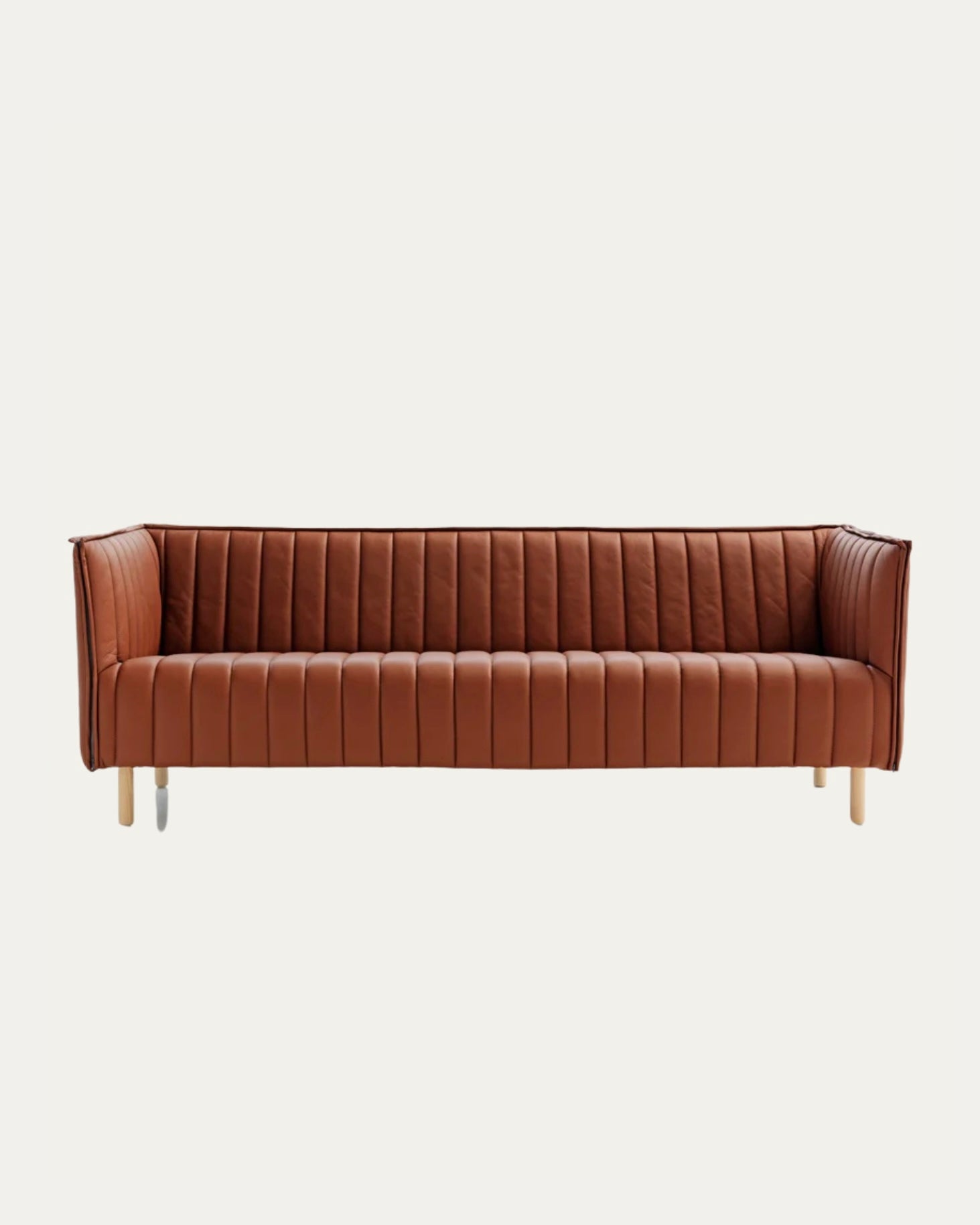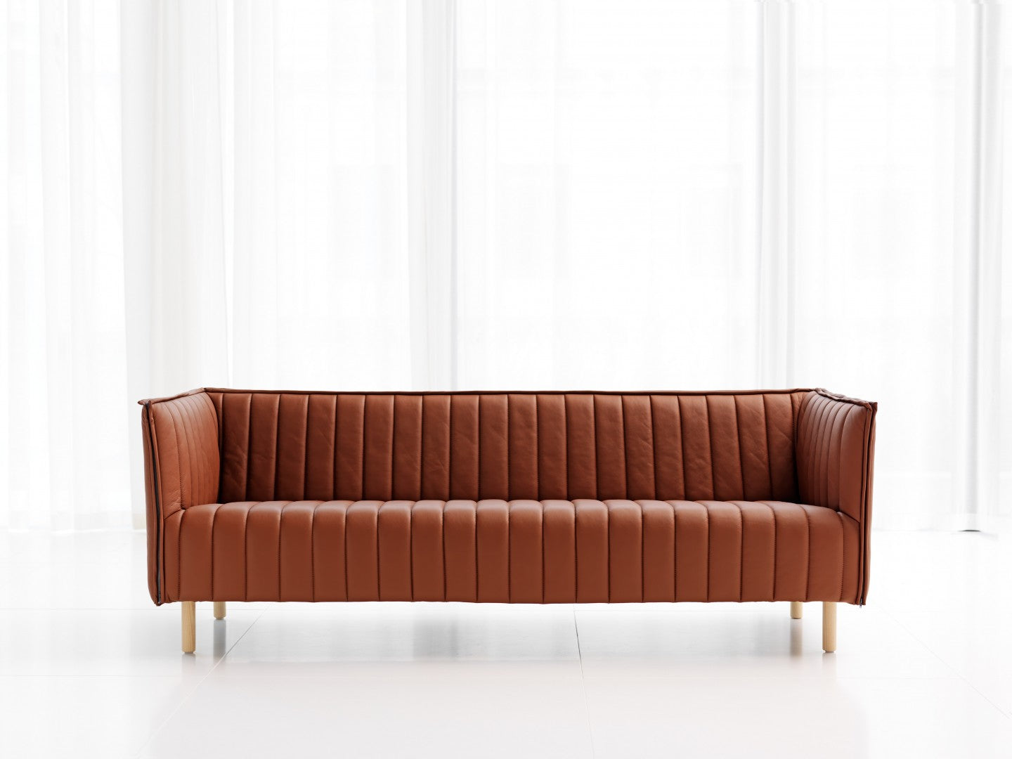 Sofa offered in a 2 or 3 seat design and fully upholstered in fabric or leather. Frame in solid wood with Nozag springs in seat. Armrests with band for elasticity. Standard: Vertical quilting. Available in Harlequin quilting at an additional cost. Choose between visible legs (solid ash) or base. Plastic glides.