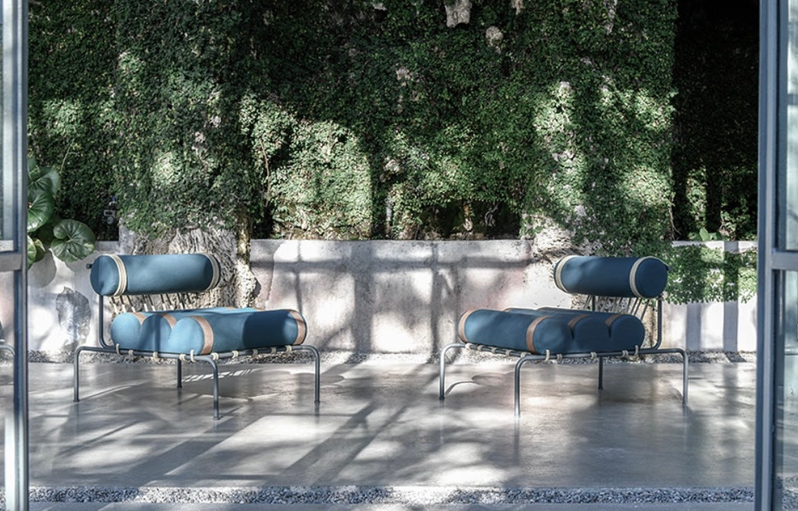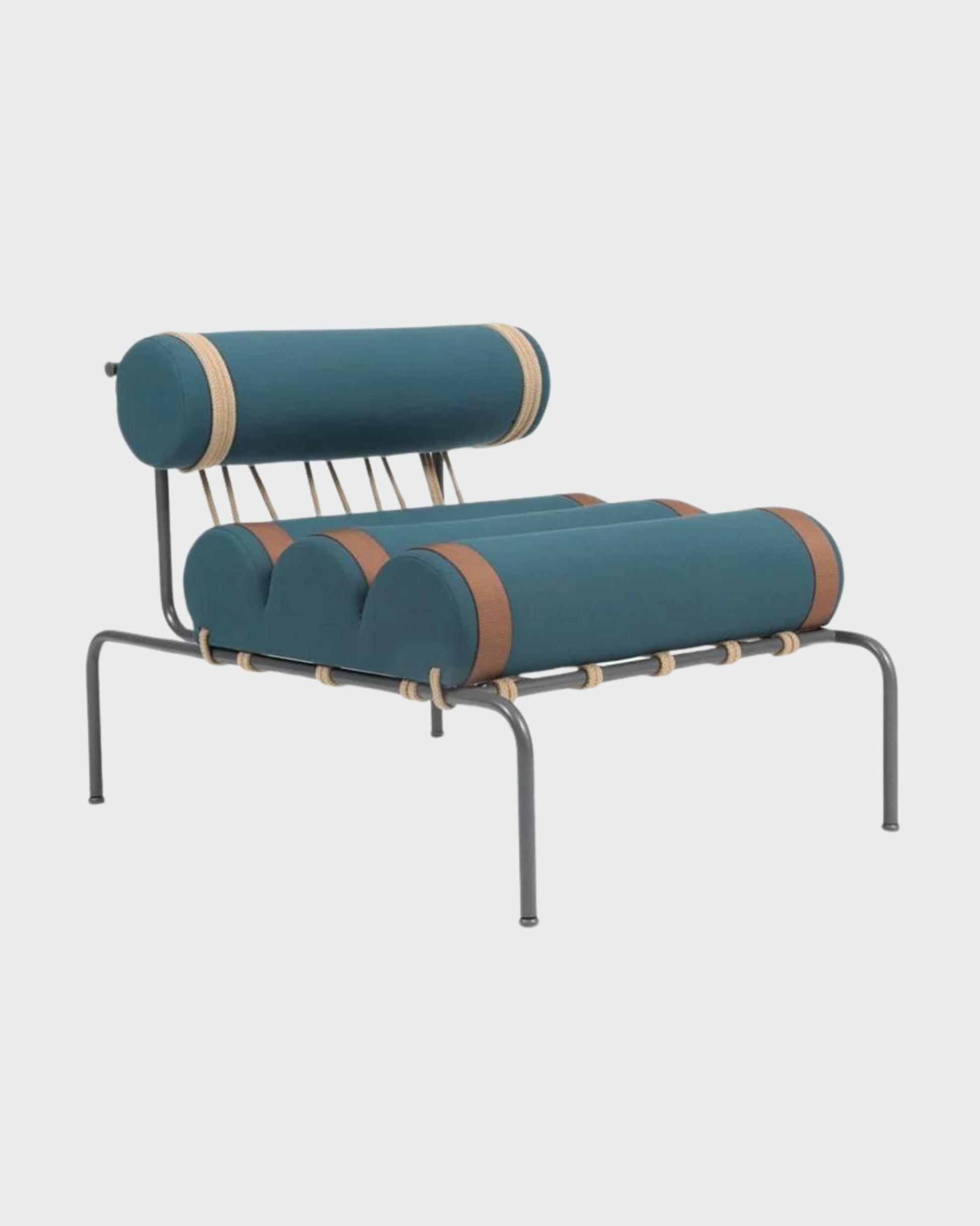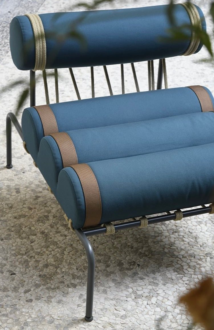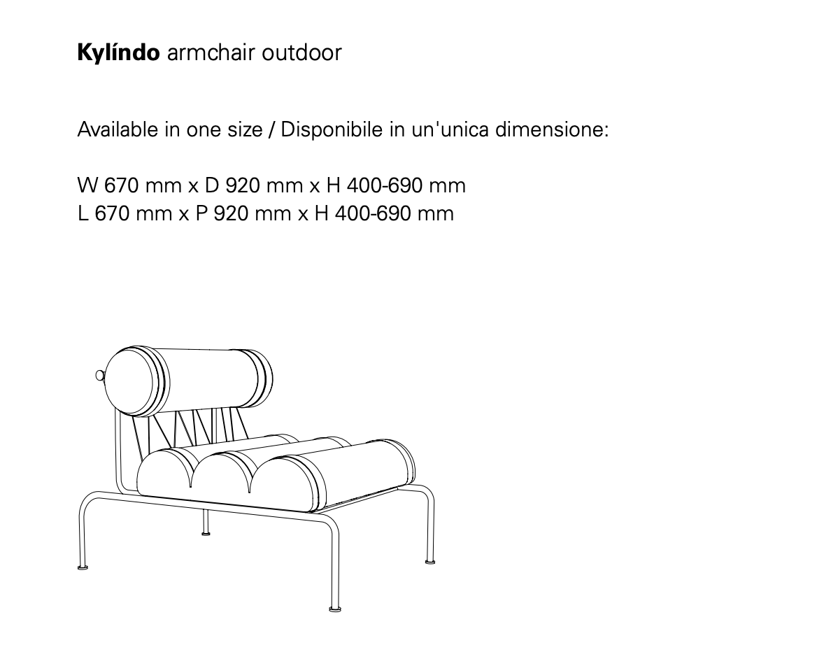 The Kylíndo armchair is an outdoor seat with reimagined proportions. Born from an extrusion of cylinders, a geometric figure derived from the complete rotation of a rectangle around one of its sides. The low seat is designed to create a cosy and intimate environment with the surrounding nature. Water-repellent fabrics and nautical-inspired tops create sophisticated combinations and contrasts, ideal for a poolside or yacht deck.