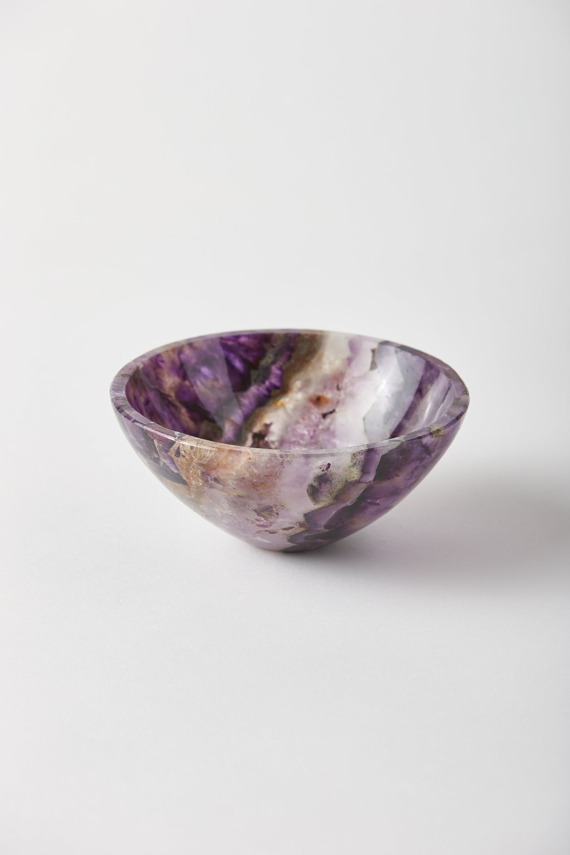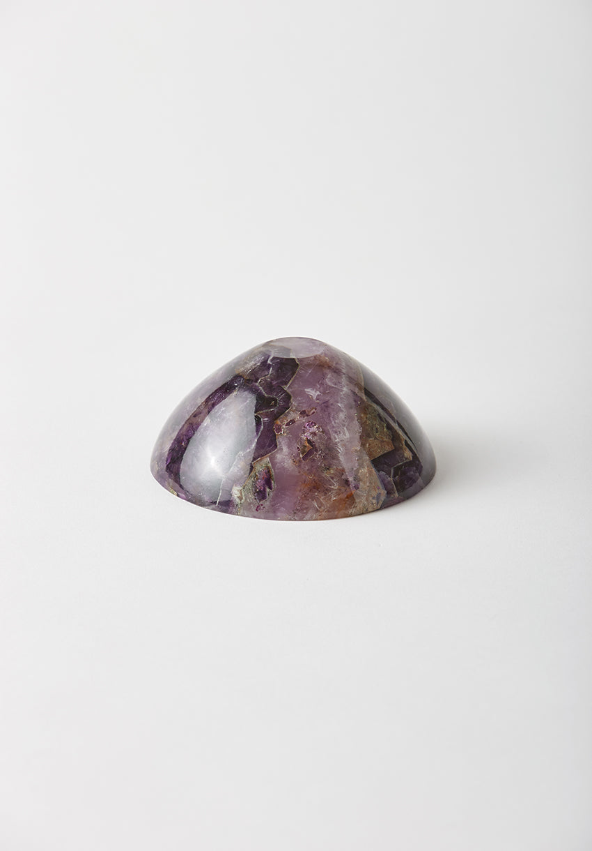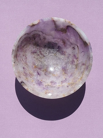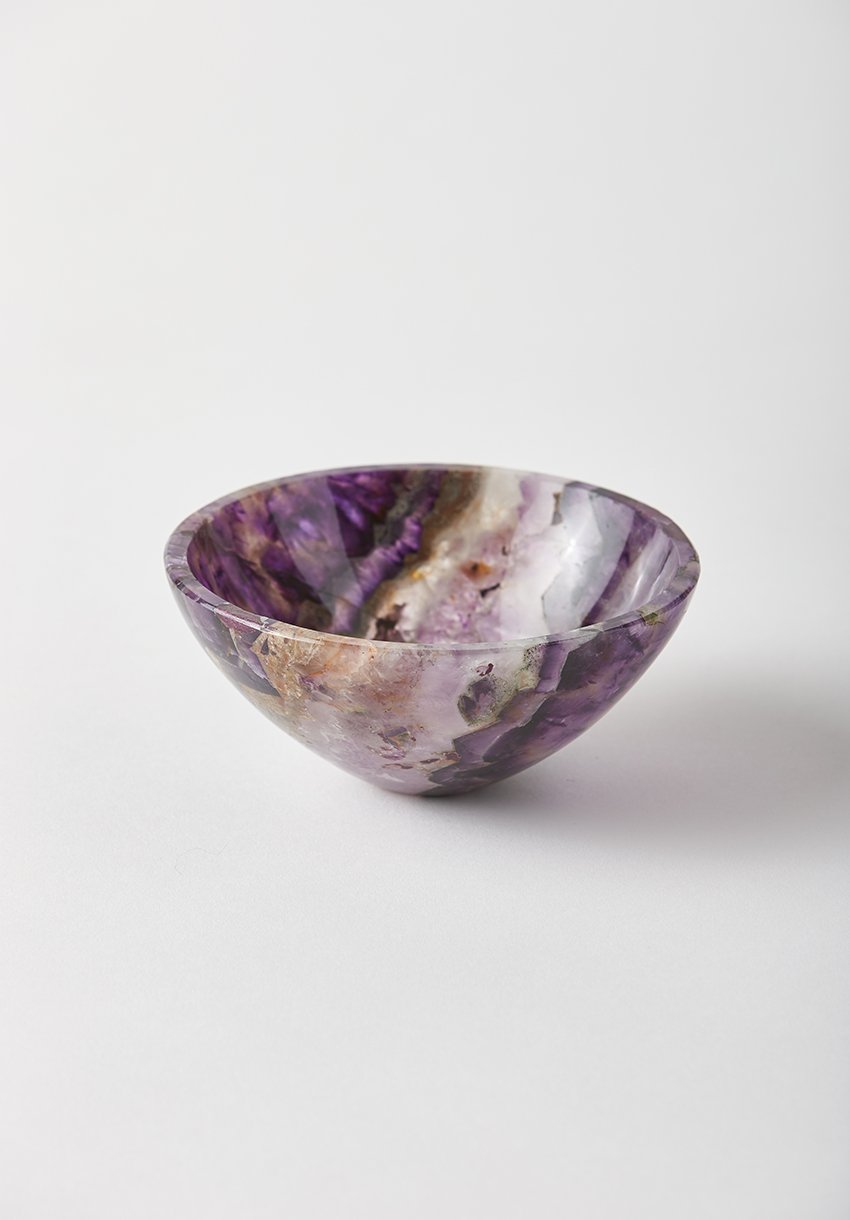 The bowl explores the full gradient of the captivating amethyst stone. Hand carved. Due to the nature of the stone, no two bowls are alike. Each bowl is unique due to variances within the stone and the fact that they are hand made. Made in India.