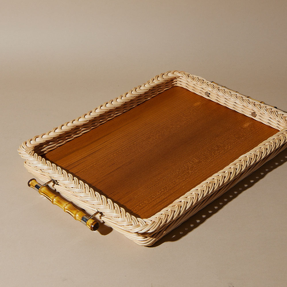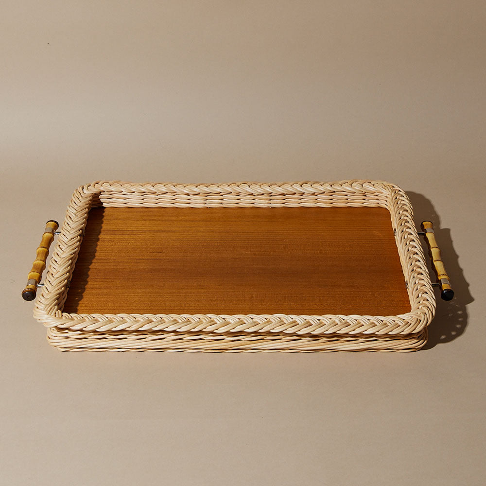 Tray realized in rattan hand woven by local artisans and teak, with bamboo handles. Large size.