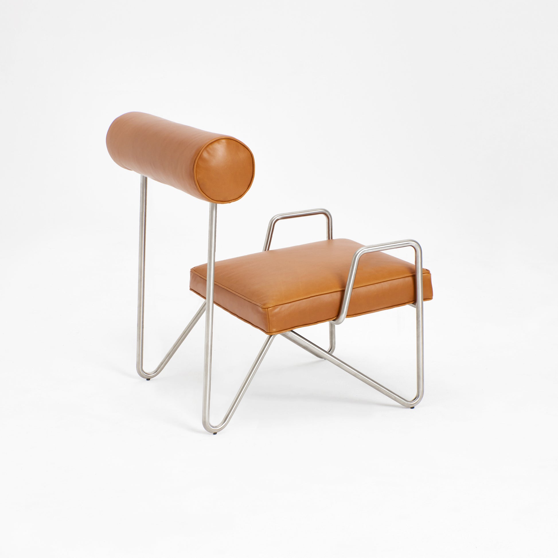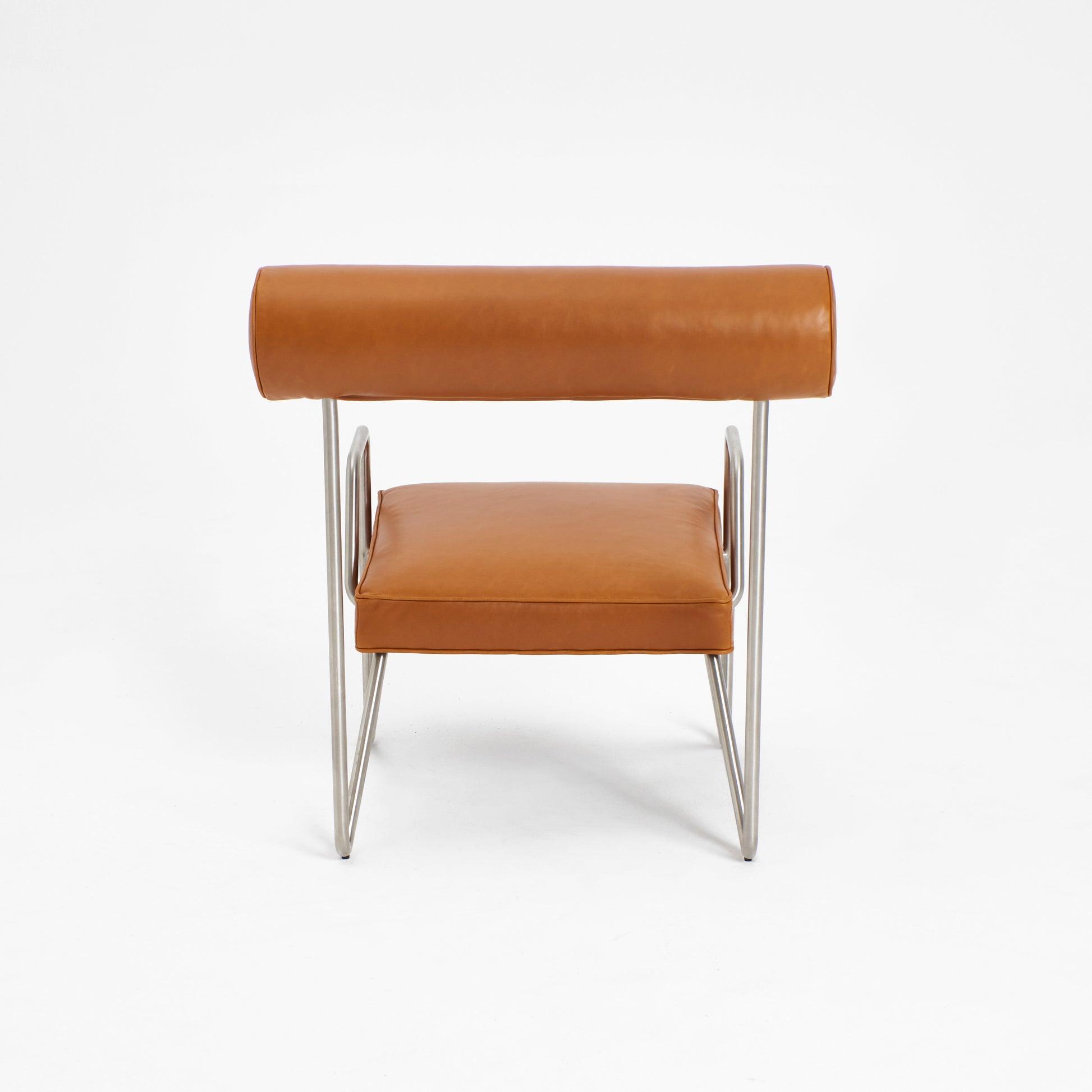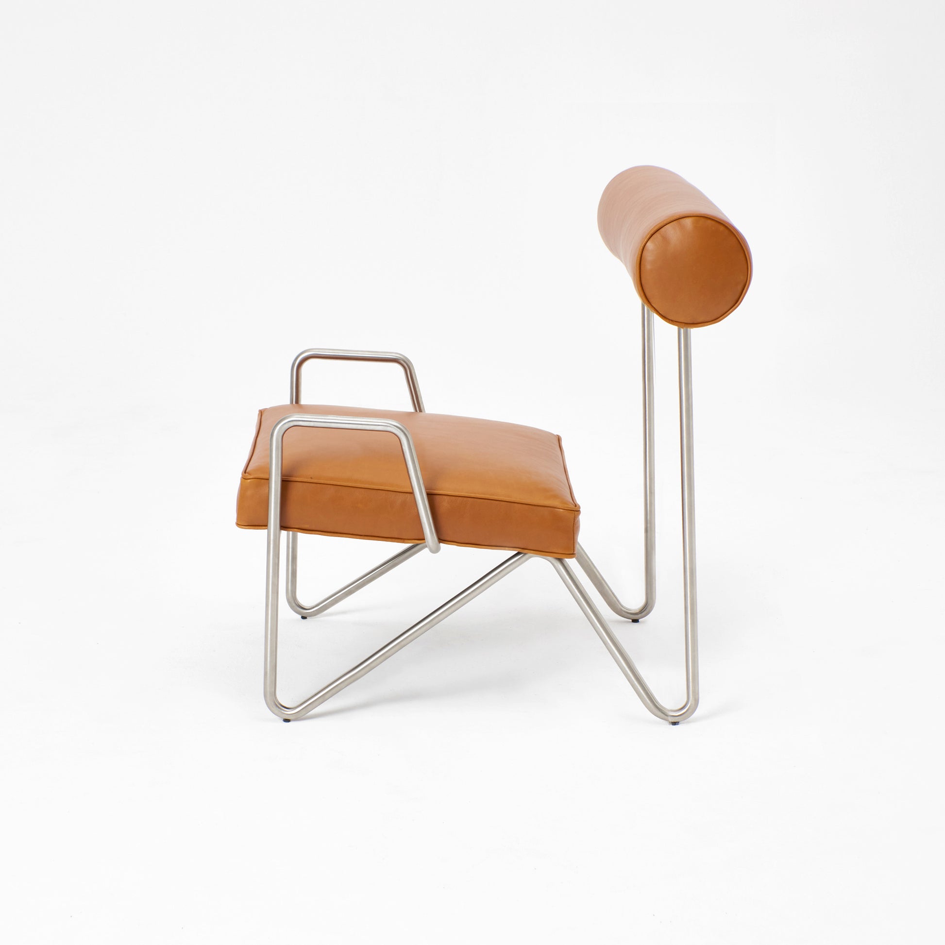 Simple yet ingenious, a continuous metal frame bent and shaped to form the base for a rich natural leather seat. The frame is engineered by shaping a single metal rod to yield an elegant, minimalistic design. Combined with rich sustainable leather of the seat and the backrest. The lounge chair tailors itself for both classical and modern surroundings.
