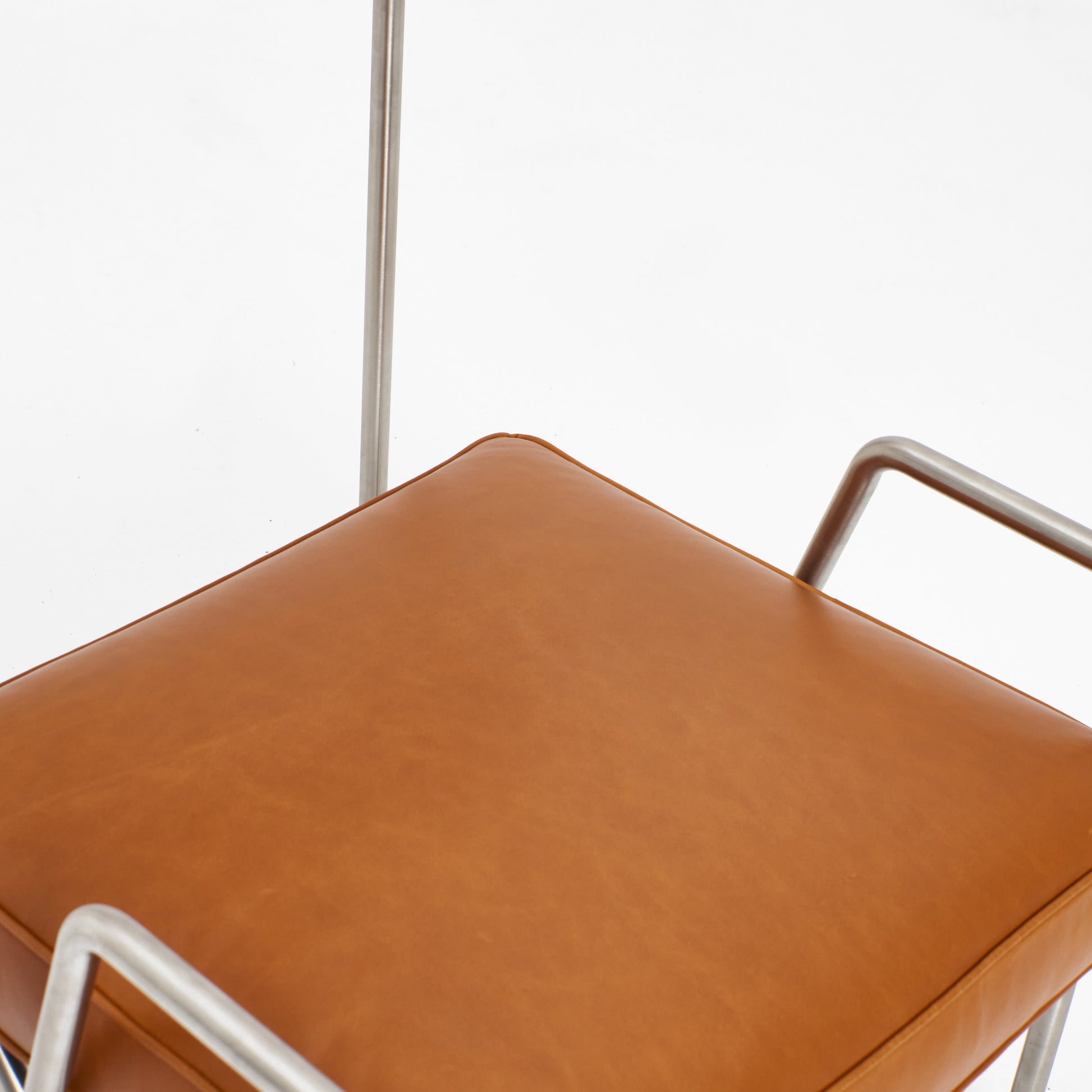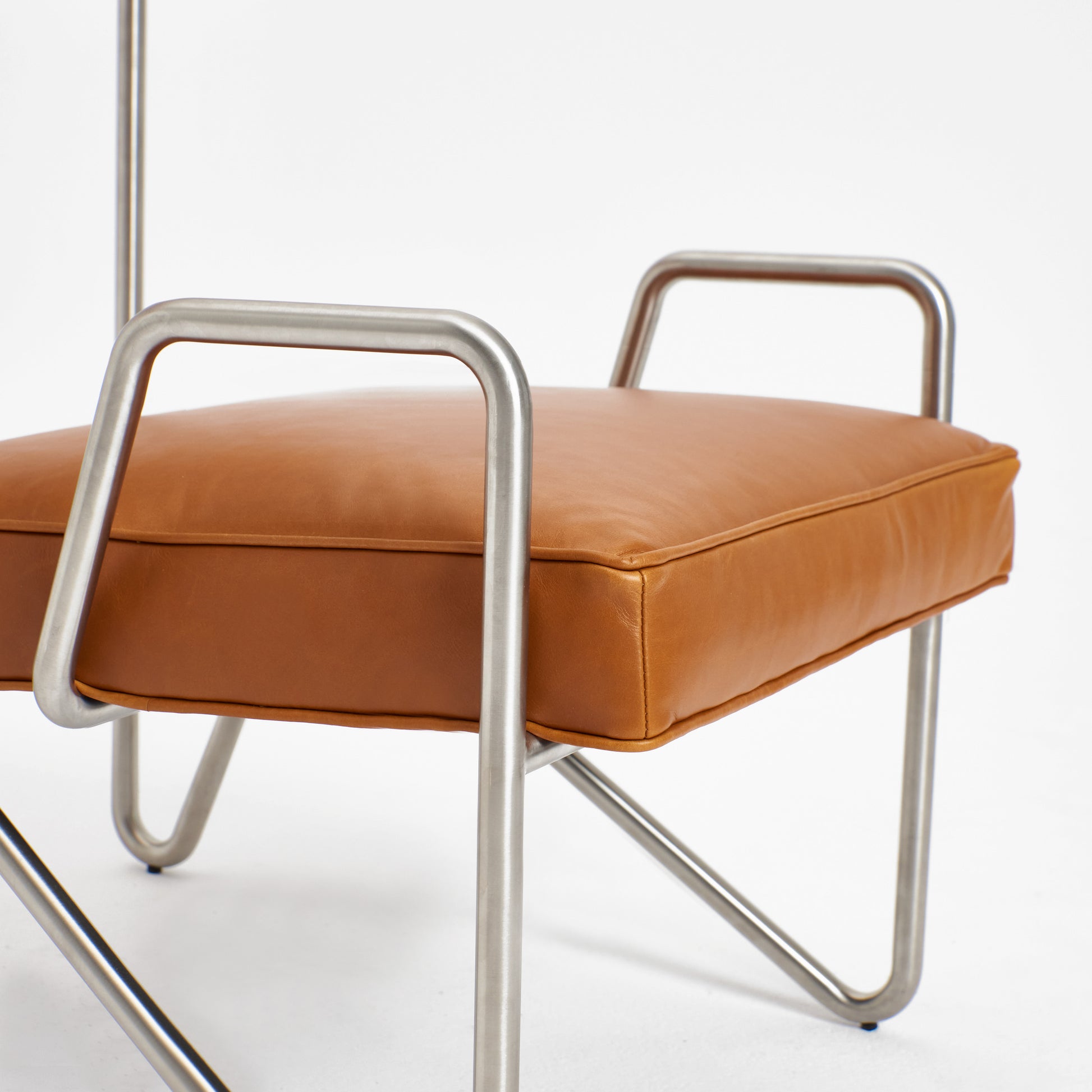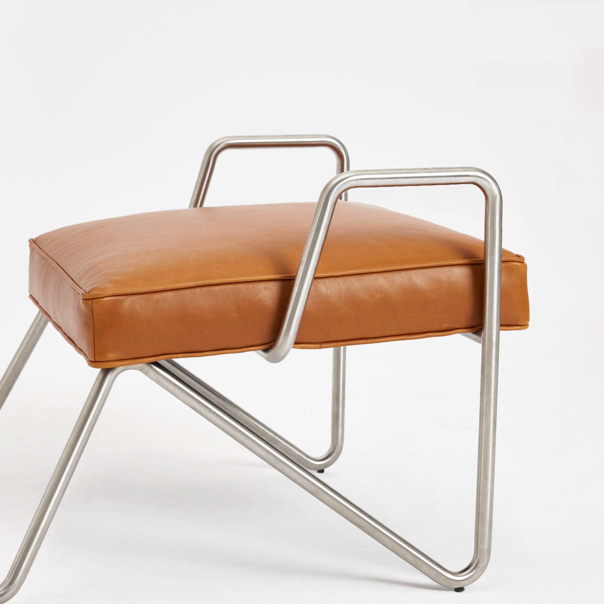 Simple yet ingenious, a continuous metal frame bent and shaped to form the base for a rich natural leather seat. The frame is engineered by shaping a single metal rod to yield an elegant, minimalistic design. Combined with rich sustainable leather of the seat and the backrest. The lounge chair tailors itself for both classical and modern surroundings.