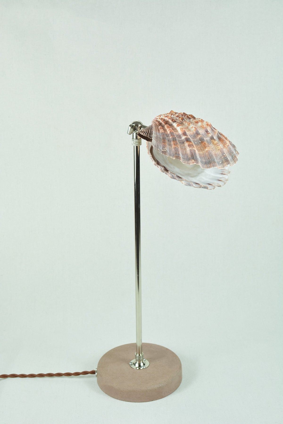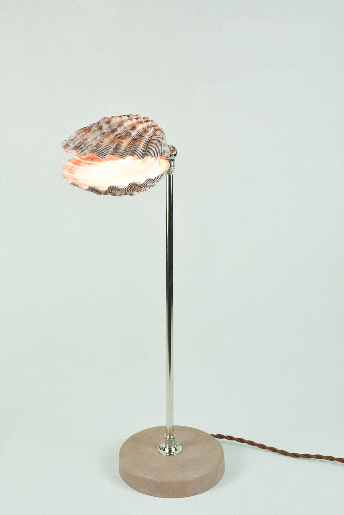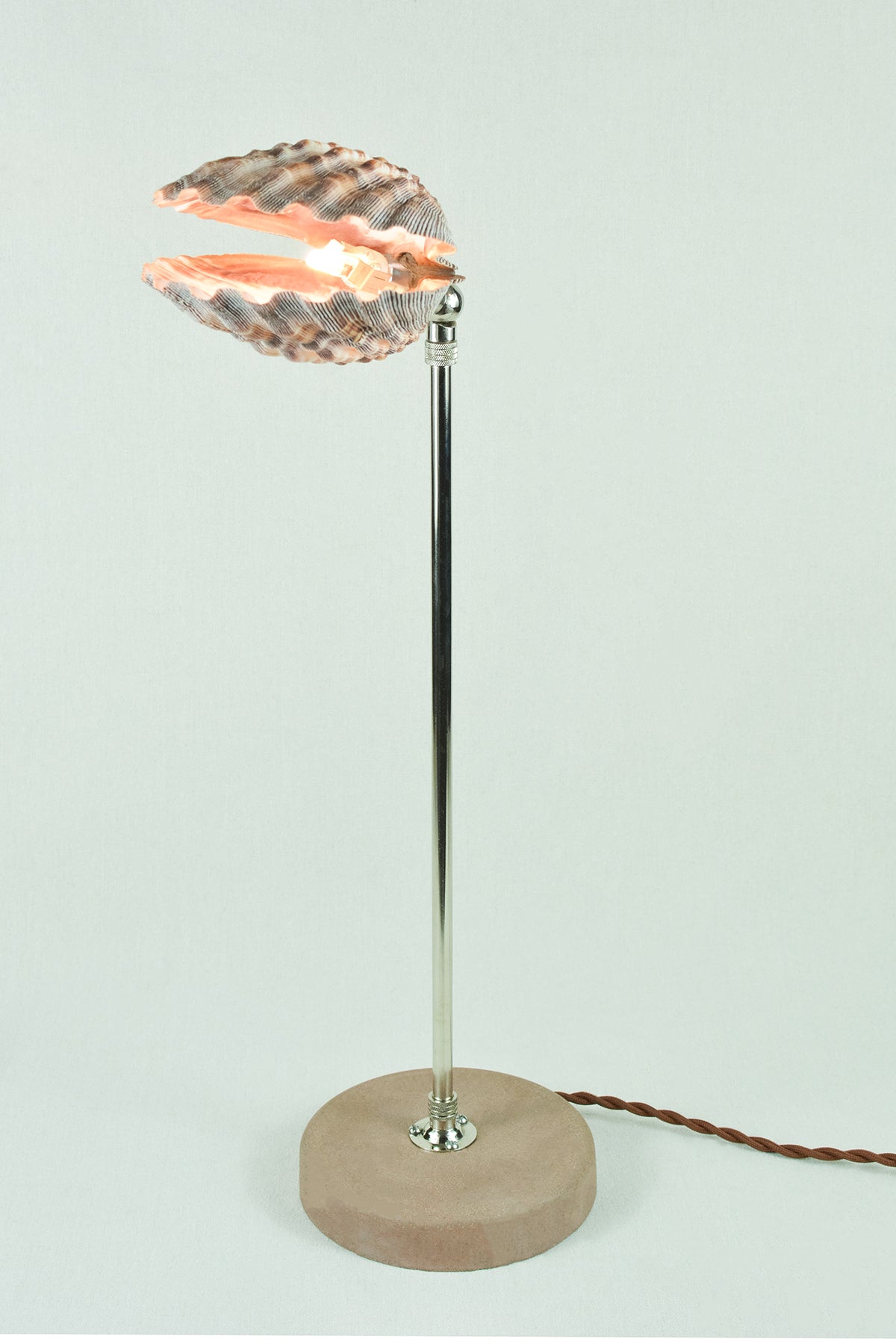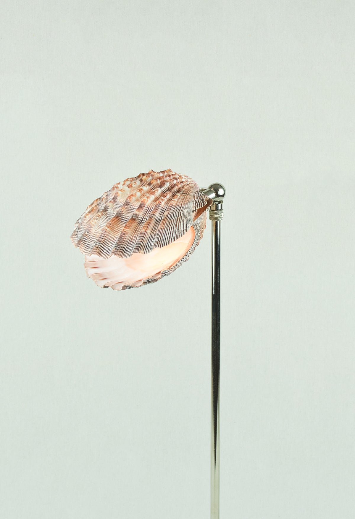 Permanently fused open at the scallop's natural hinge, the shade is fully adjustable on the vertical axis. Perfect as a scene-stealing accent lamp—and even better at one's bedside, in a pair—its playful silhouette, sophisticated lines, rarefied materials, and inviting light will breathe fresh life into any interior.