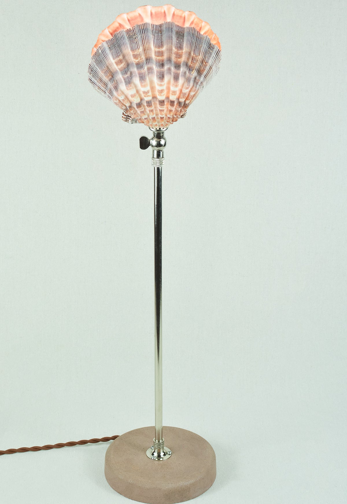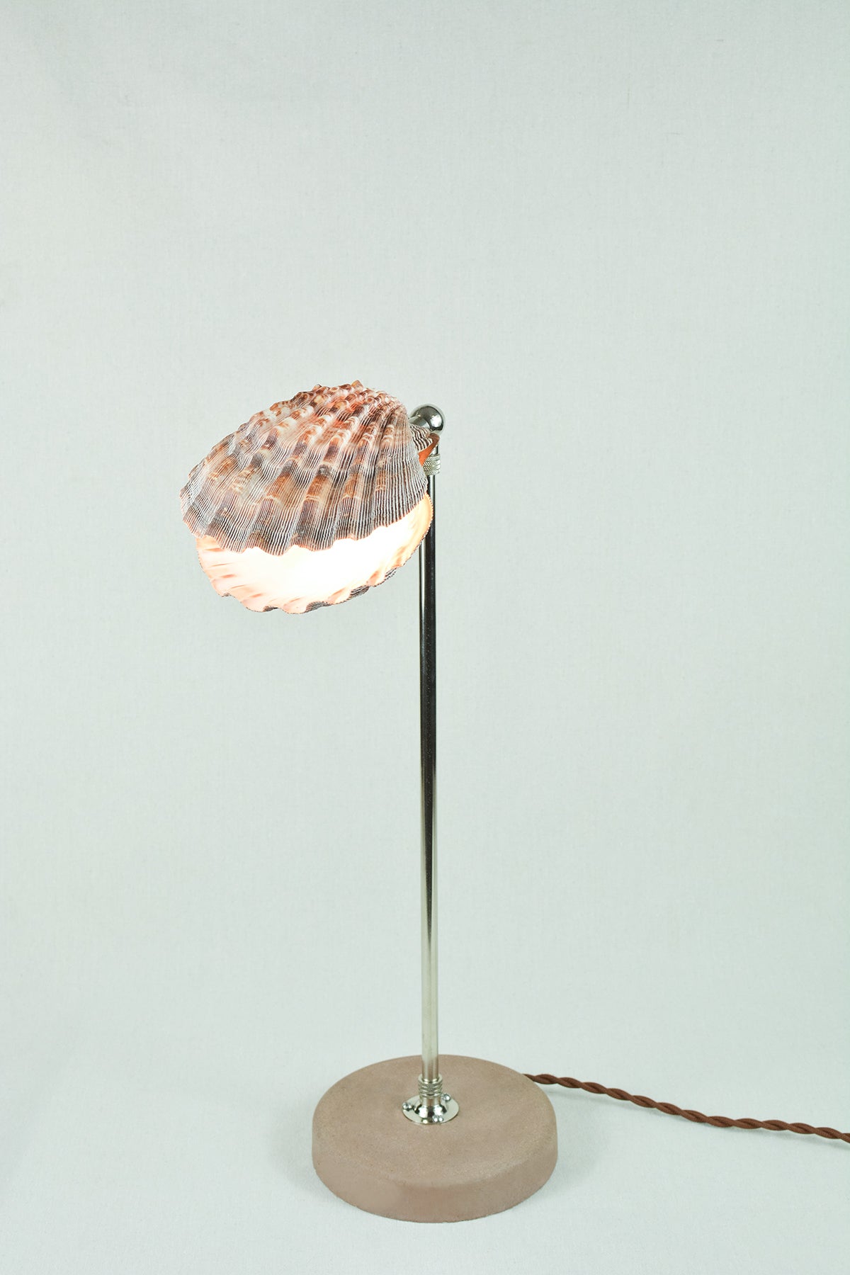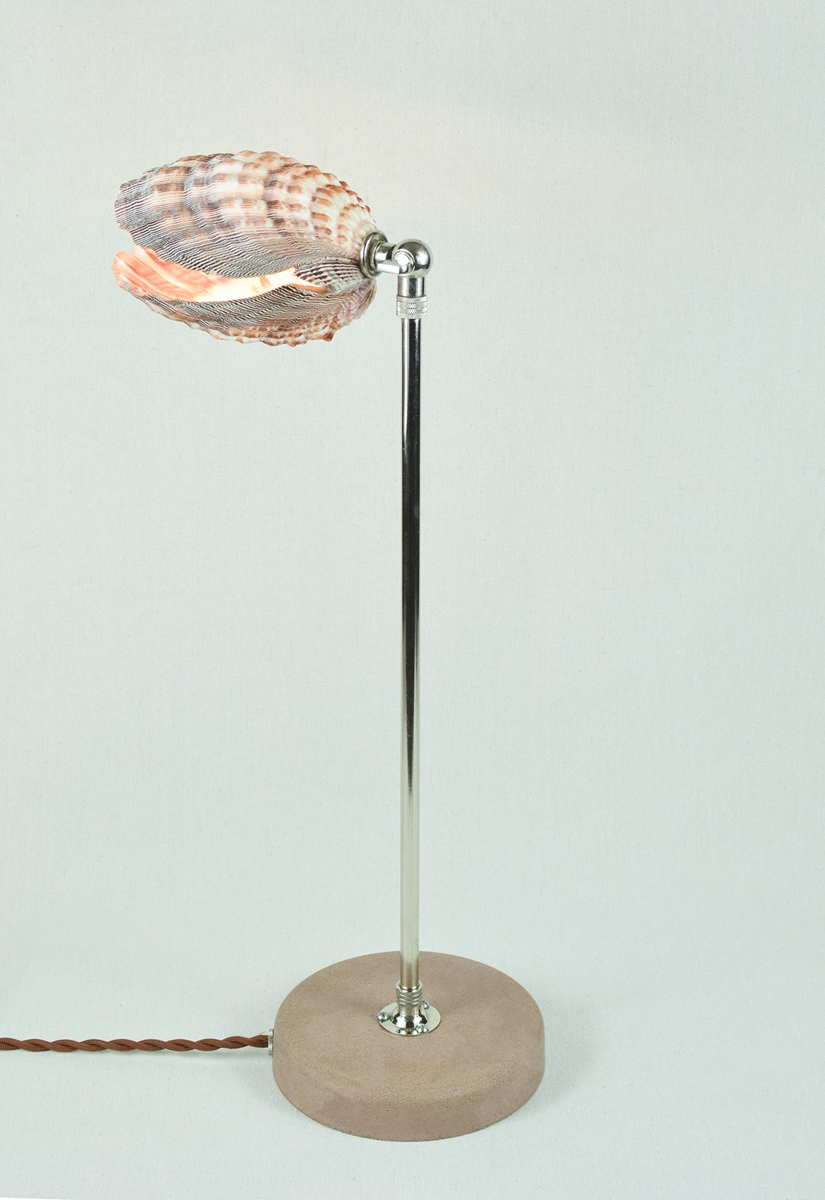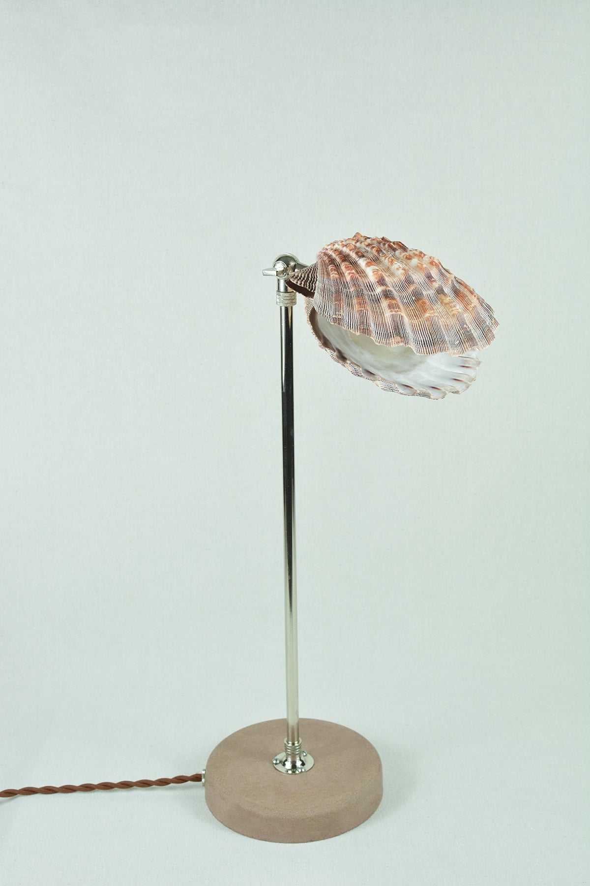 Permanently fused open at the scallop's natural hinge, the shade is fully adjustable on the vertical axis. Perfect as a scene-stealing accent lamp—and even better at one's bedside, in a pair—its playful silhouette, sophisticated lines, rarefied materials, and inviting light will breathe fresh life into any interior.