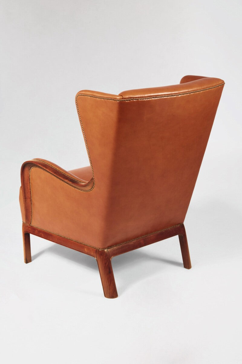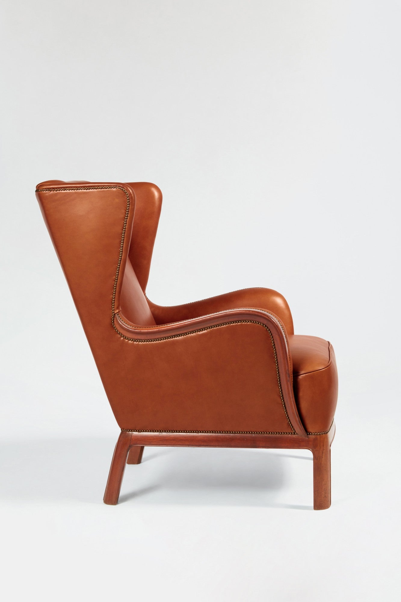 Frits Henningsen was a cabinet maker and known for his labor-intensive, hand-built furniture items, using hardwoods such as mahogany. This wingback chair is stunning. Expertly reupholstered in a timeless, cognac leather and nailheads.