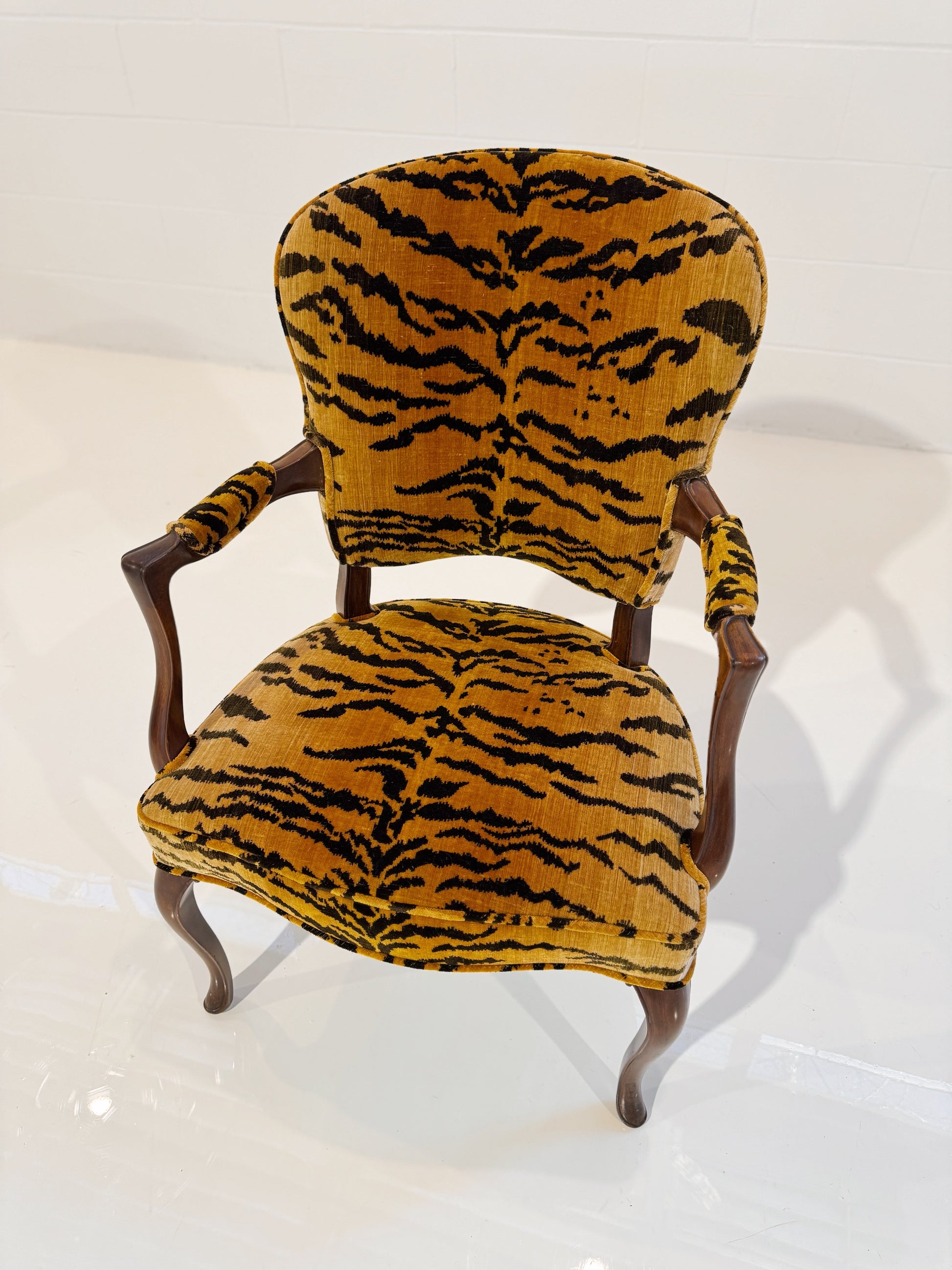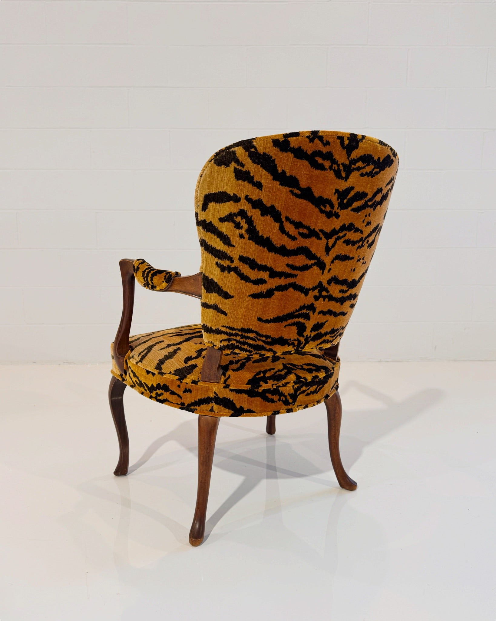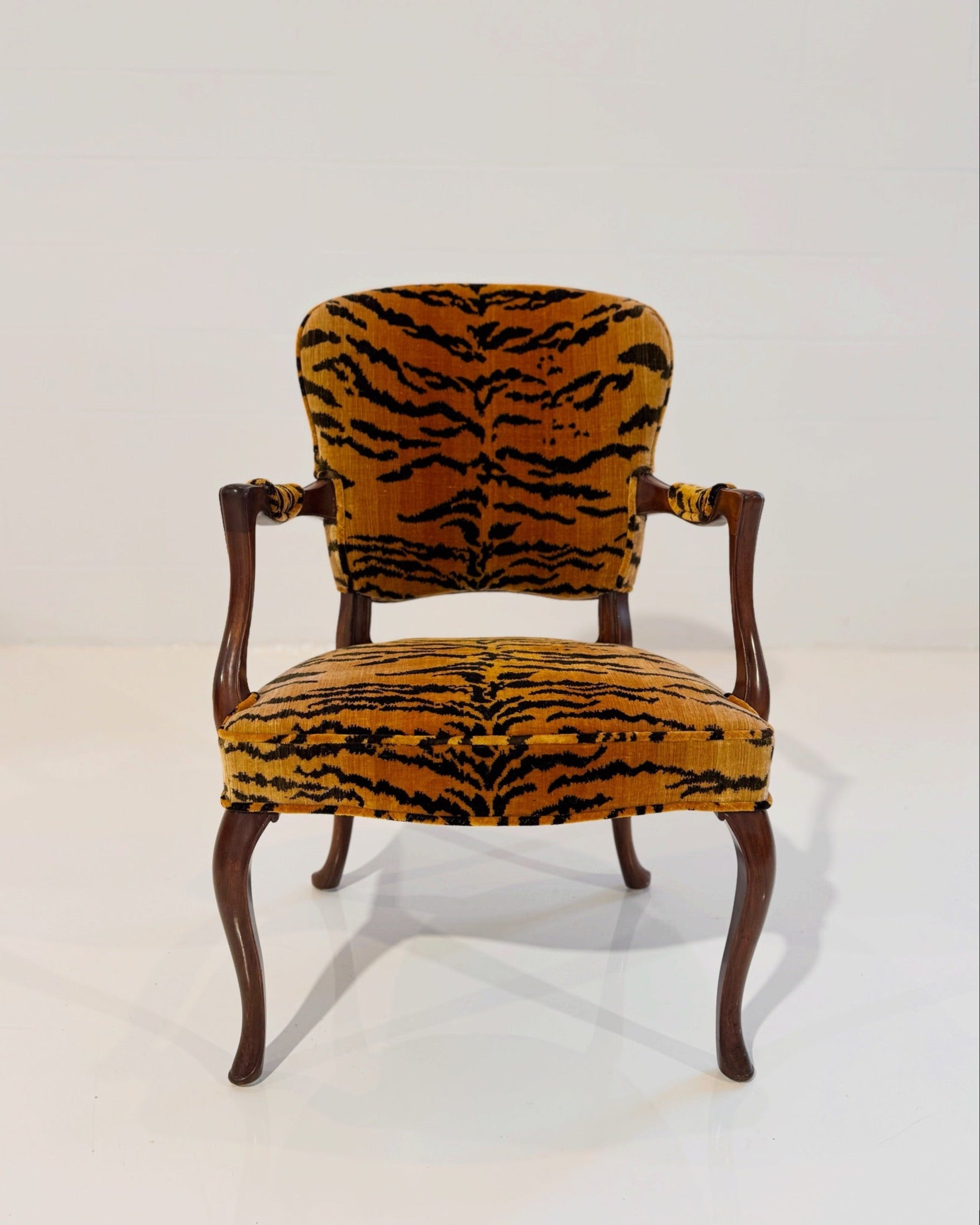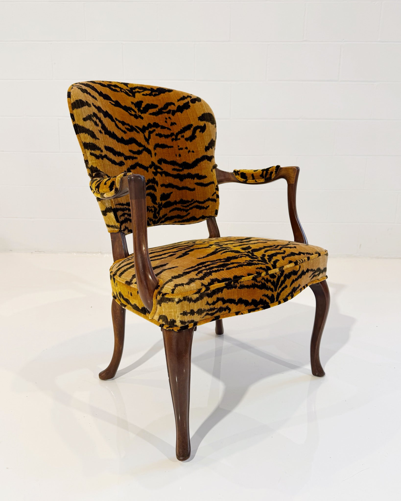 The armchair has been reupholstered in Luigi Bevilacqua's world renowned Tigre Velvet. This exceptionally luxurious velvet is handmade on 18th century looms.