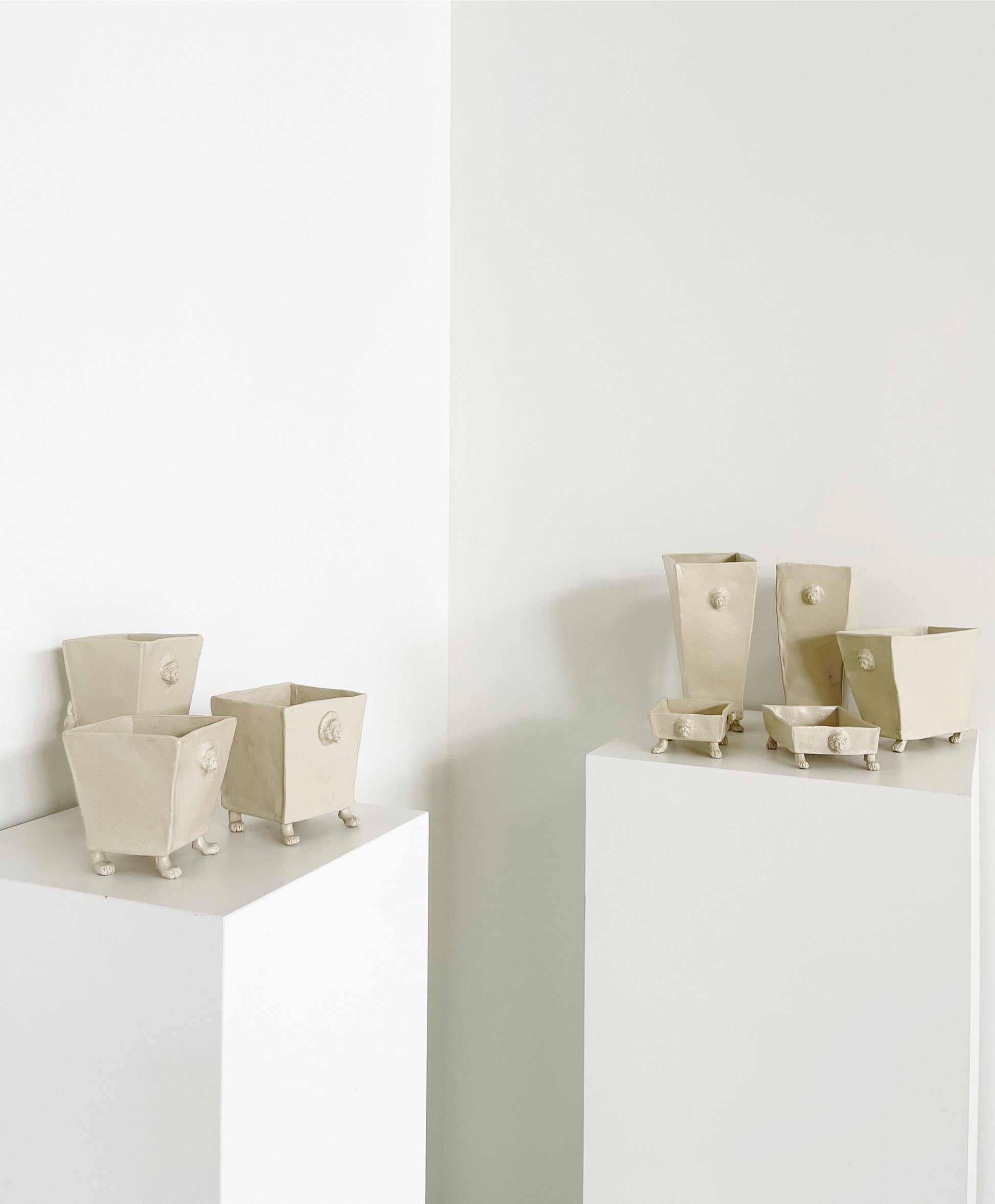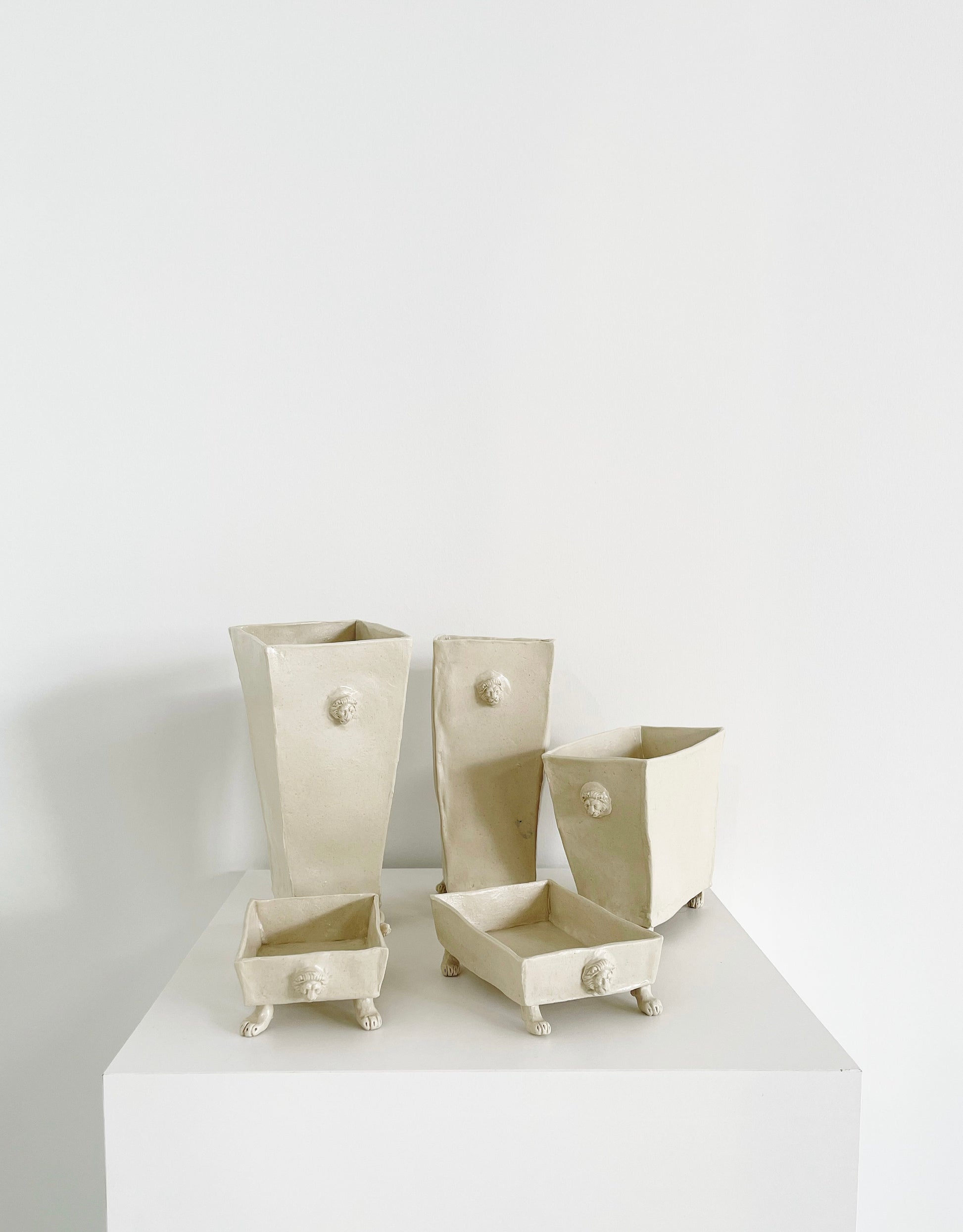 The Leo Collection by artist Maggie Robertson is a beautiful series of one-of-a-kind, hand-built stoneware vessels. Each unique piece embraces the seams and irregularities of her hand-built technique complemented by a lion's head and hand-sculpted feet and tail. The vessels are water tight and food safe, microwaveable and dishwasher safe; however, as they are art pieces and fragile, we would recommend hand washing.