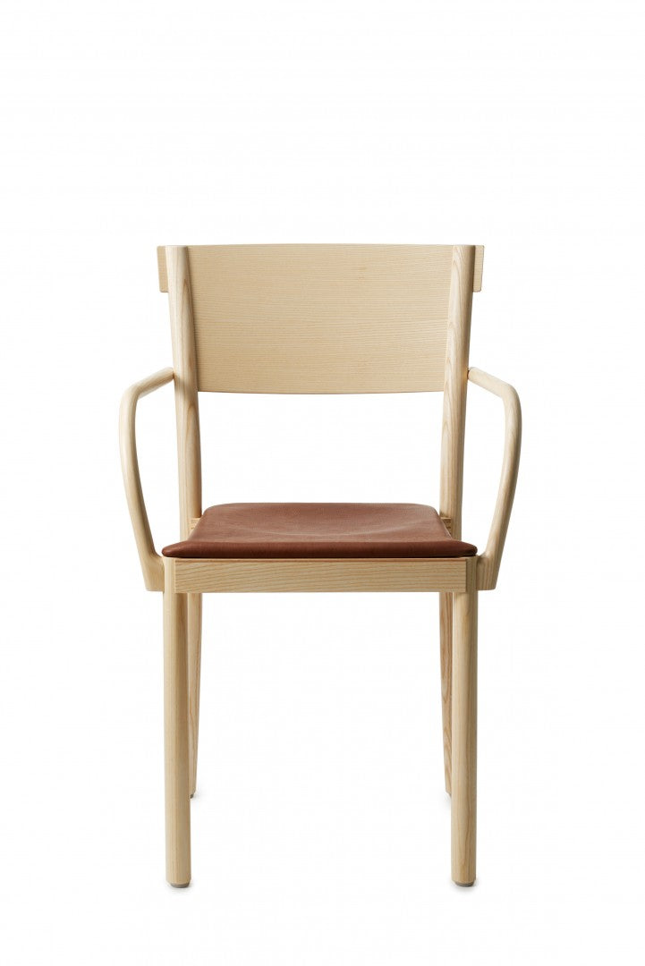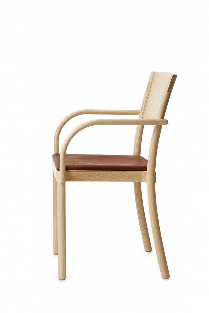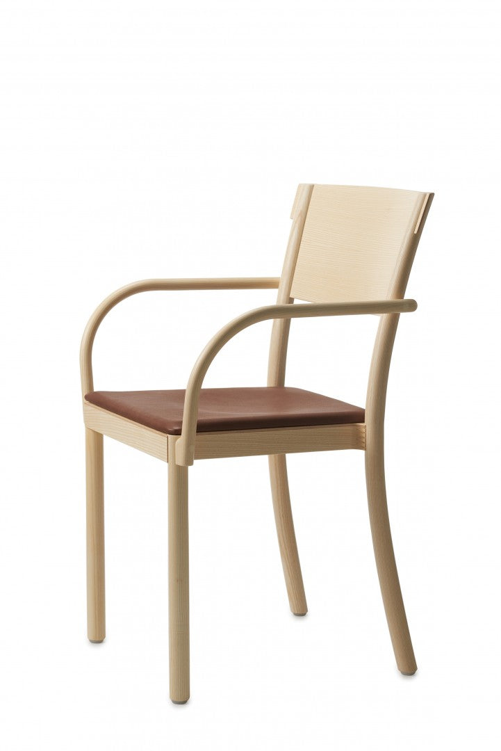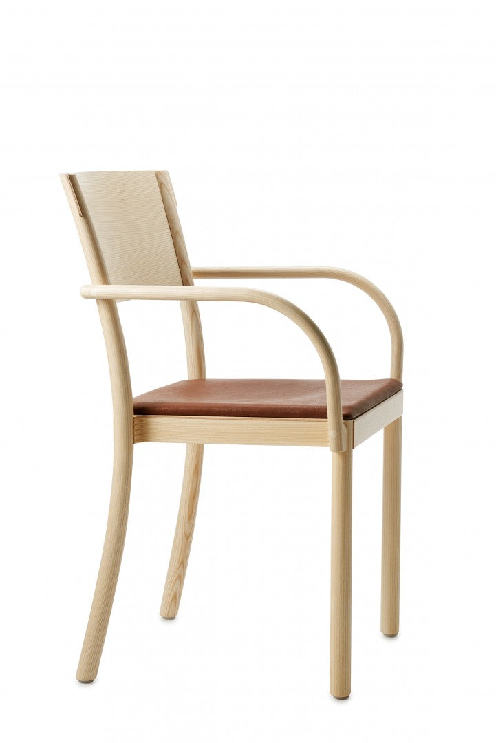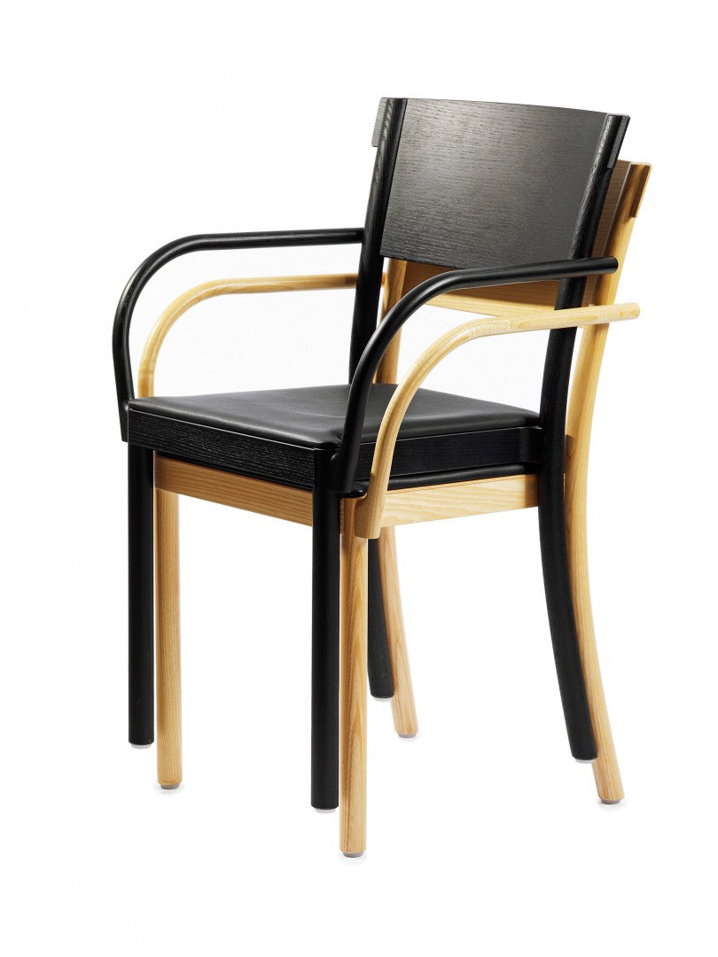 Armchair in solid ash with back legs in solid bent wood. Available in oak for an additional cost per chair. Seat in compression molded veneer or seat and backrest upholstered in fabric or leather. Stackable. Available with linkable frame. Plastic glides.
