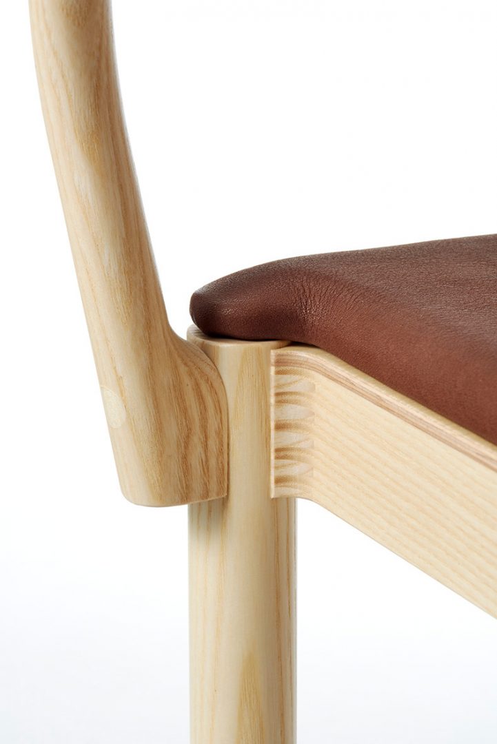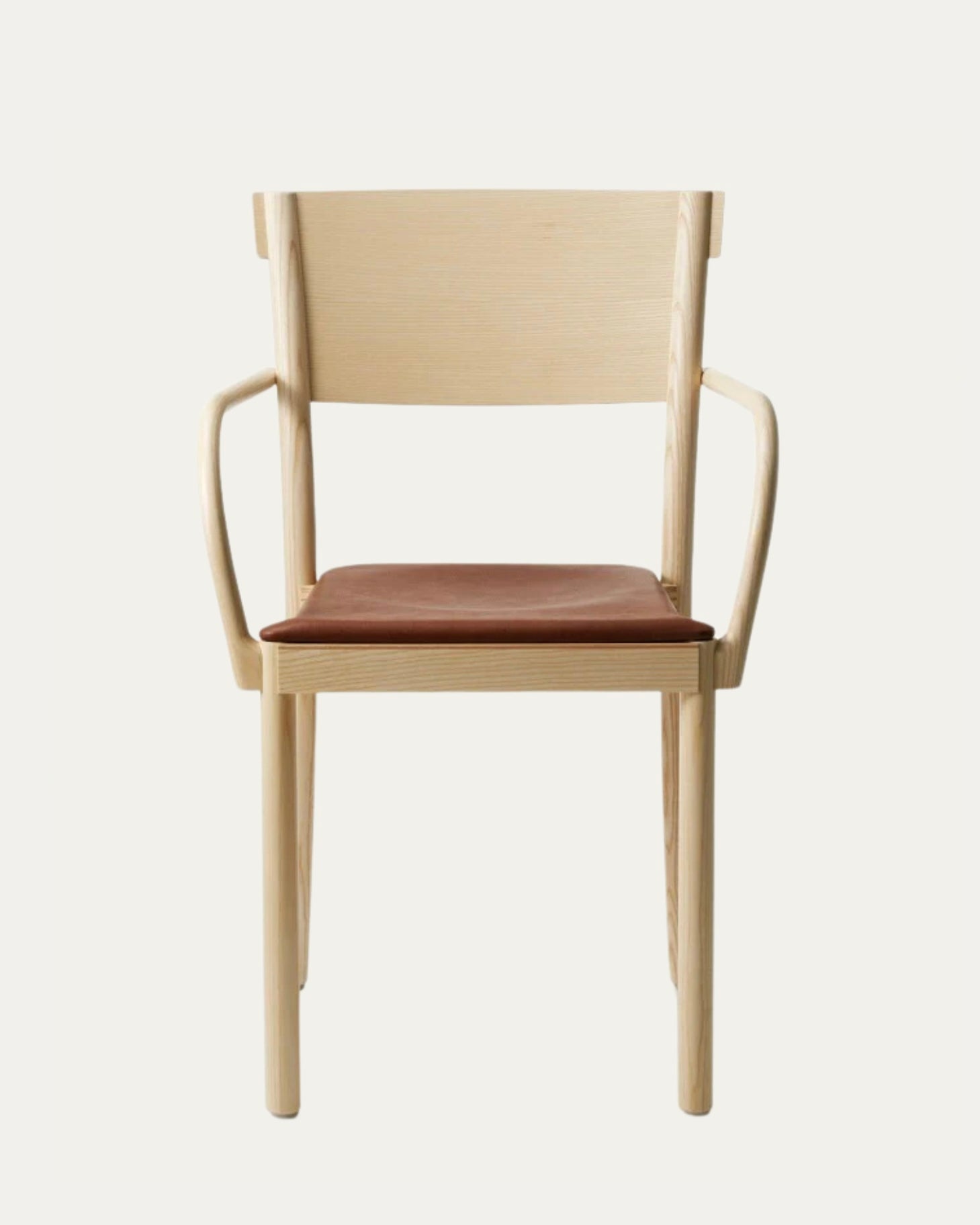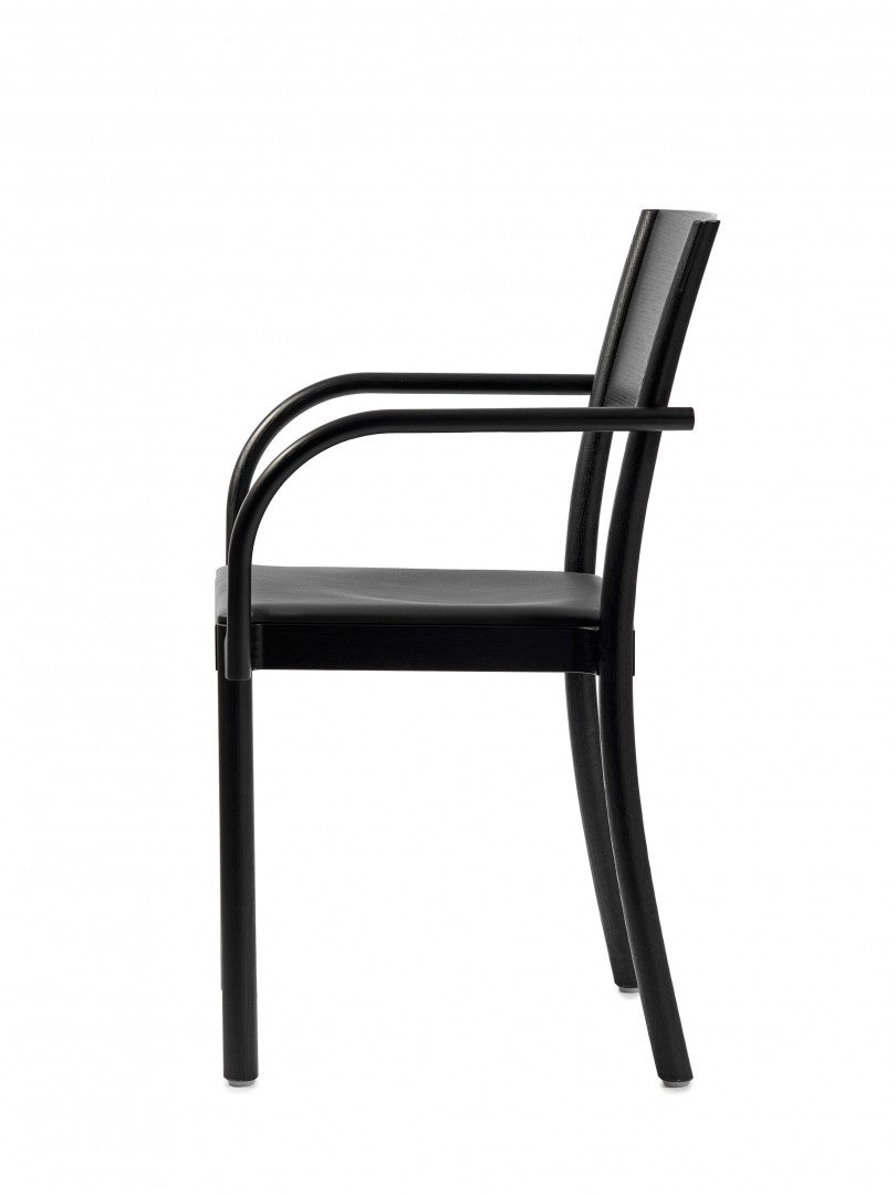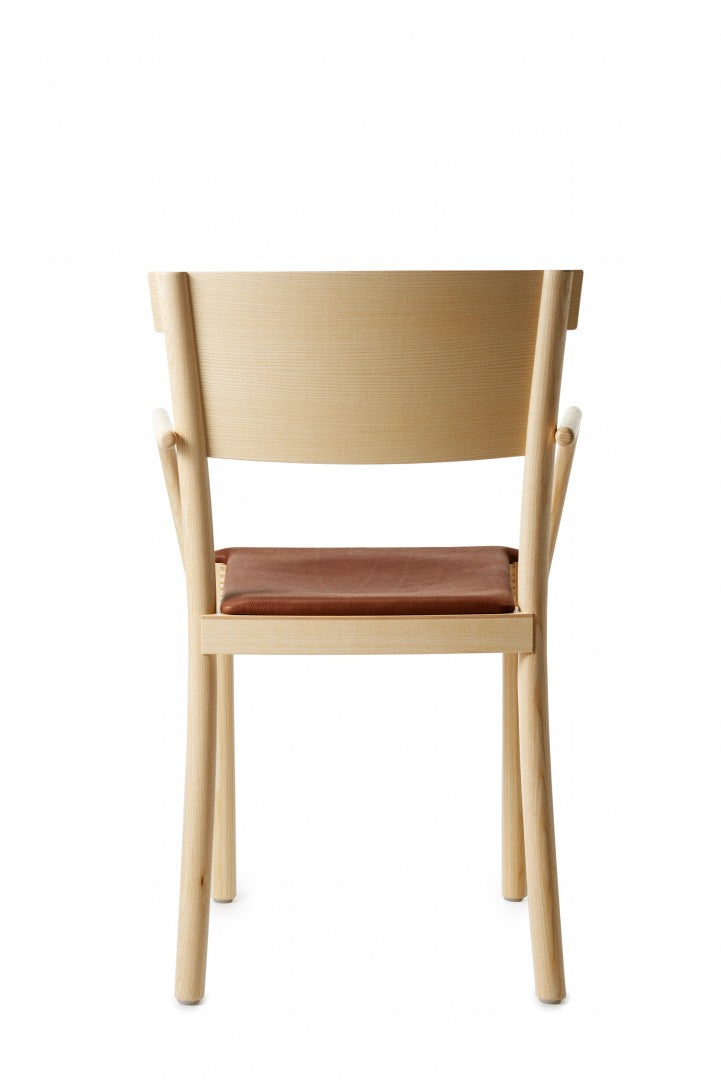 Armchair in solid ash with back legs in solid bent wood. Available in oak for an additional cost per chair. Seat in compression molded veneer or seat and backrest upholstered in fabric or leather. Stackable. Available with linkable frame. Plastic glides.