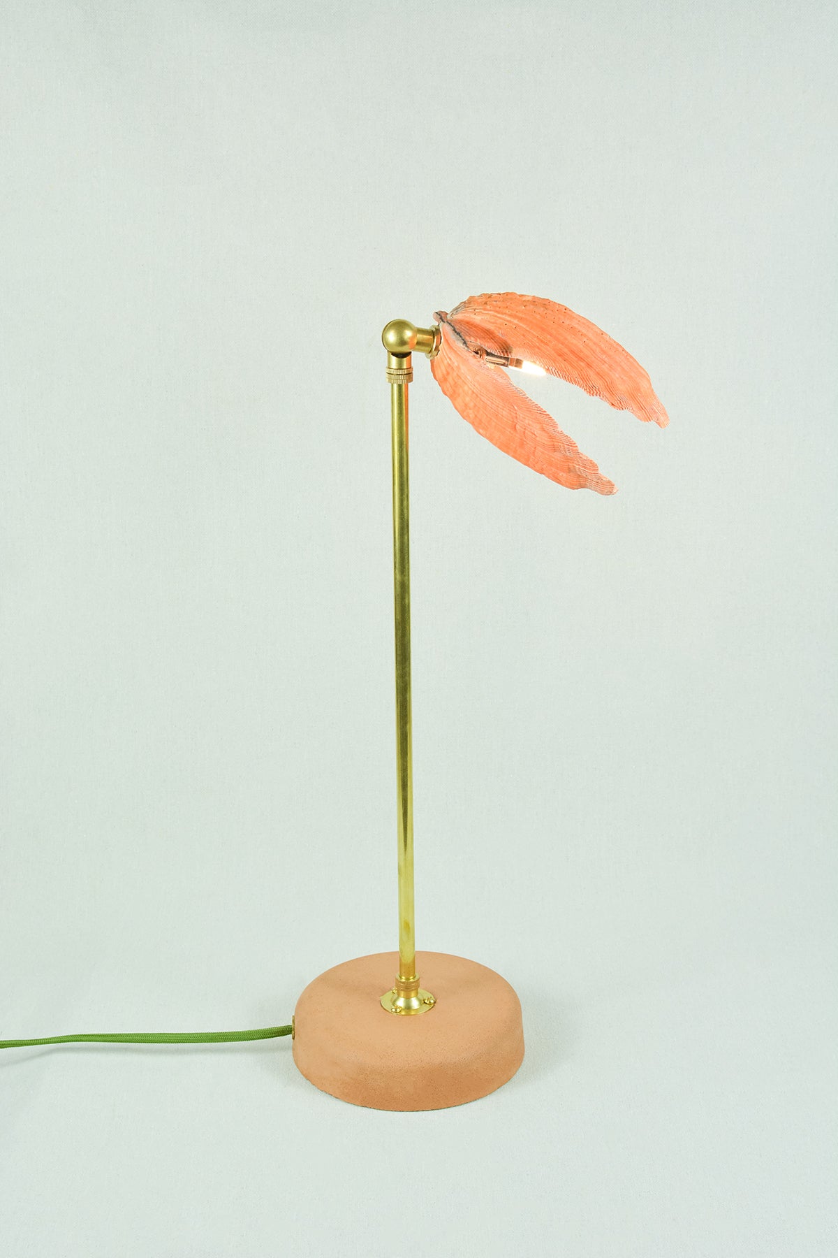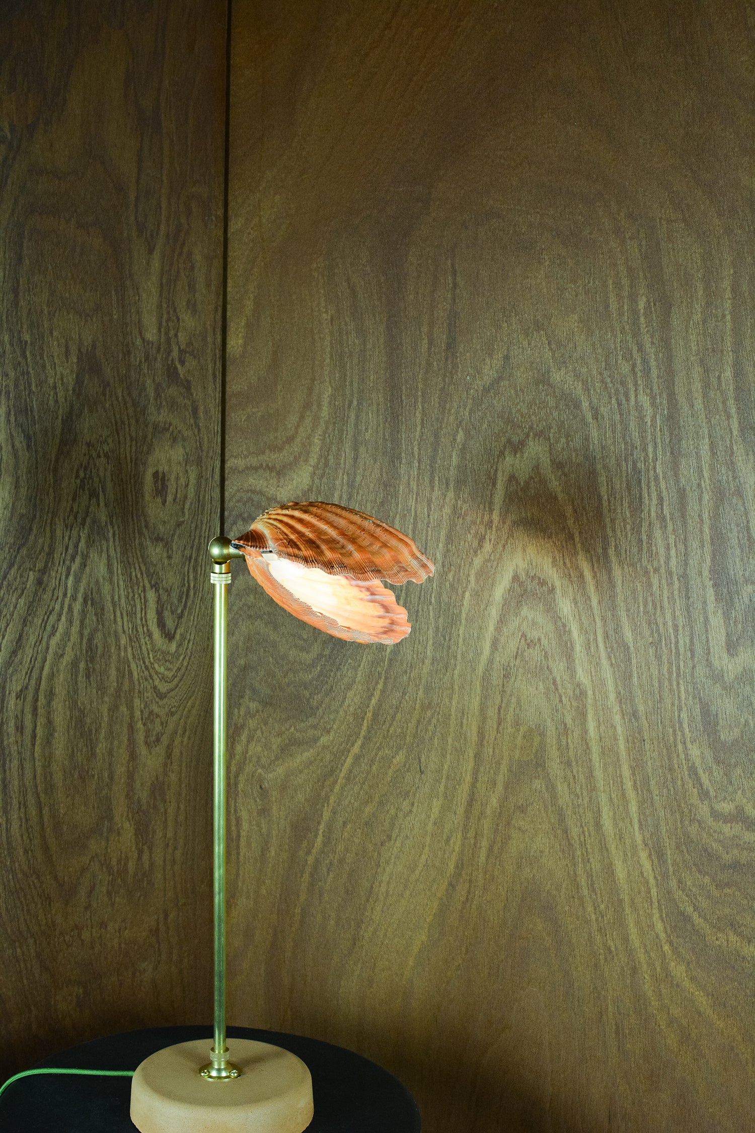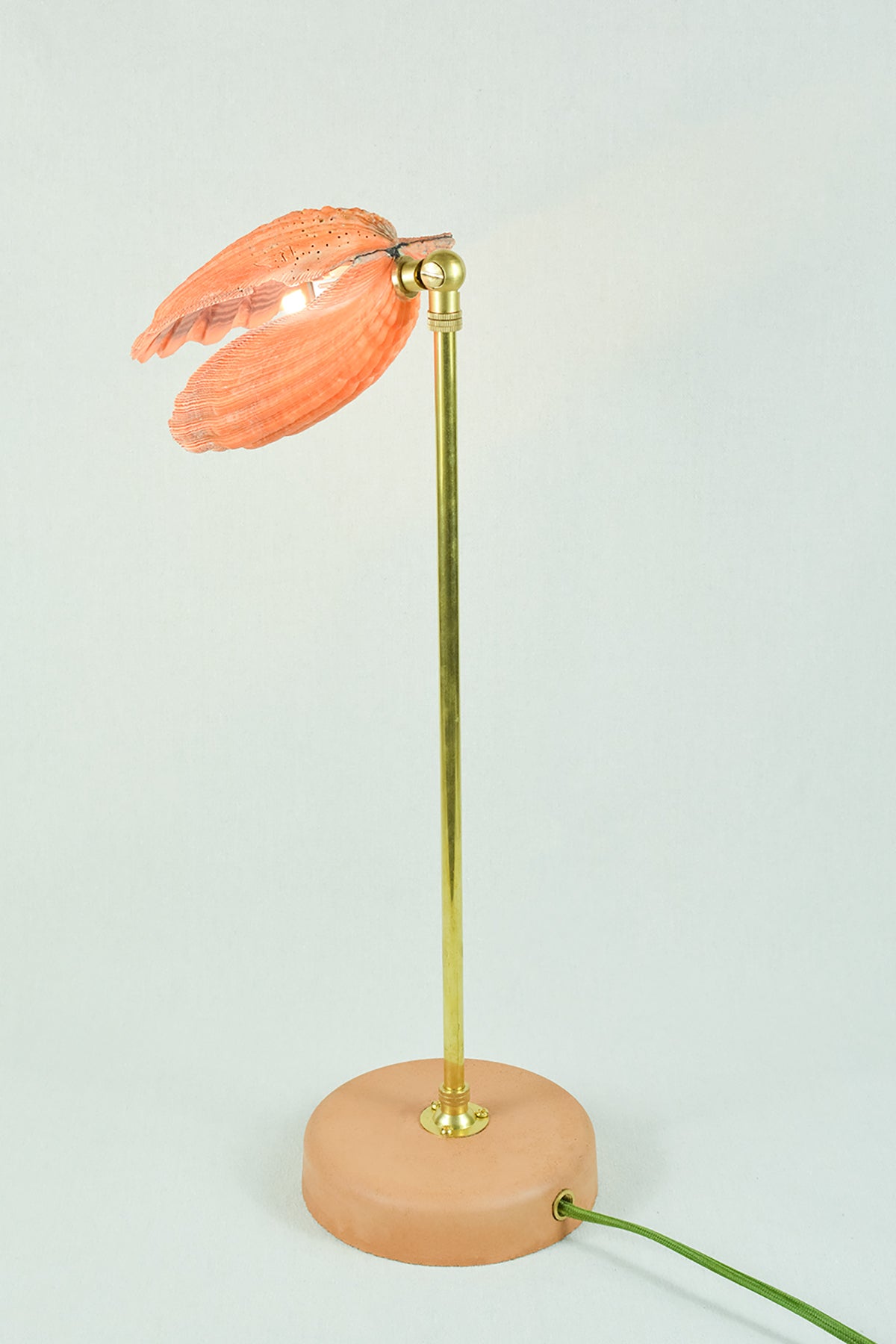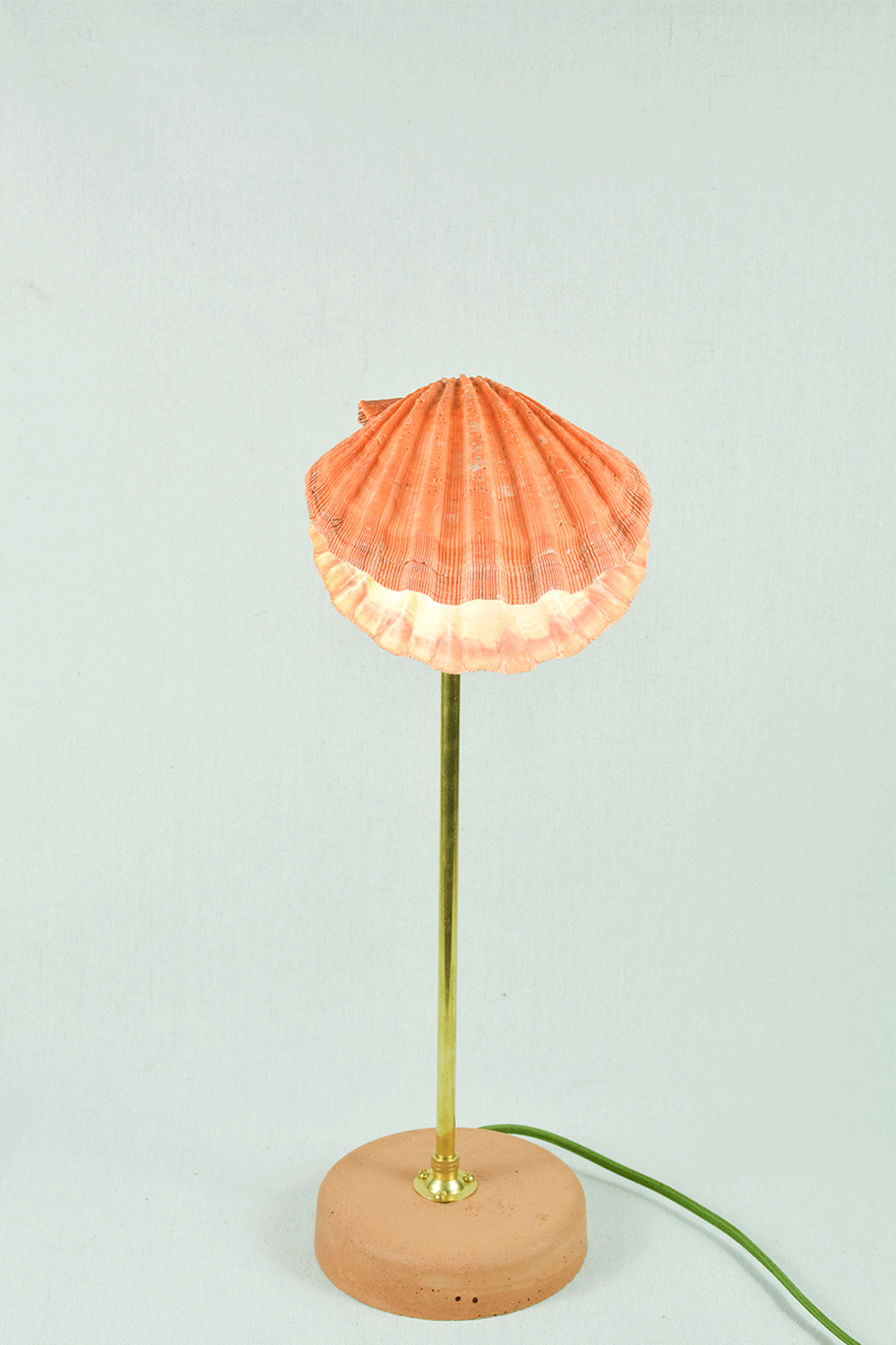 Despite its passing resemblance to Audrey II, Model No. 019 requires no care or feeding. Centered on a terra cotta-tinted cast-concrete base, with an unfinished brass column, knurled brass hardware, and olive cloth-covered cord with contrasting khaki inline switch, its shade is constructed from a matching pair of sustainably sourced, naturally translucent Lion’s Paw scallop shells.