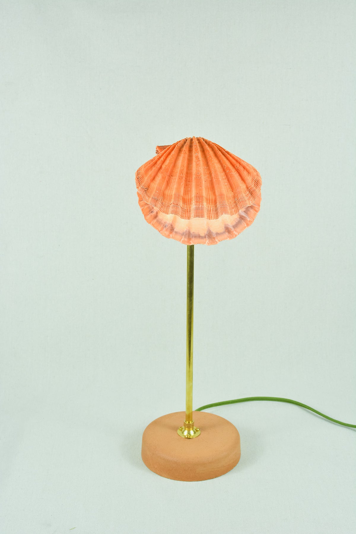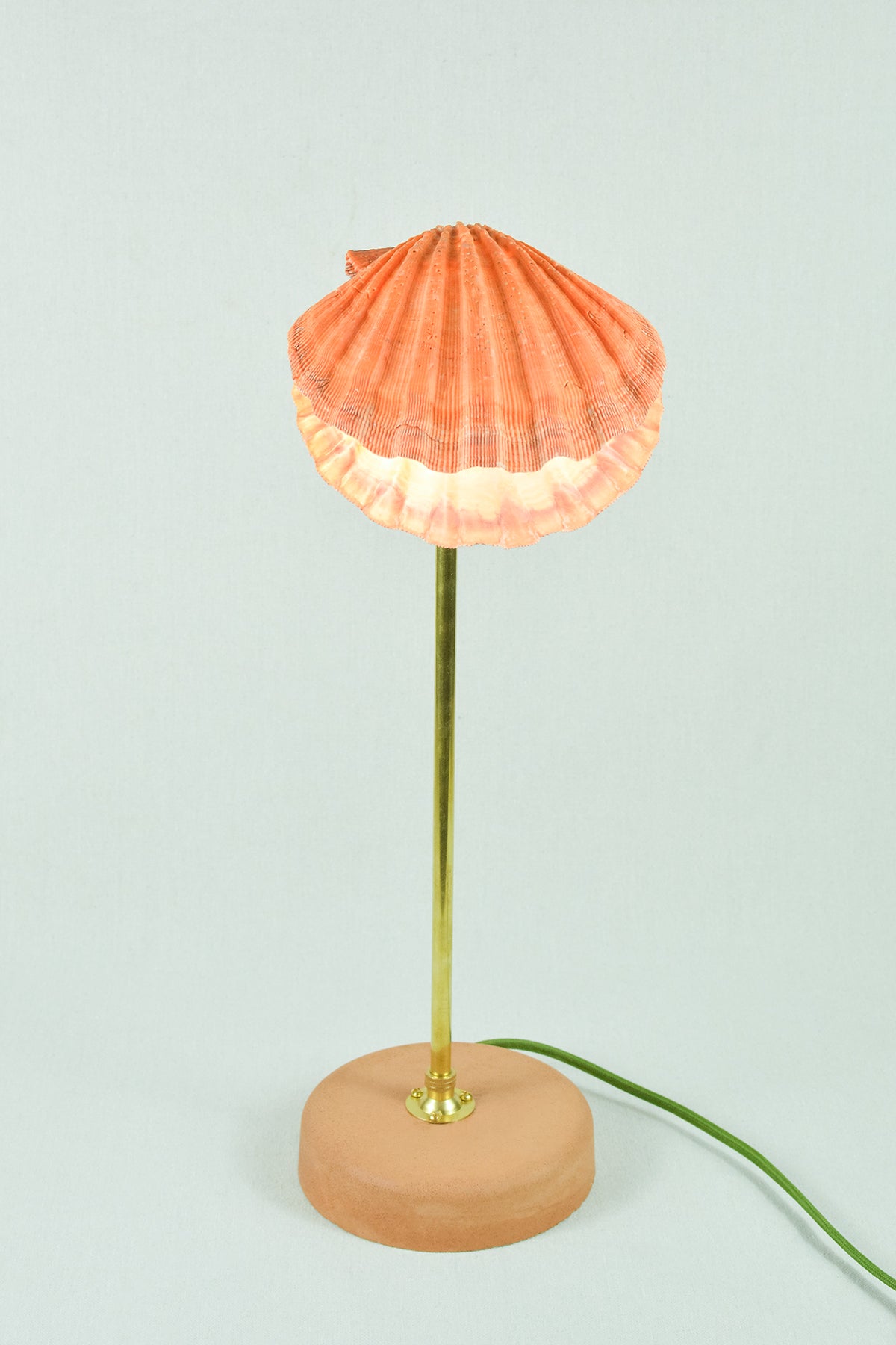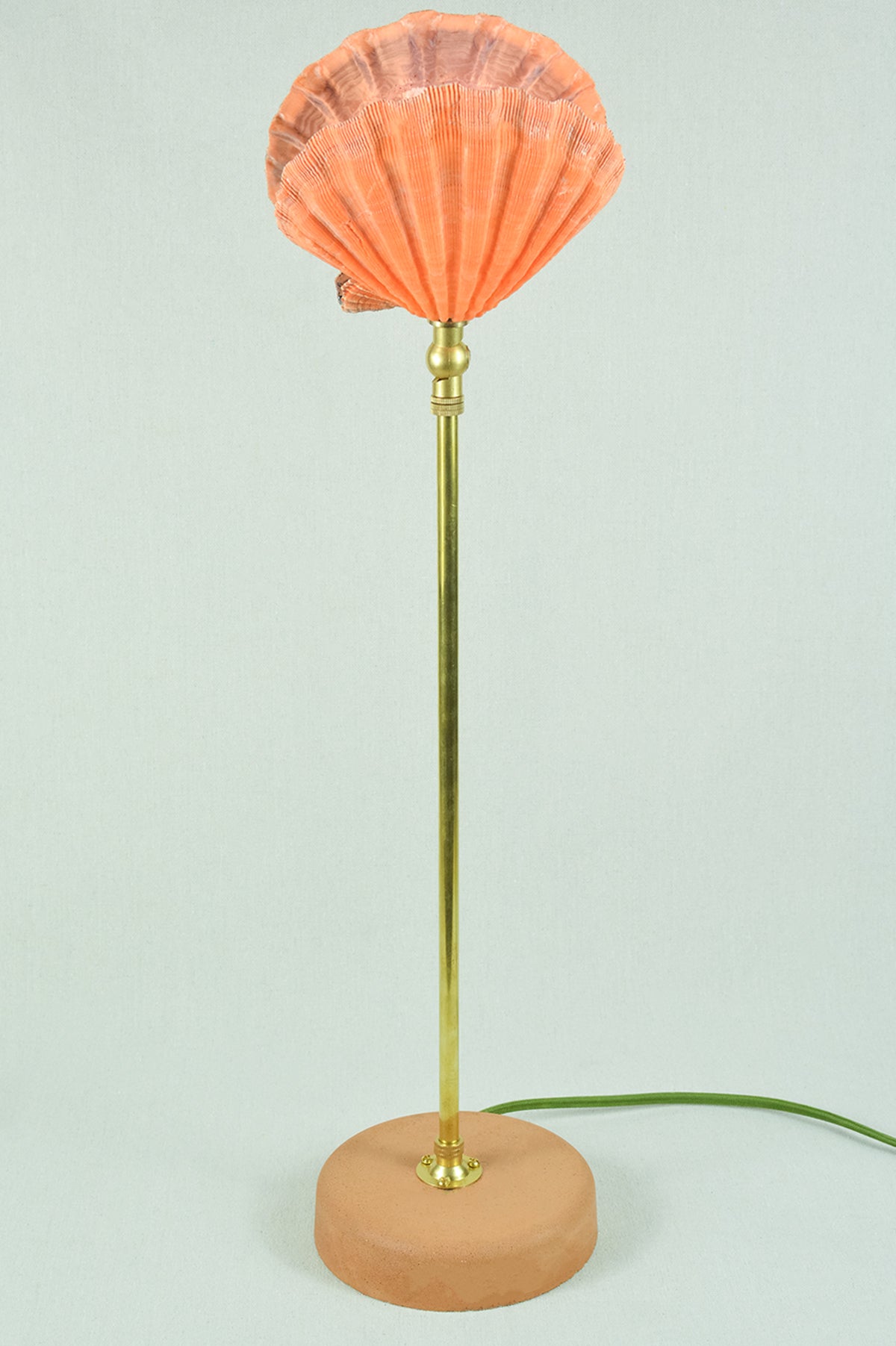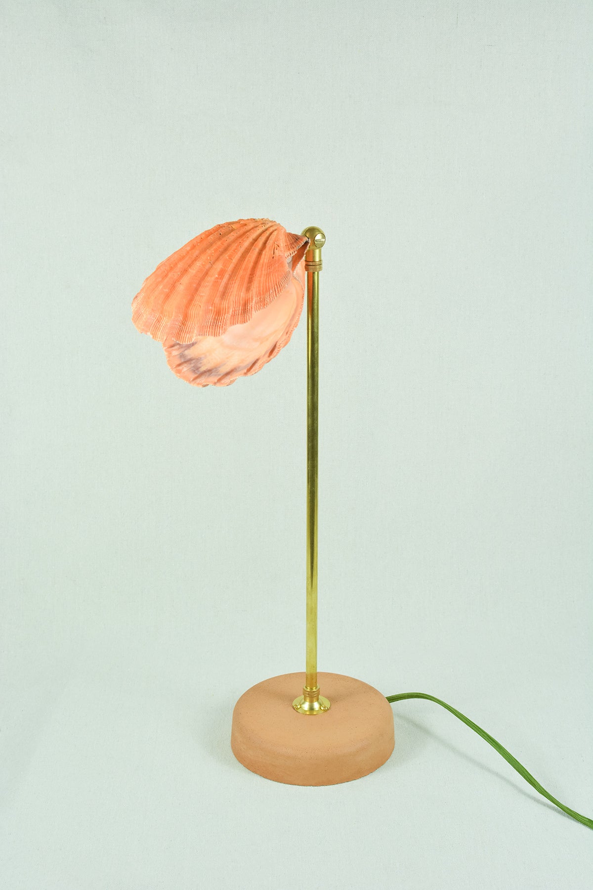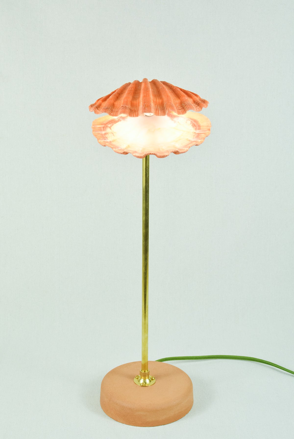 Despite its passing resemblance to Audrey II, Model No. 019 requires no care or feeding. Centered on a terra cotta-tinted cast-concrete base, with an unfinished brass column, knurled brass hardware, and olive cloth-covered cord with contrasting khaki inline switch, its shade is constructed from a matching pair of sustainably sourced, naturally translucent Lion’s Paw scallop shells.