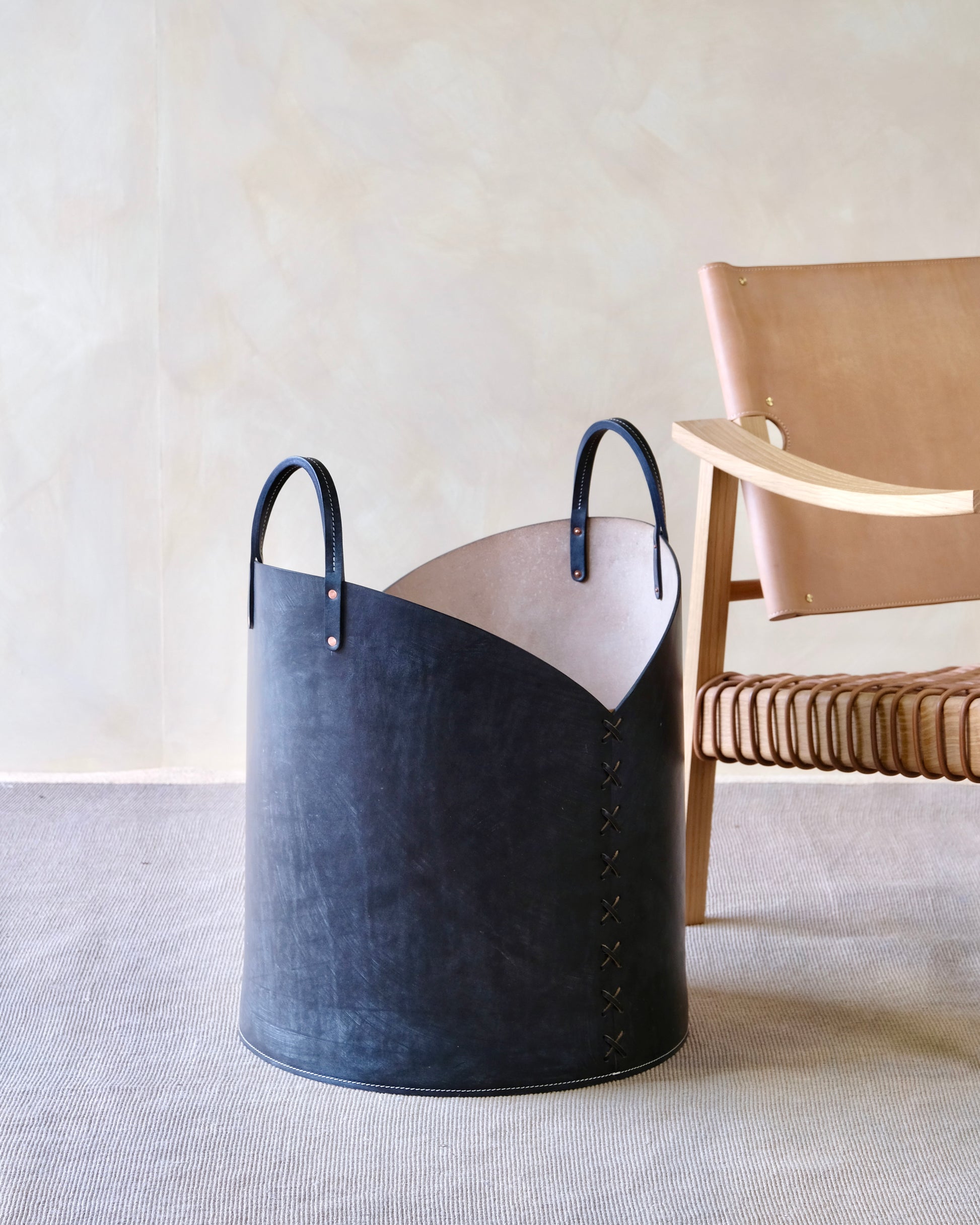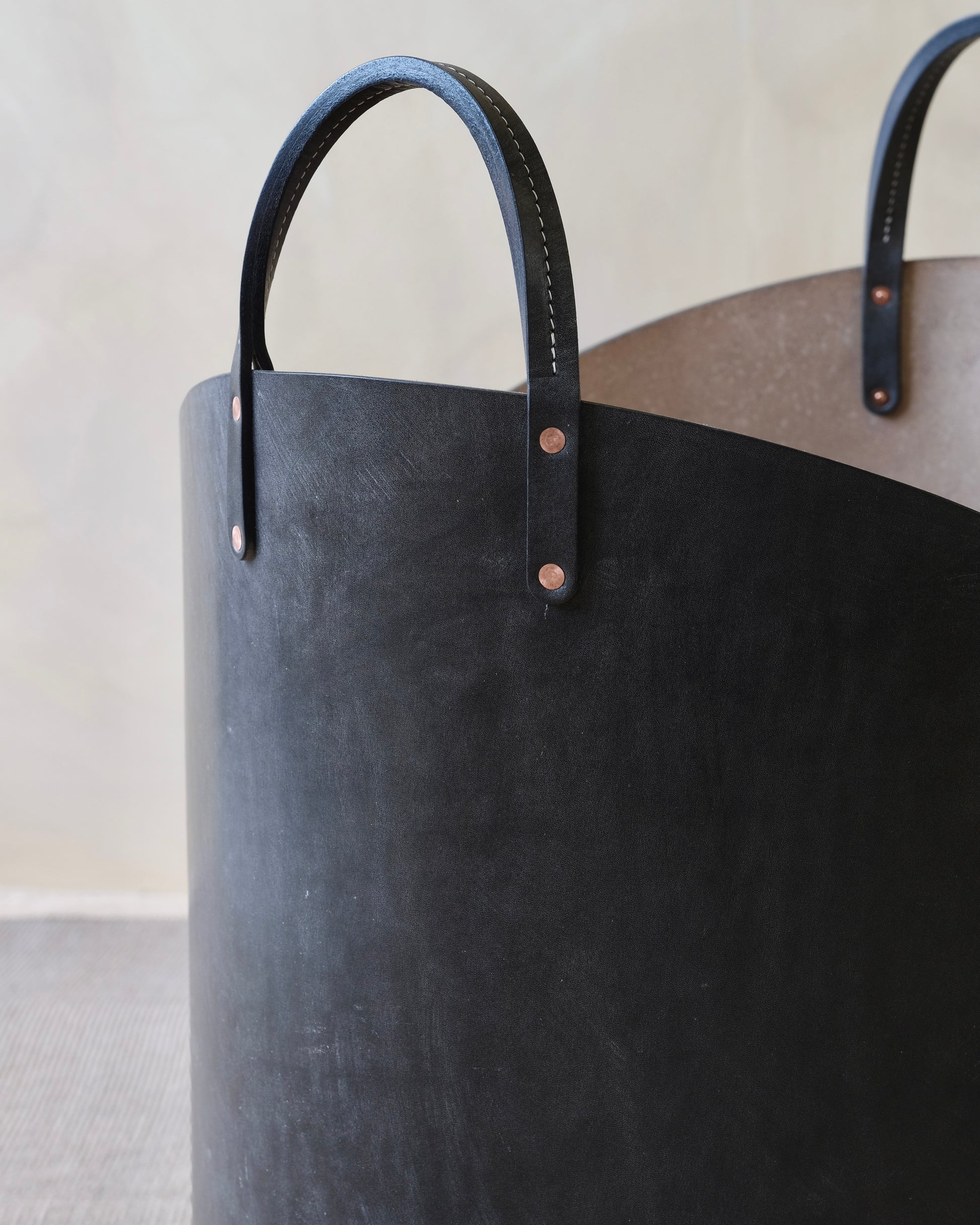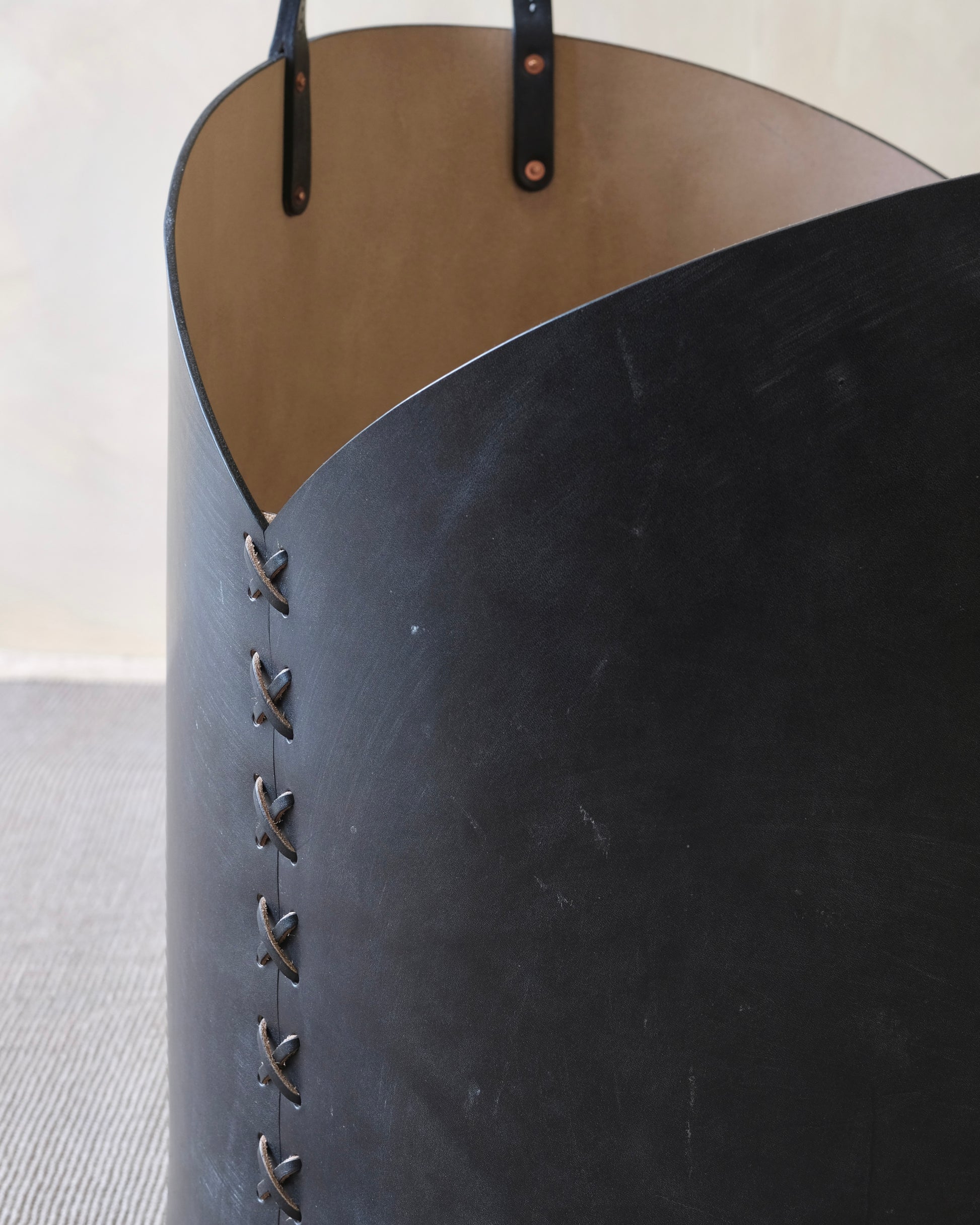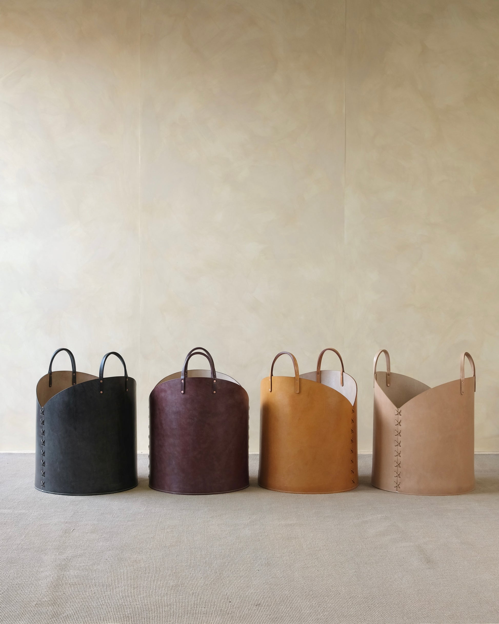 Drawing inspiration from the traditional English orchard gathering-basket, these multifunctional log baskets, perfectly suited to firewood, blankets, or toys are constructed from a discrete side of oak bark tanned bridle leather. Using these large panels reveals and represents the true character and beauty of the material. This is cut, dyed, polished, riveted, and laced by hand around a solid ash timber base, which offers support for the heavy weight of logs and kindling. The nature of the materials means that no two are the same, each offering a unique canvas that will patina beautifully over time.
