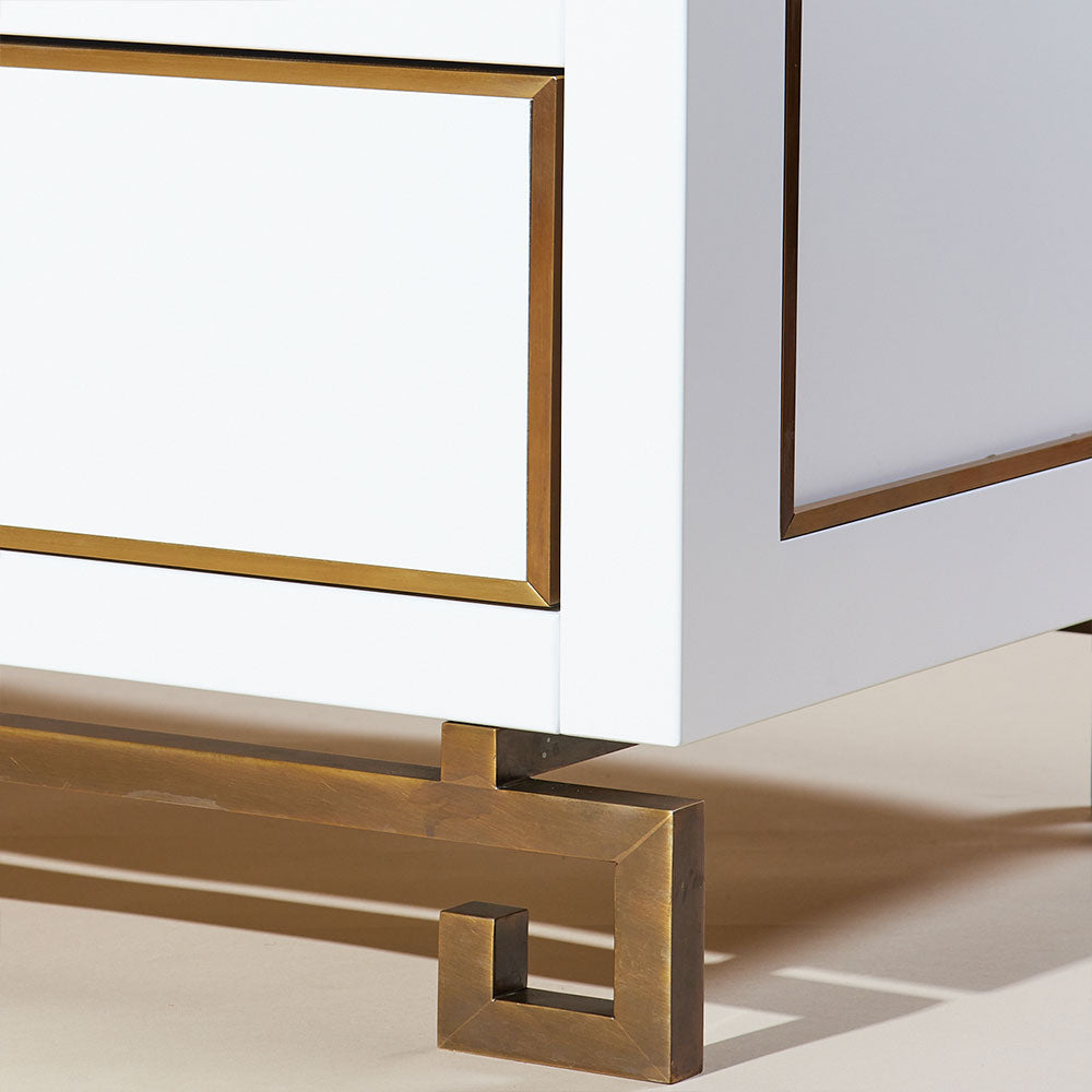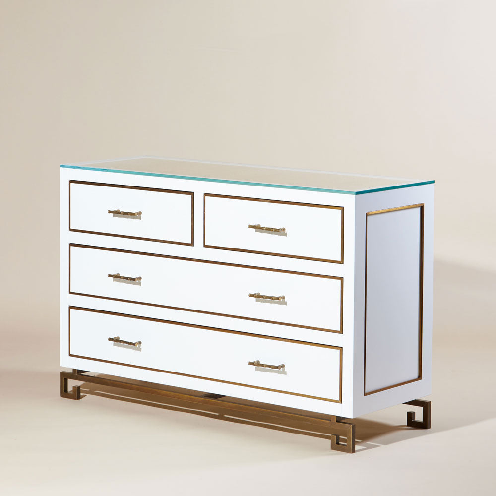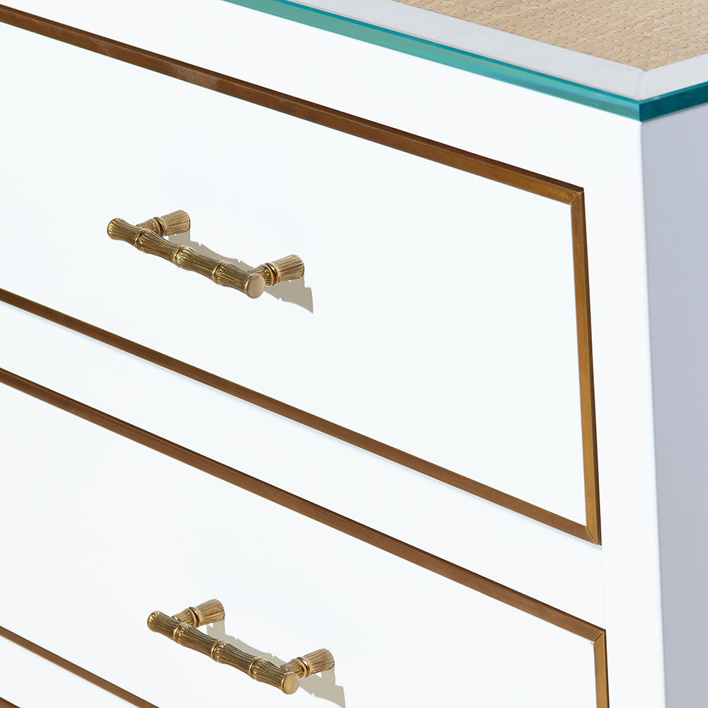 Louis is a chest of drawers characterized by its use of lacquered wood. The piece is designed in white lacquered wood and extra-clear glass top, with a raffia layer between the volume and the top.