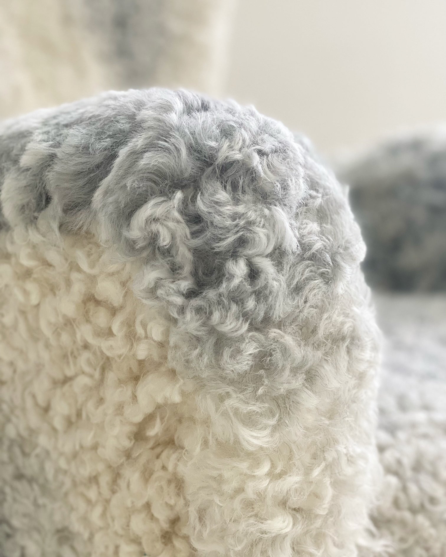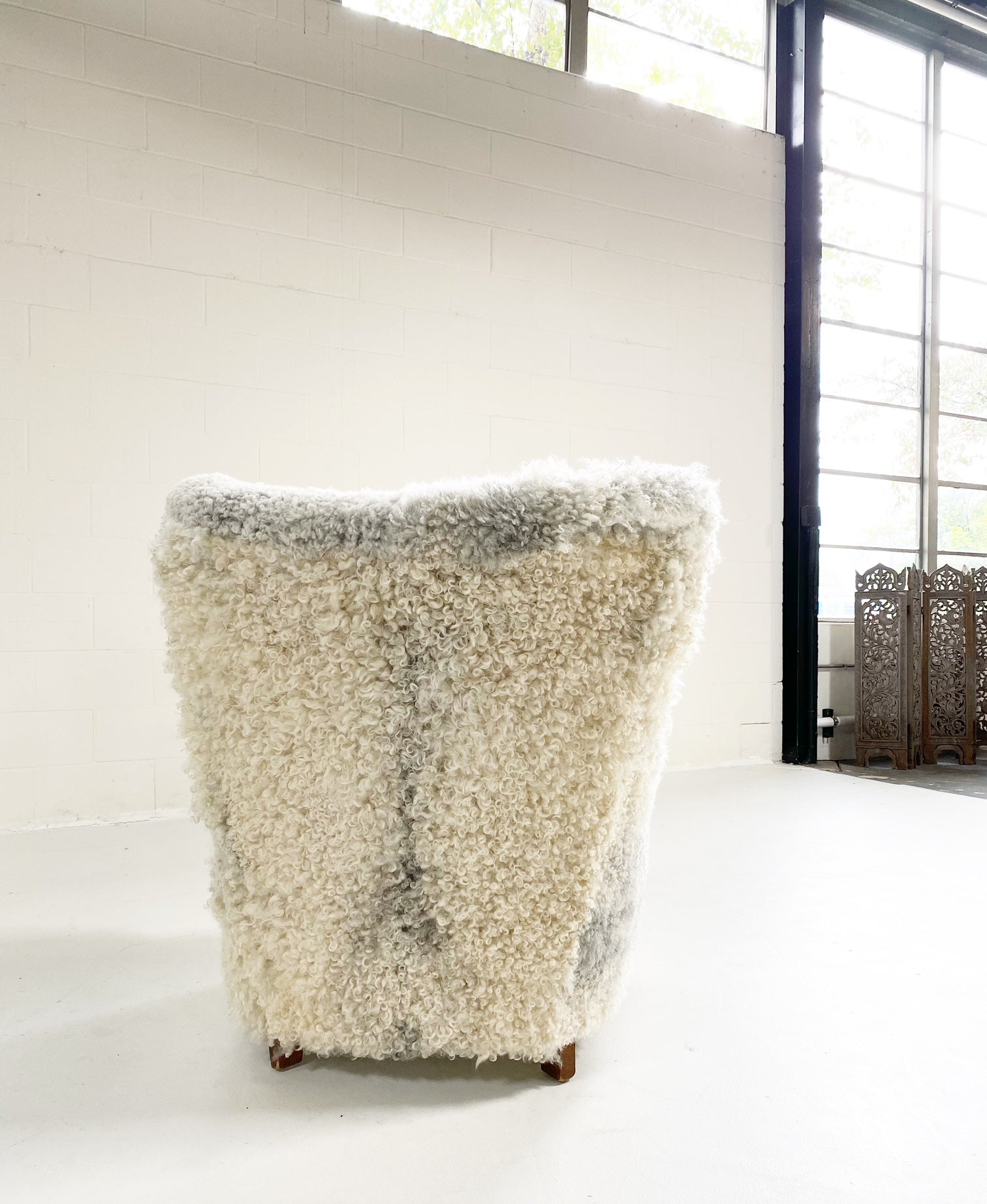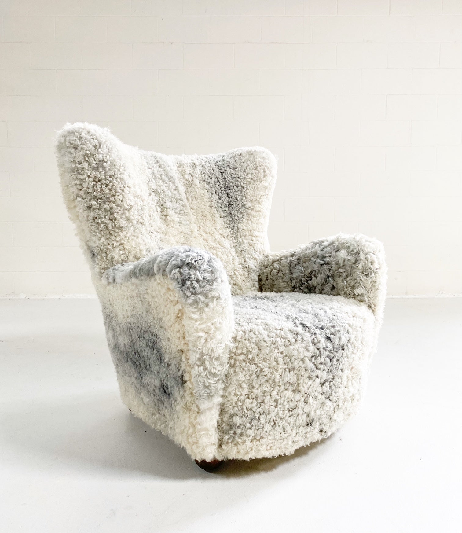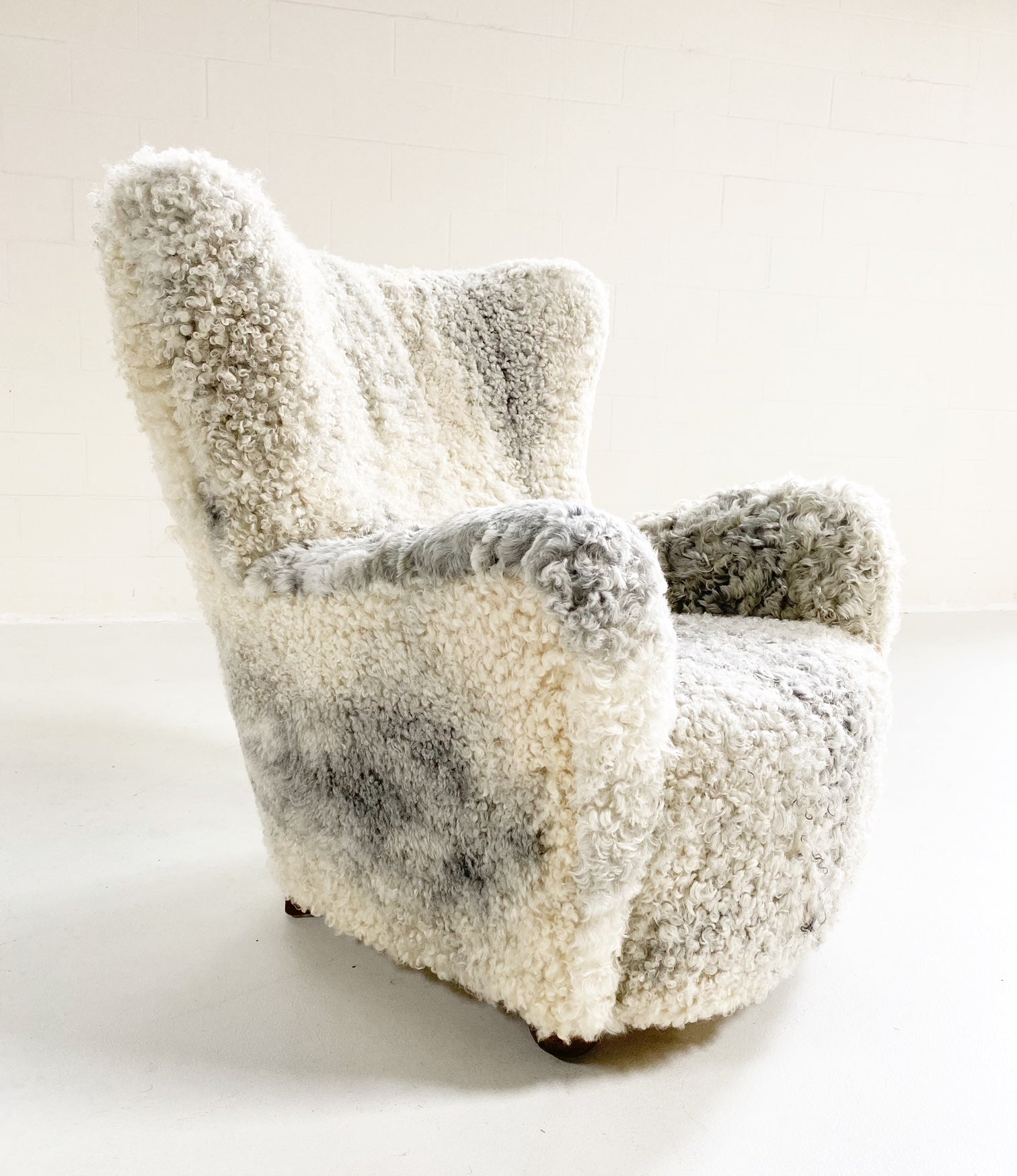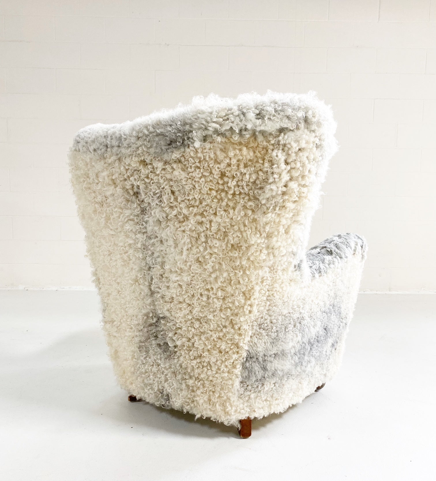 Attributed to Flemming Lassen, this one-of-a-kind lounge chair is the ultimate for kicking your feet up and relaxing. We completely restored the chair down to the frame and upholstered in our Gotland sheepskins from Sweden. Rare to be found in the U.S., these beautiful sheepskins are of the oldest race of sheep in Sweden. Unique to the island of Gotland, they are renowned for their silvery-grey colored wool, silky-to-the-touch curls (or ‘purls’ as they are known), and supreme suppleness. The fleece is fine, long, lustrous, and dense and can appear in all shades of grey.