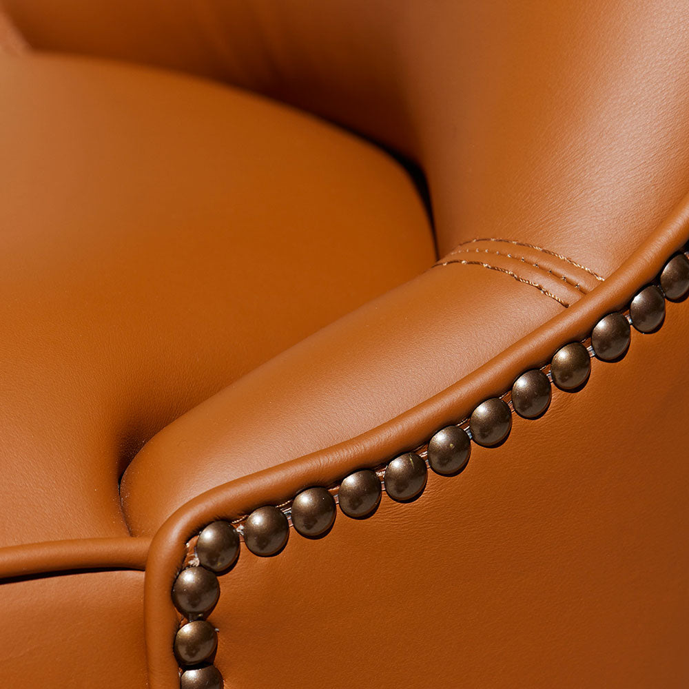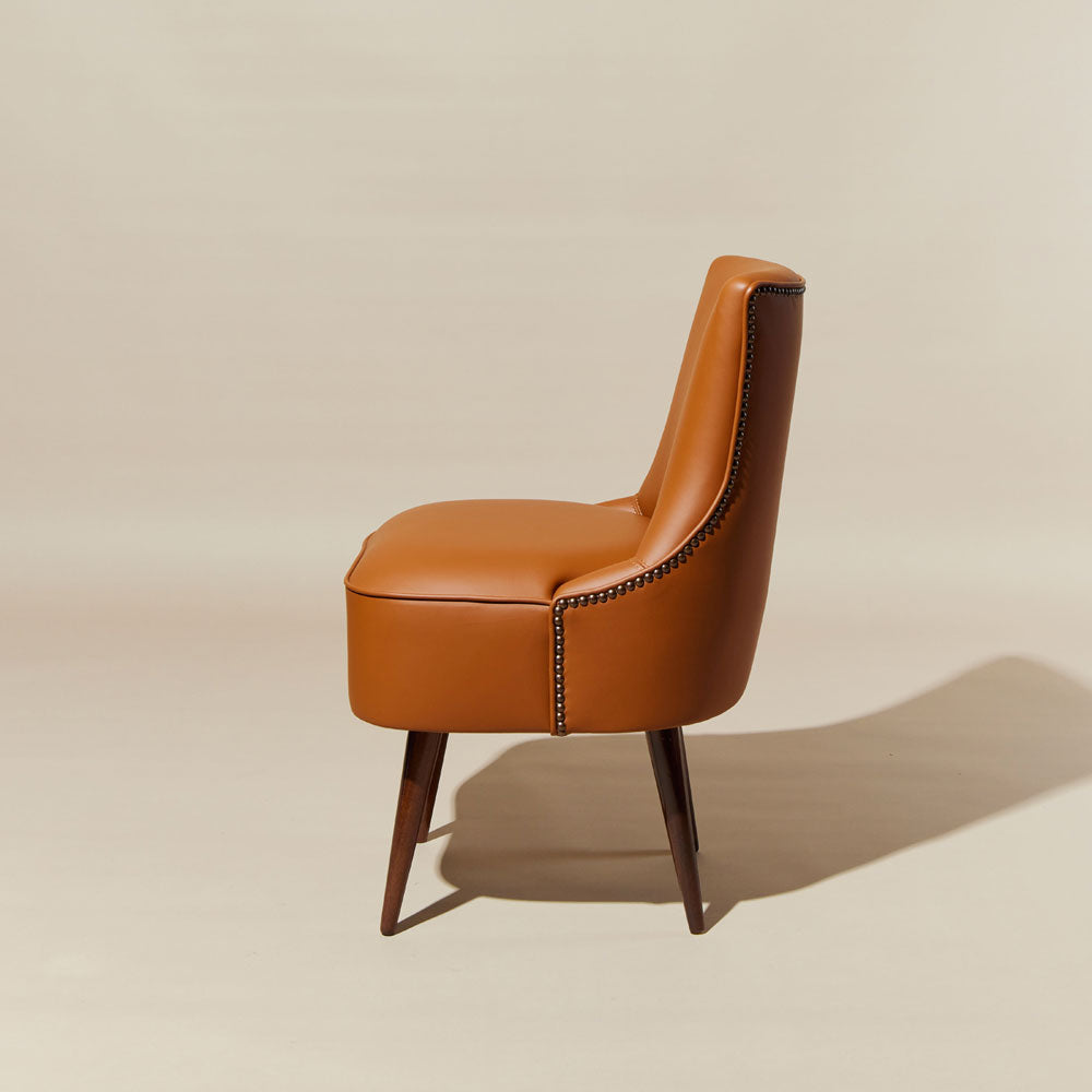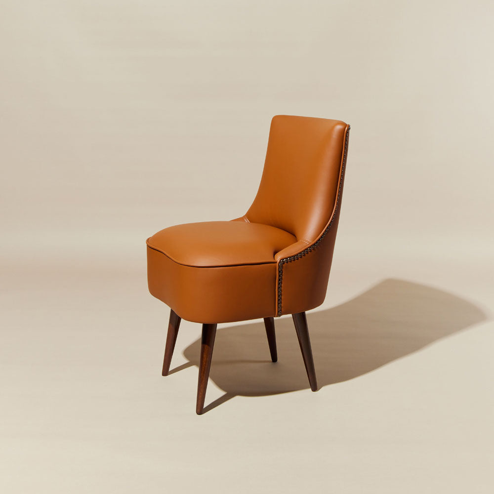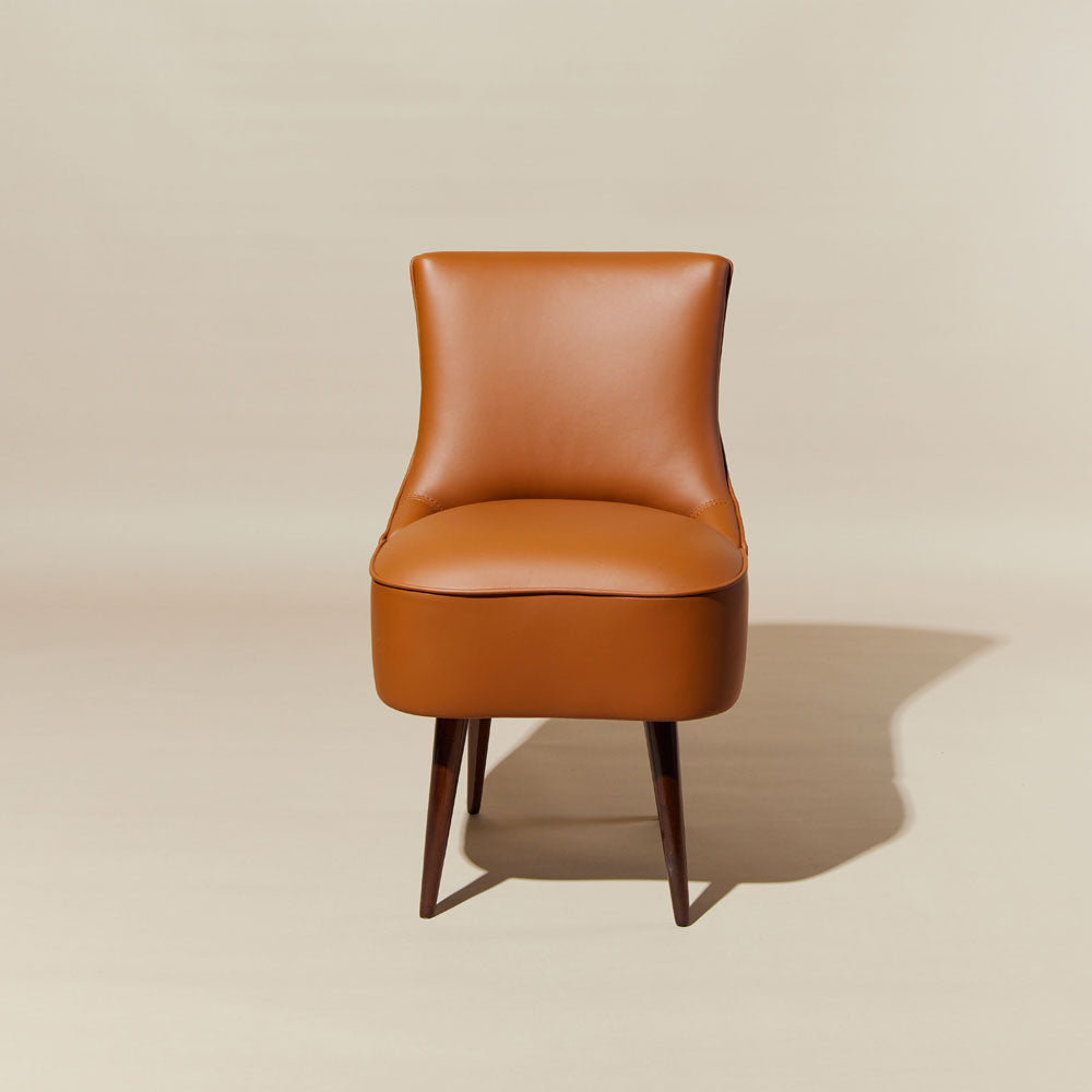 The upholstered seat covered in leather gives the cushioning a visually predominant role in dialogue with the wooden structure, whose walnut finish lends preciousness to the whole.