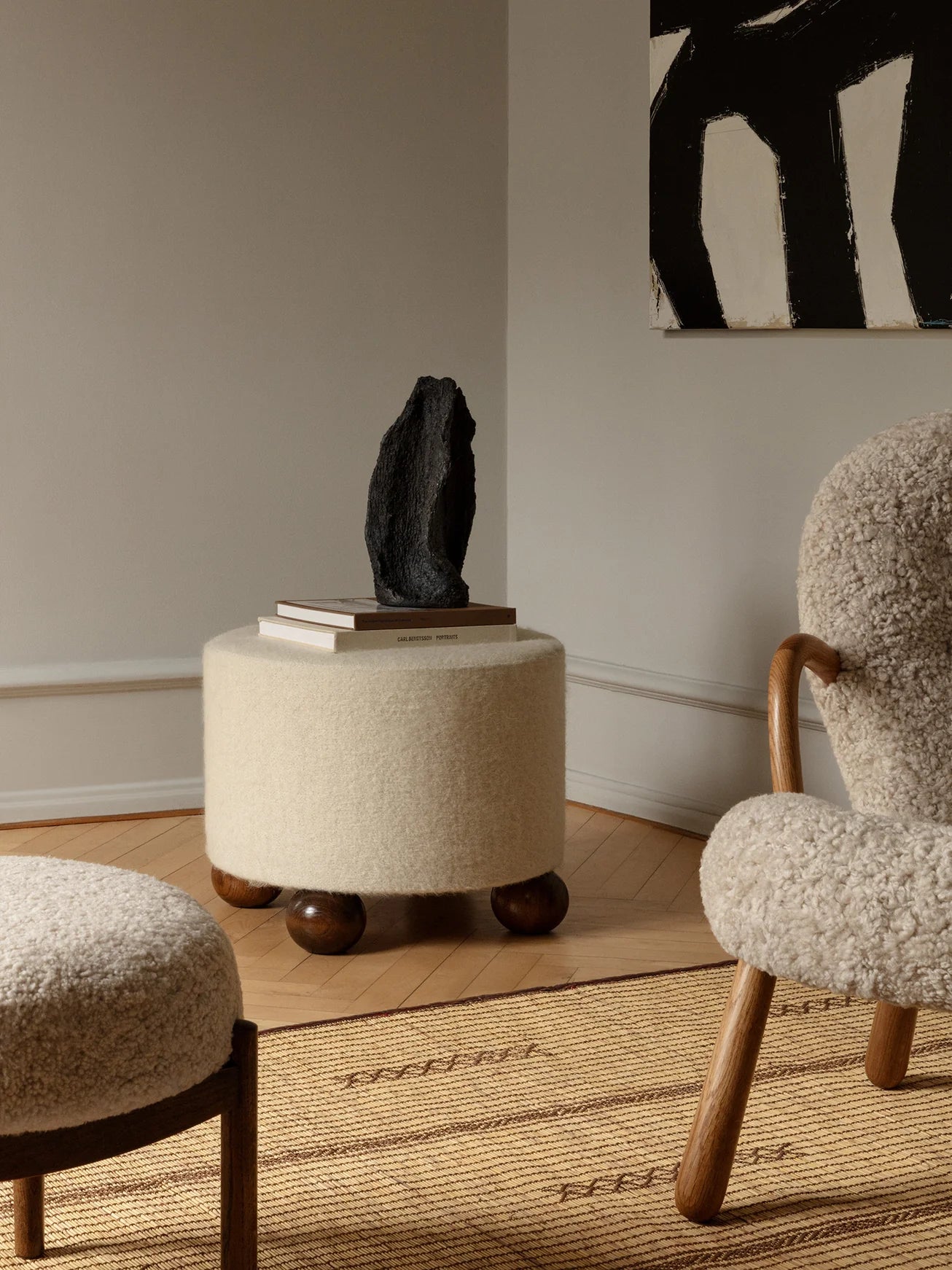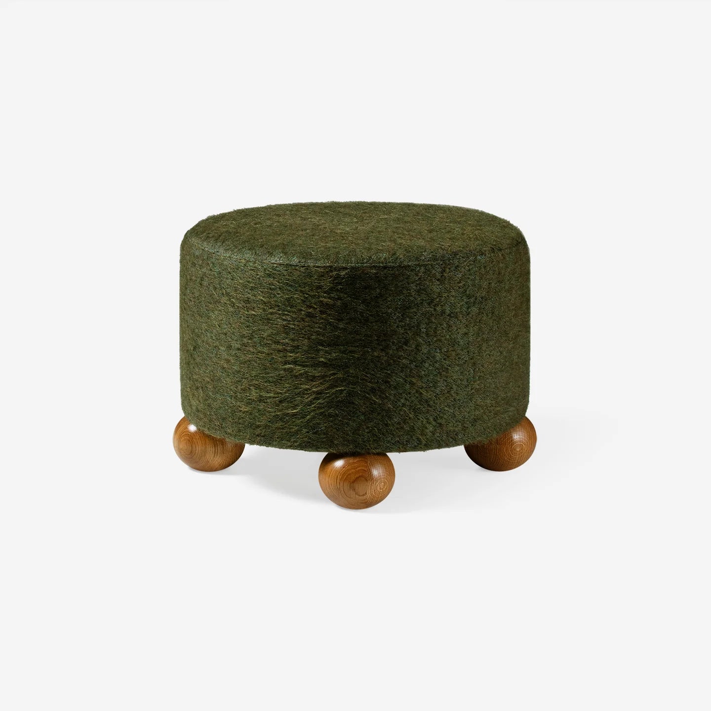 The Luupo Ottoman offers a versatile and sophisticated seating option for any modern interior. The round, inviting form sits on top of solid oak or walnut ball feet in a range of rich finishes. Designed by Dagmar Studio, Luupo is available in two heights: Low (40cm) - suitable as a footstool paired with a armchair or sofa, and High (45cm) - ideal as additional seating or a side table. This example is upholstered in Pierre Frey's beautiful 'Yeti' fabric.