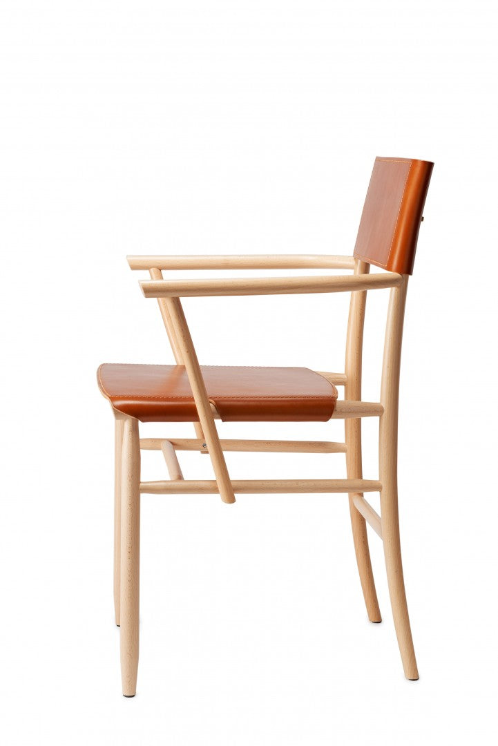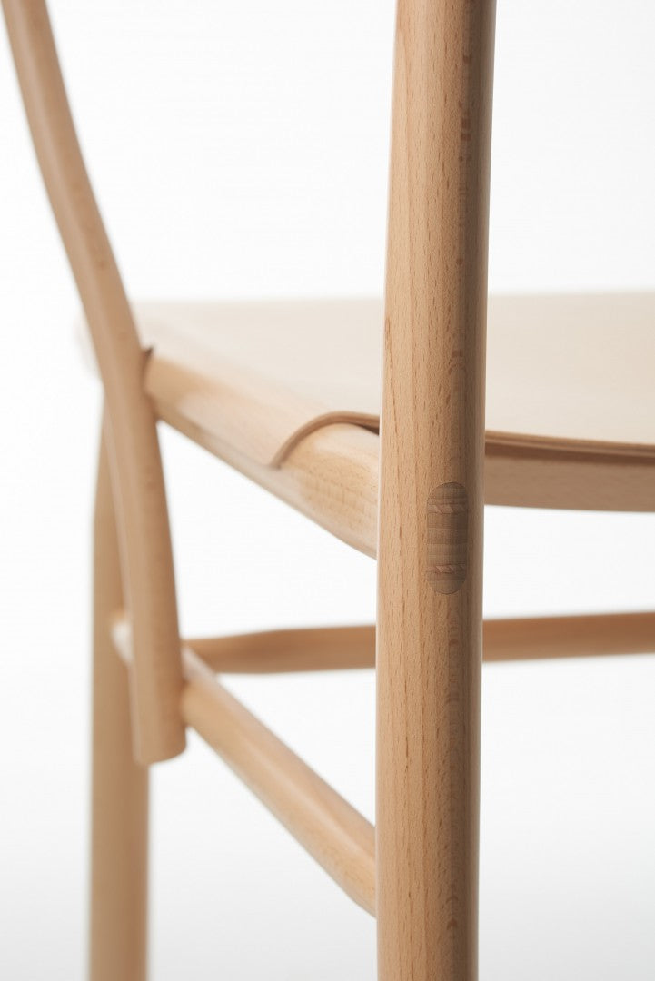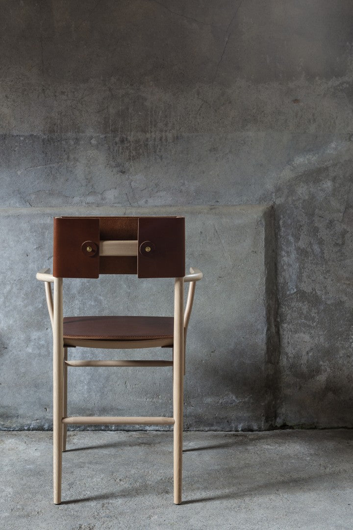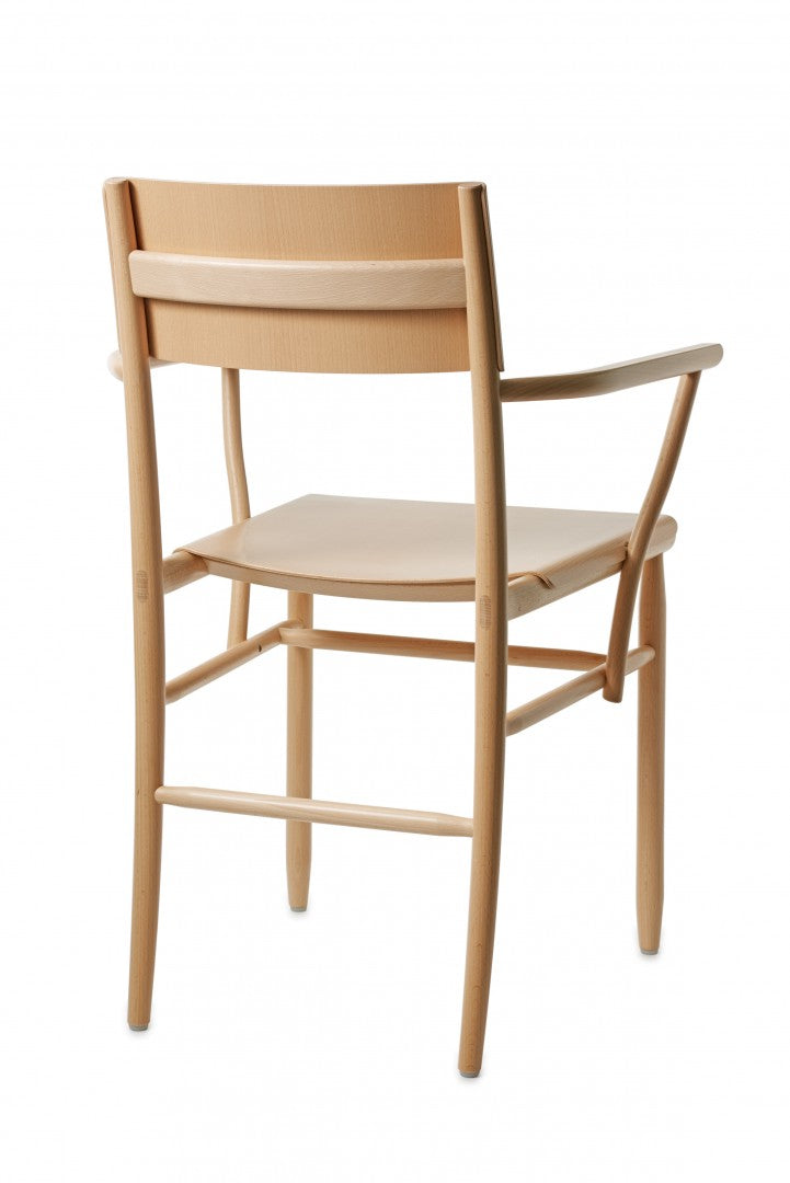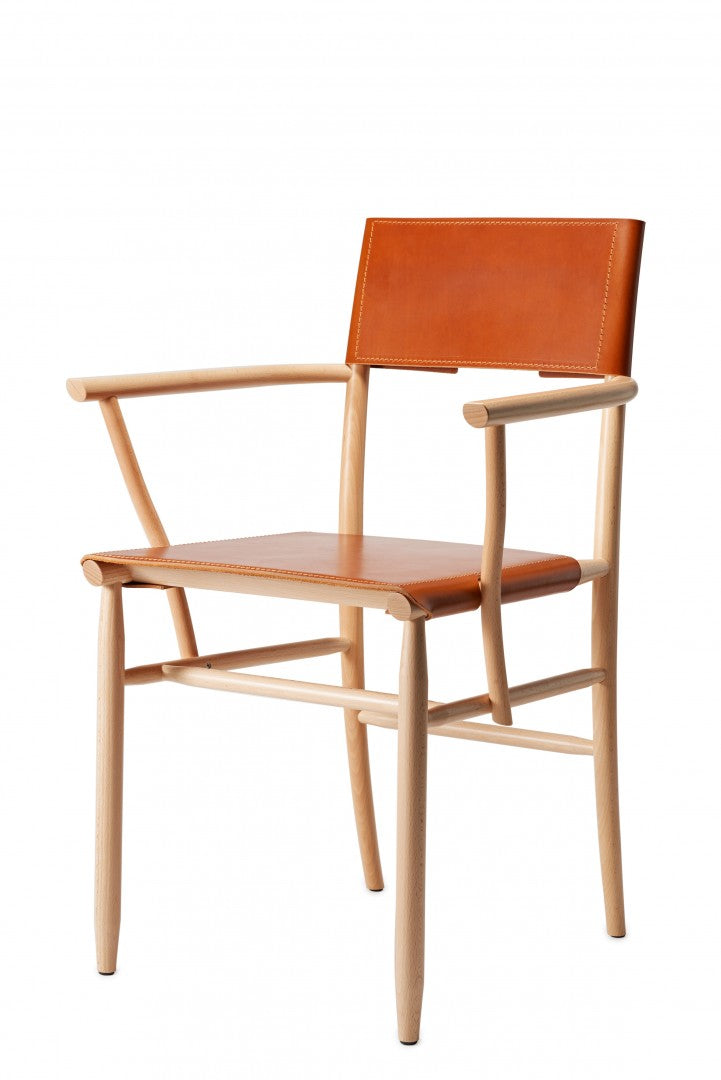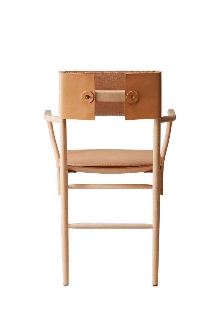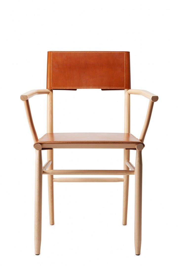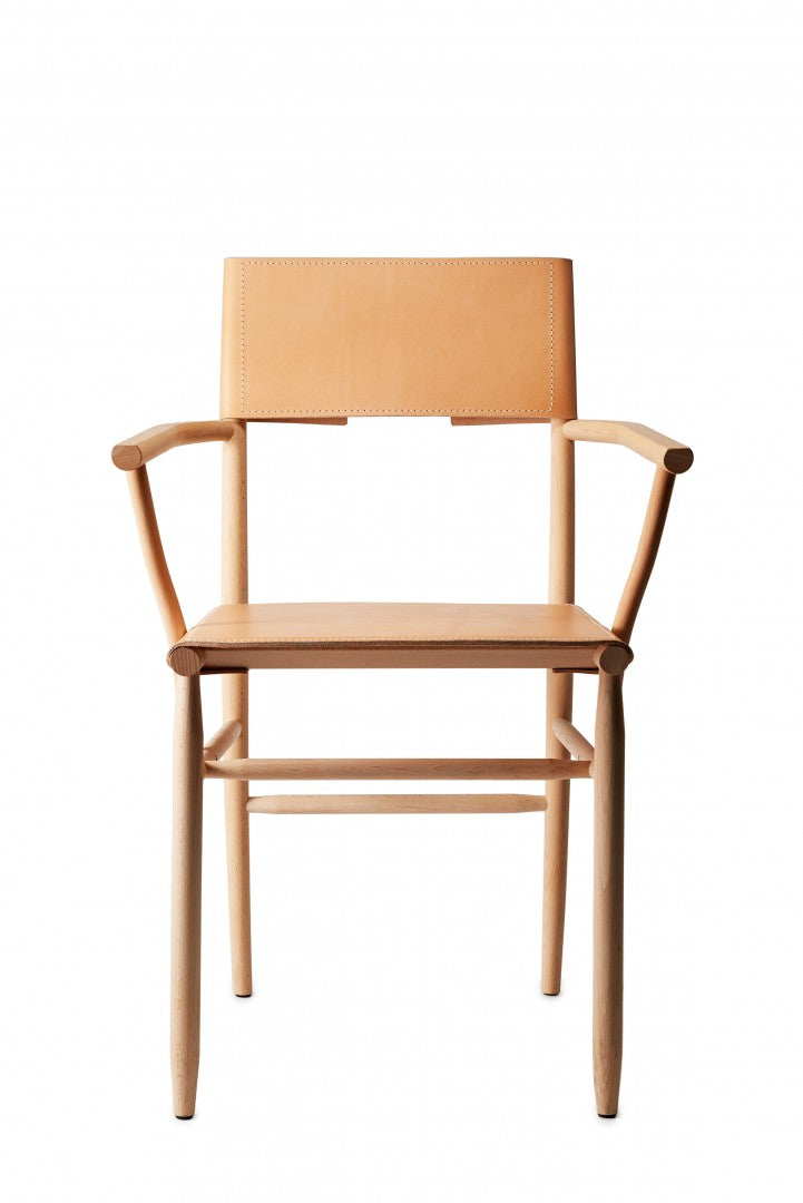 Armchair in solid beech. Seat and backrest in beech veneer or upholstered in vegetable tanned leather from Tärnsjö. Thread tone-on-tone matching leather. Plastic glides.