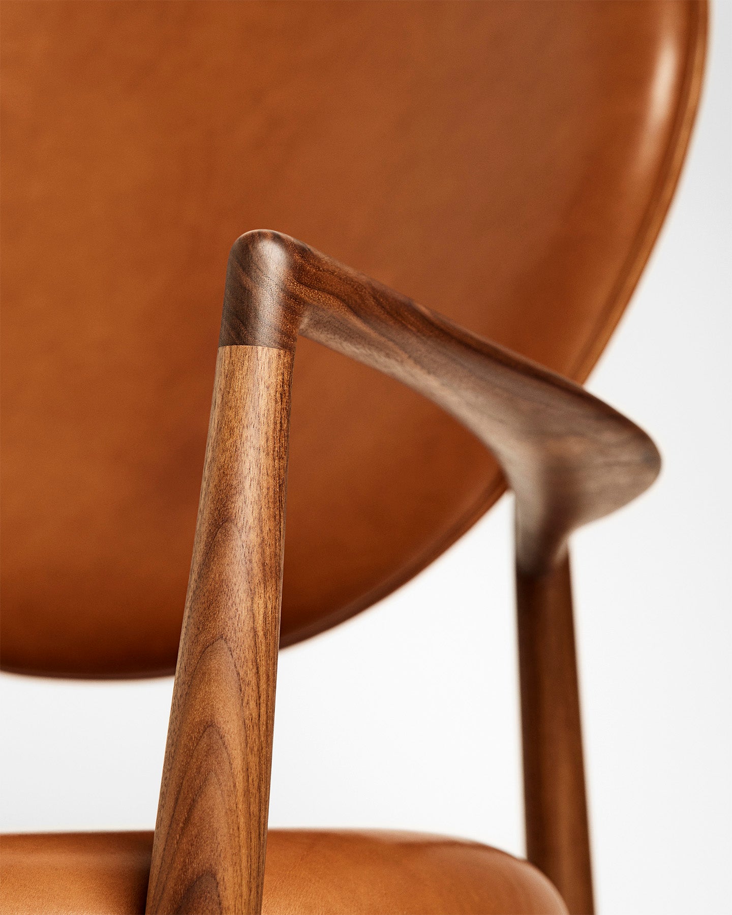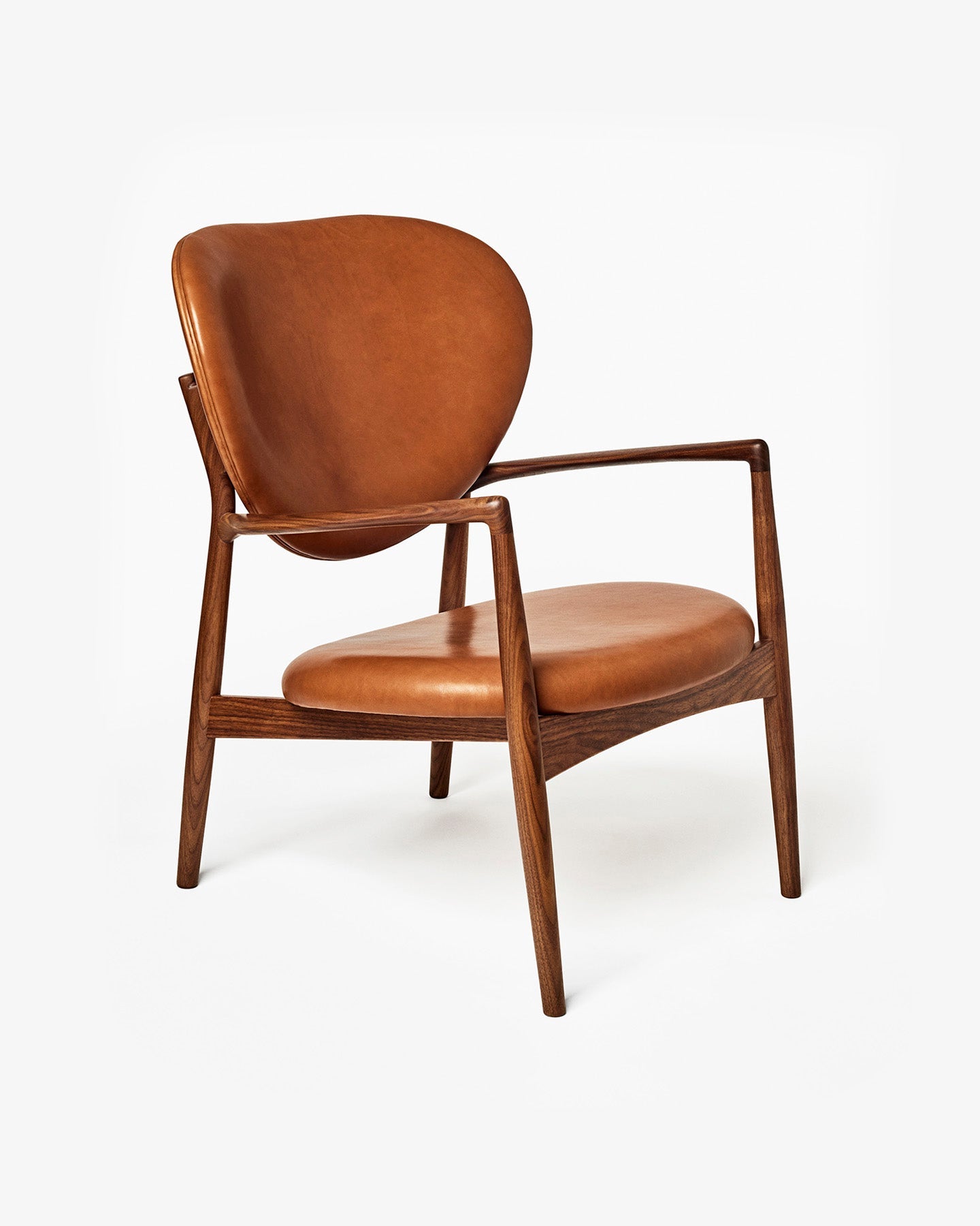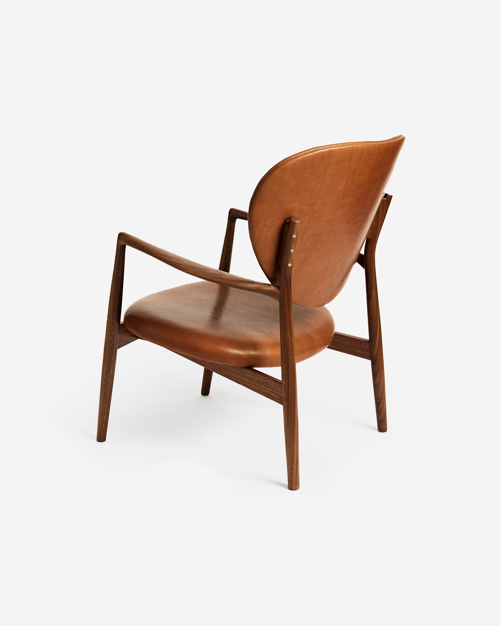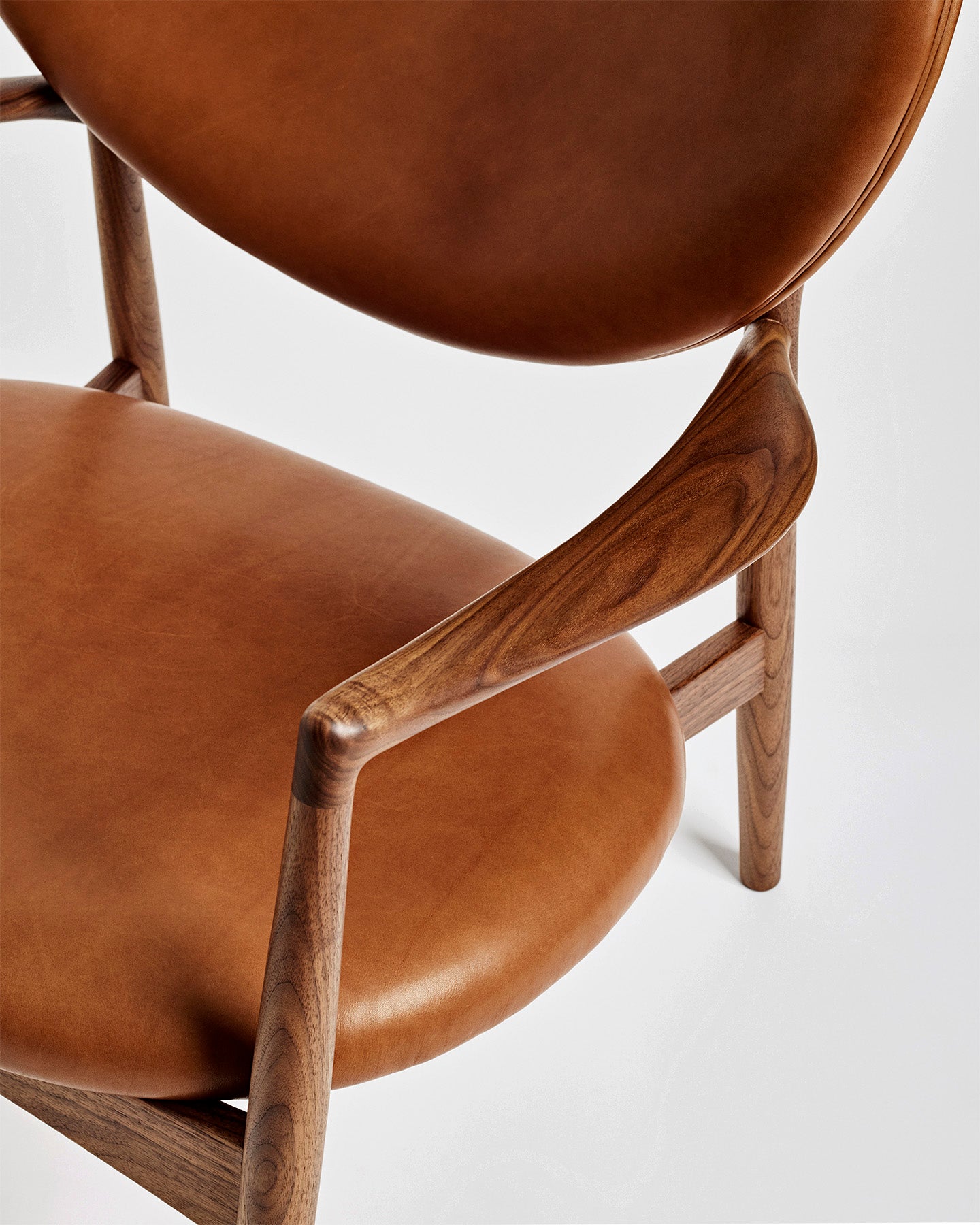 Now exclusively reissued by Dagmar as the Medallion Chair, this sculptural piece is distinguished by its blade-like arms and flowing organic curves. Available in Walnut or Oiled Oak, and upholstered in Cognac brown aniline leather.